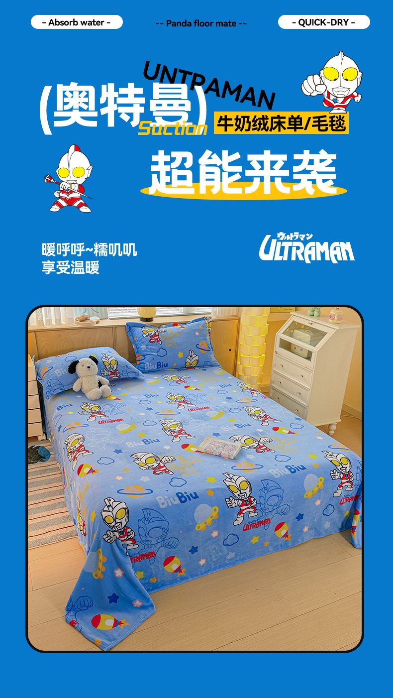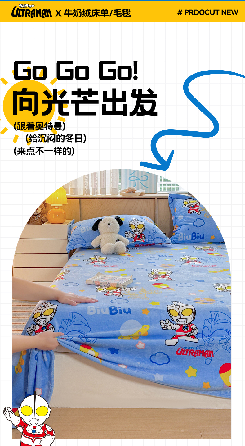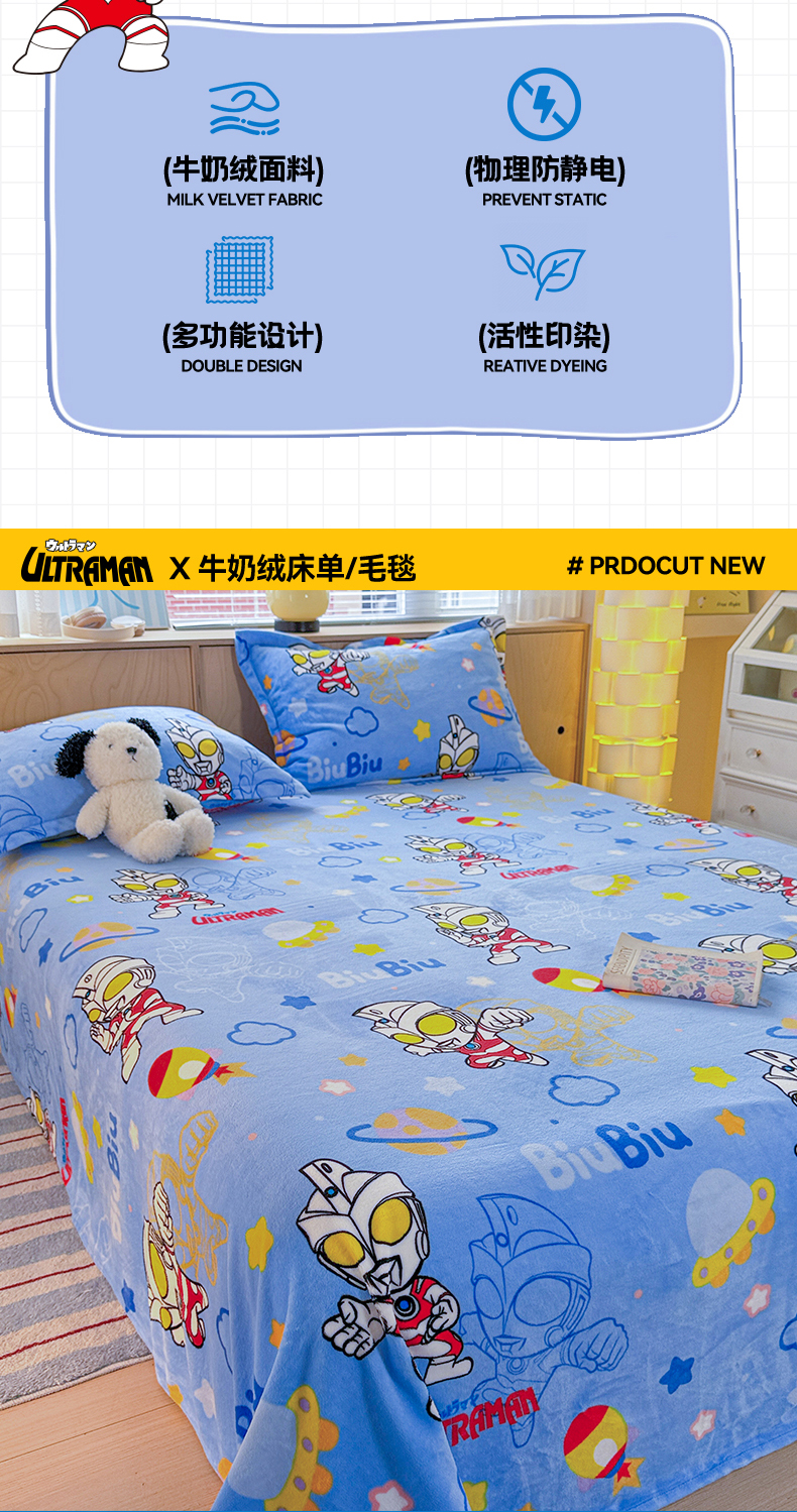 • 91家纺网 家纺一手货源 找家纺 名兮家居 2025新款经典奥特曼-三丽鸥高克重牛奶绒床单 闪电艾斯