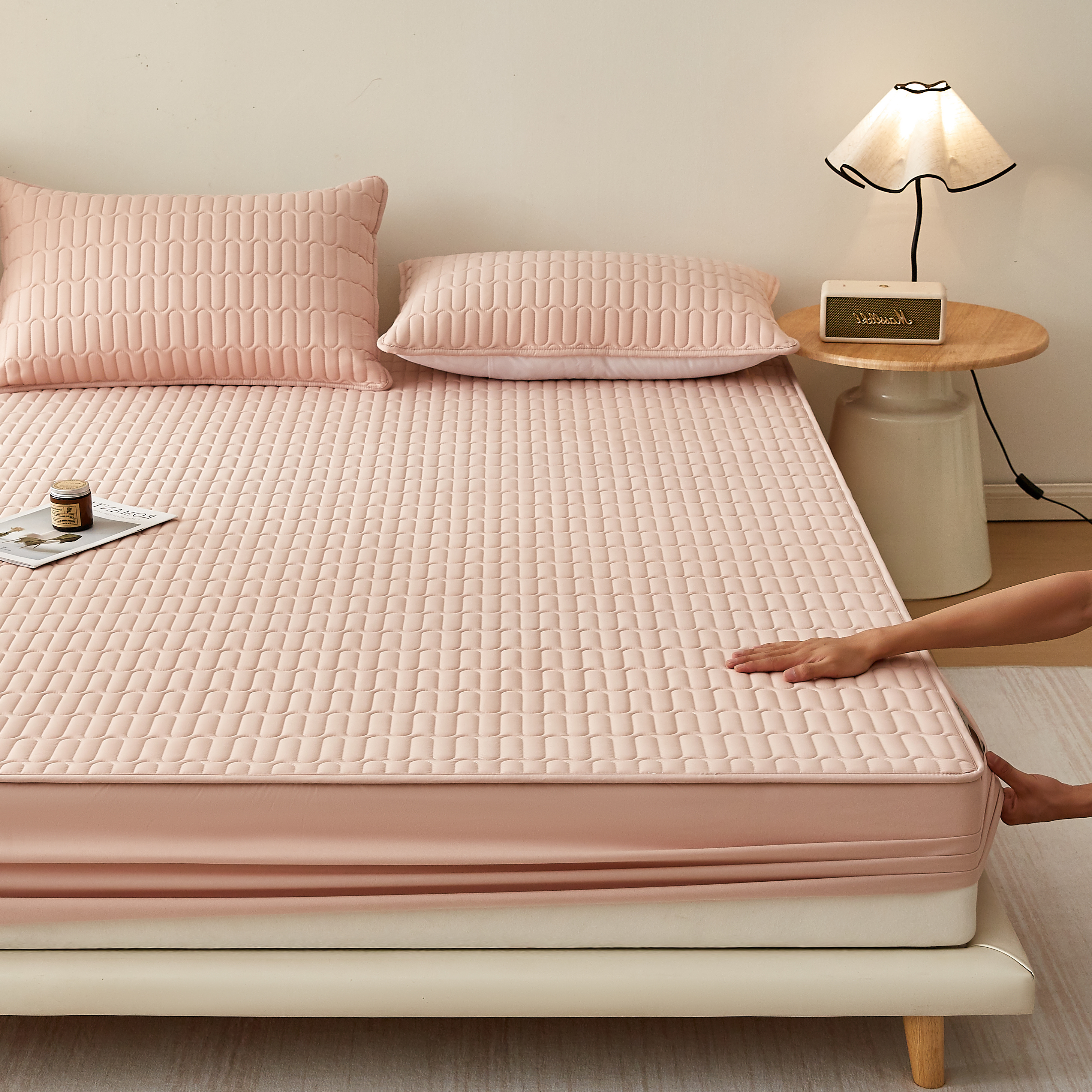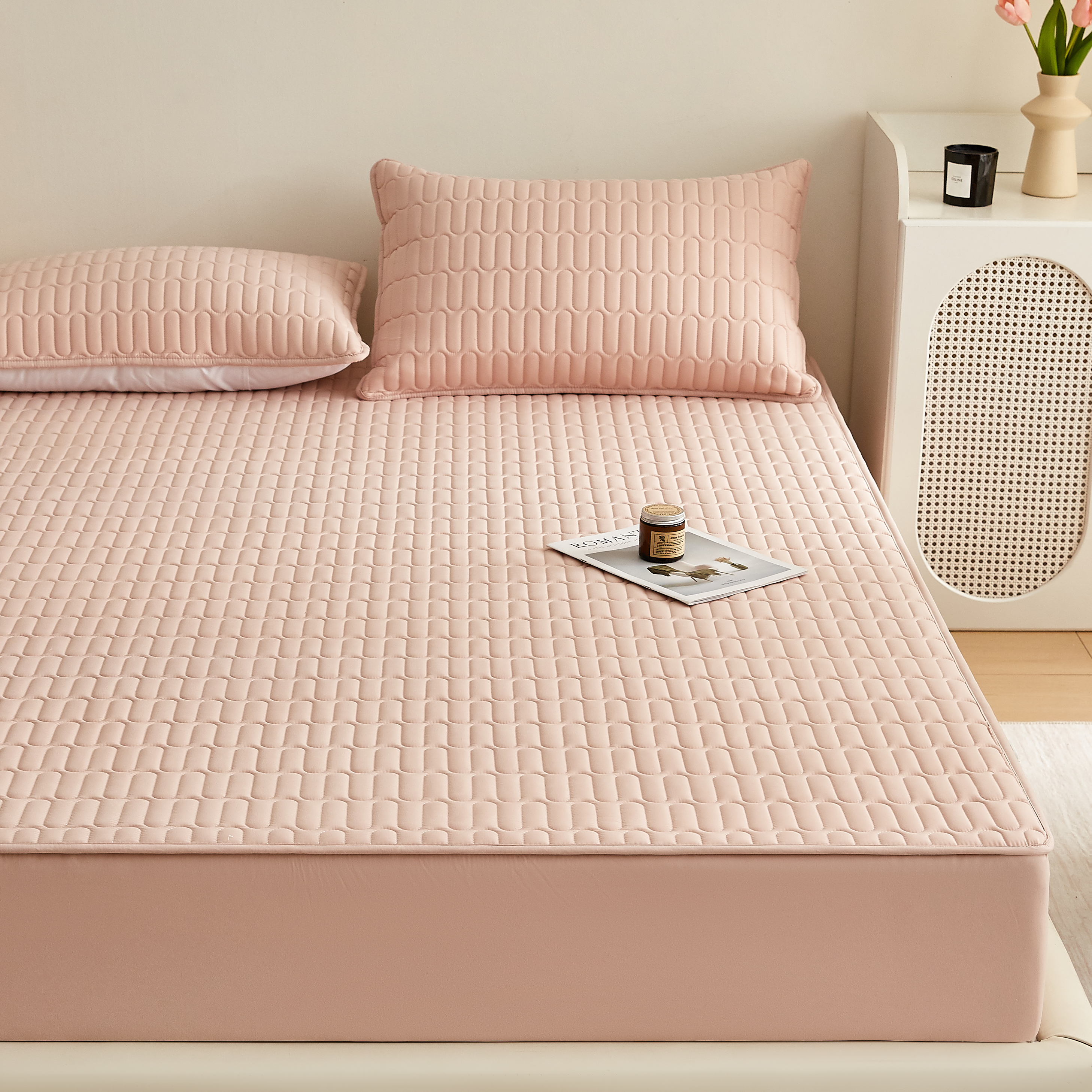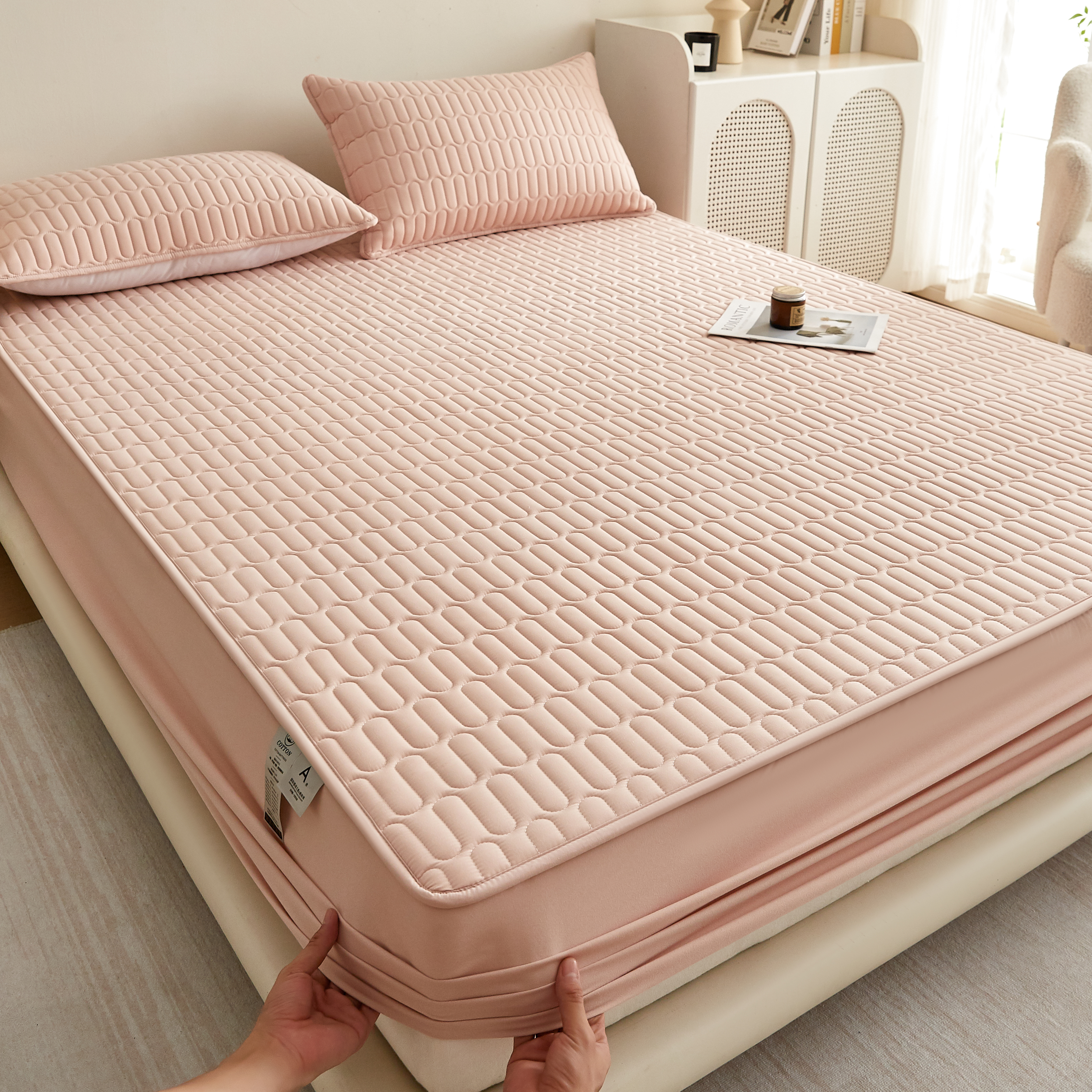 • 91家纺网 家纺一手货源 找家纺 蕾诺家纺 2025新款 菱格水洗棉亲肤棉夹棉床笠 菱格-玉粉