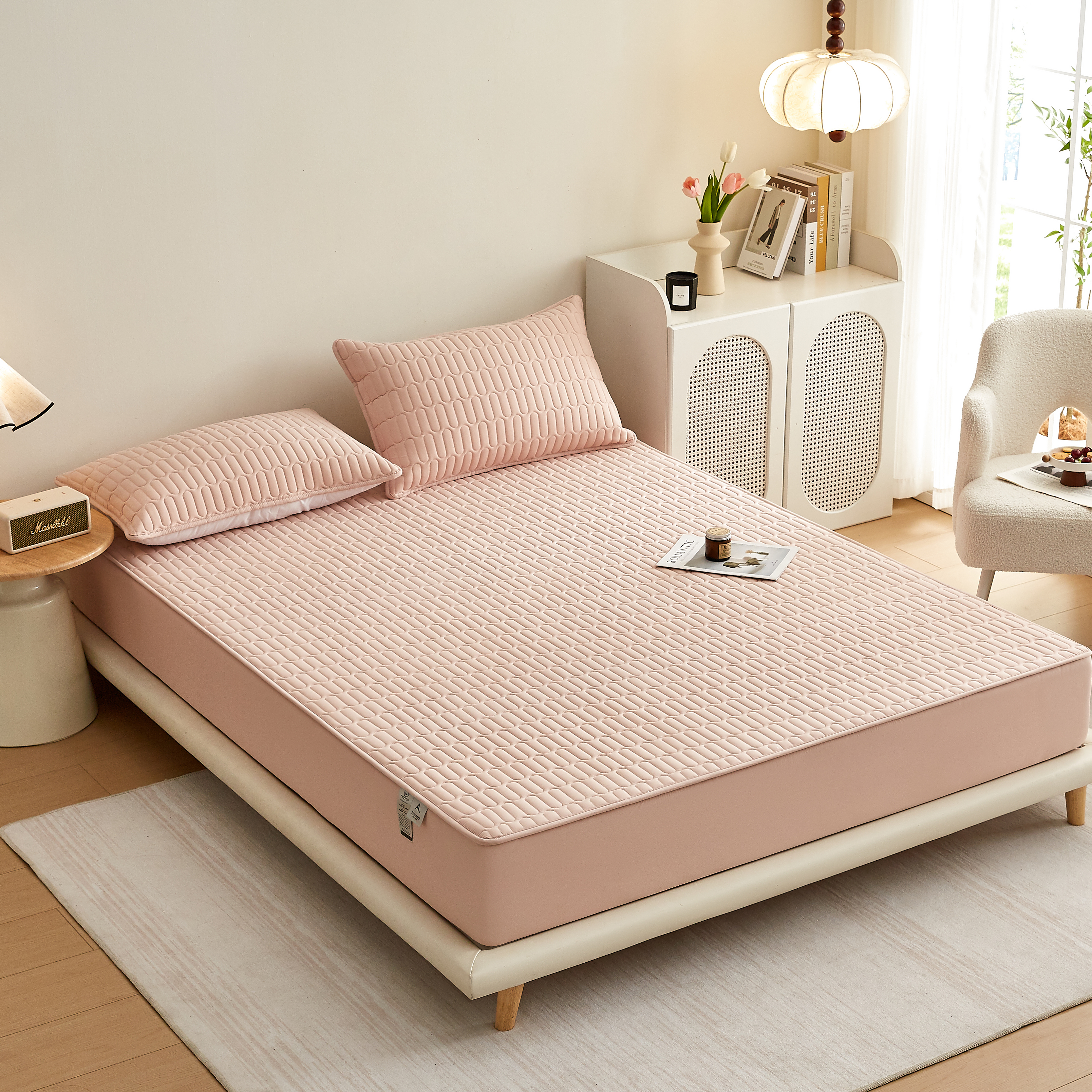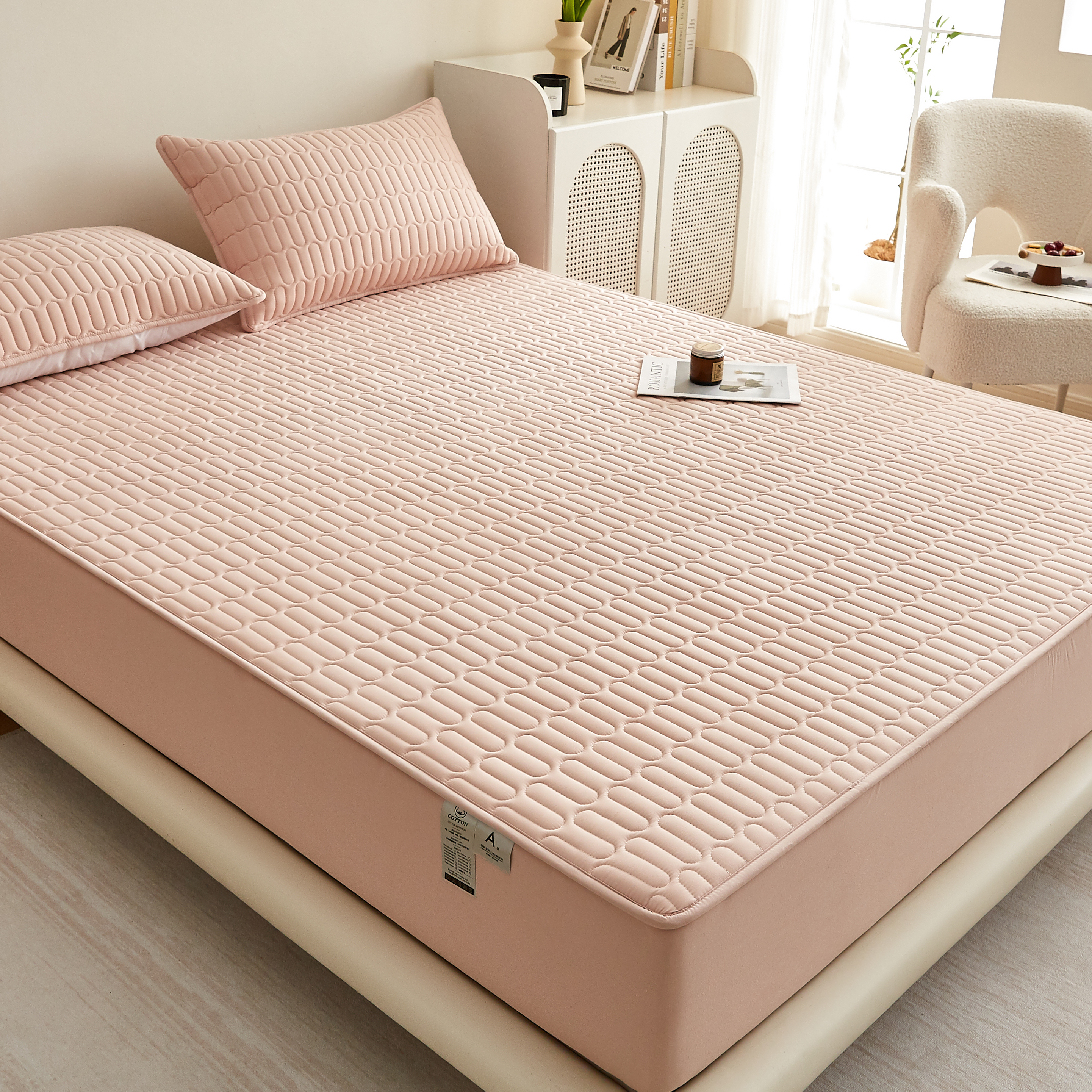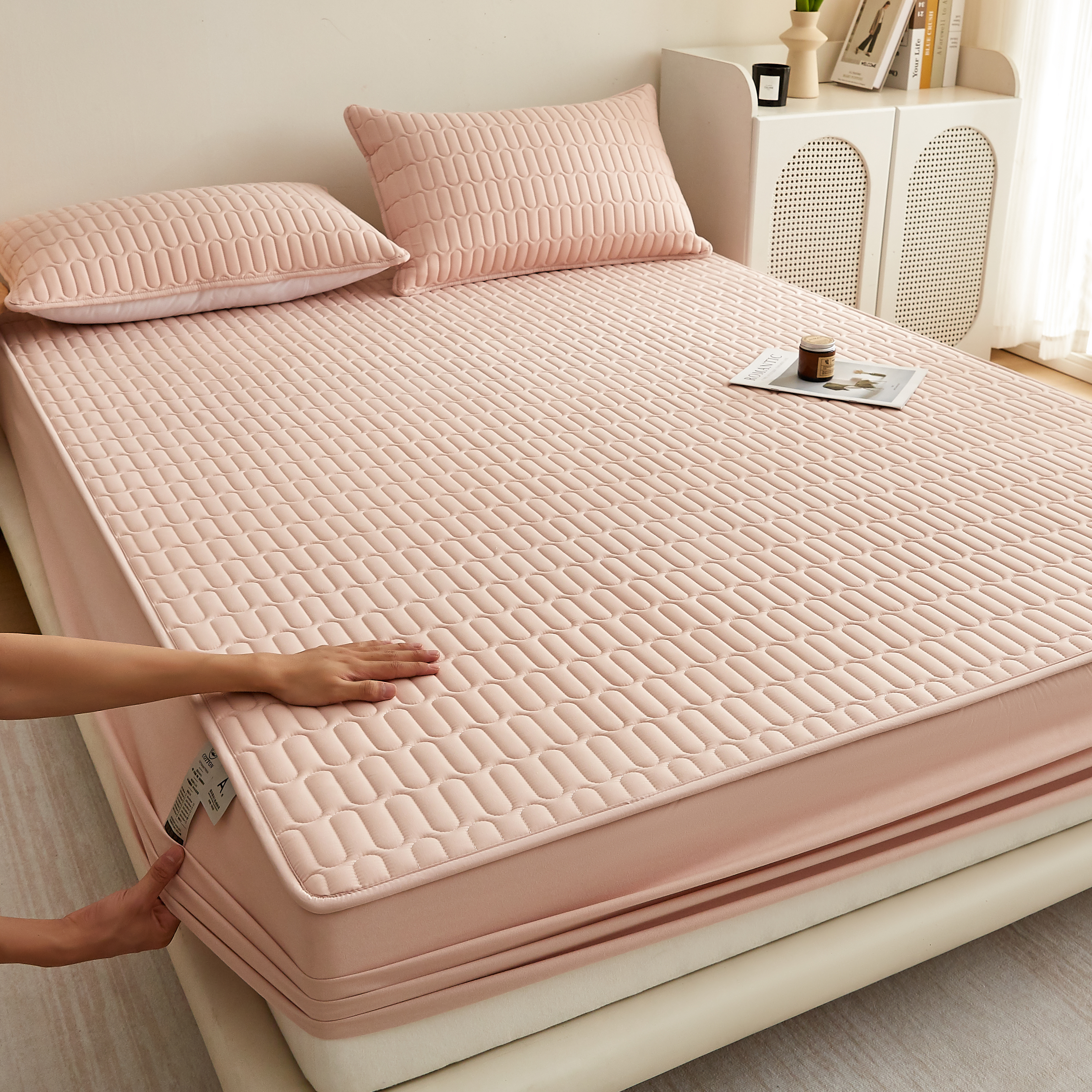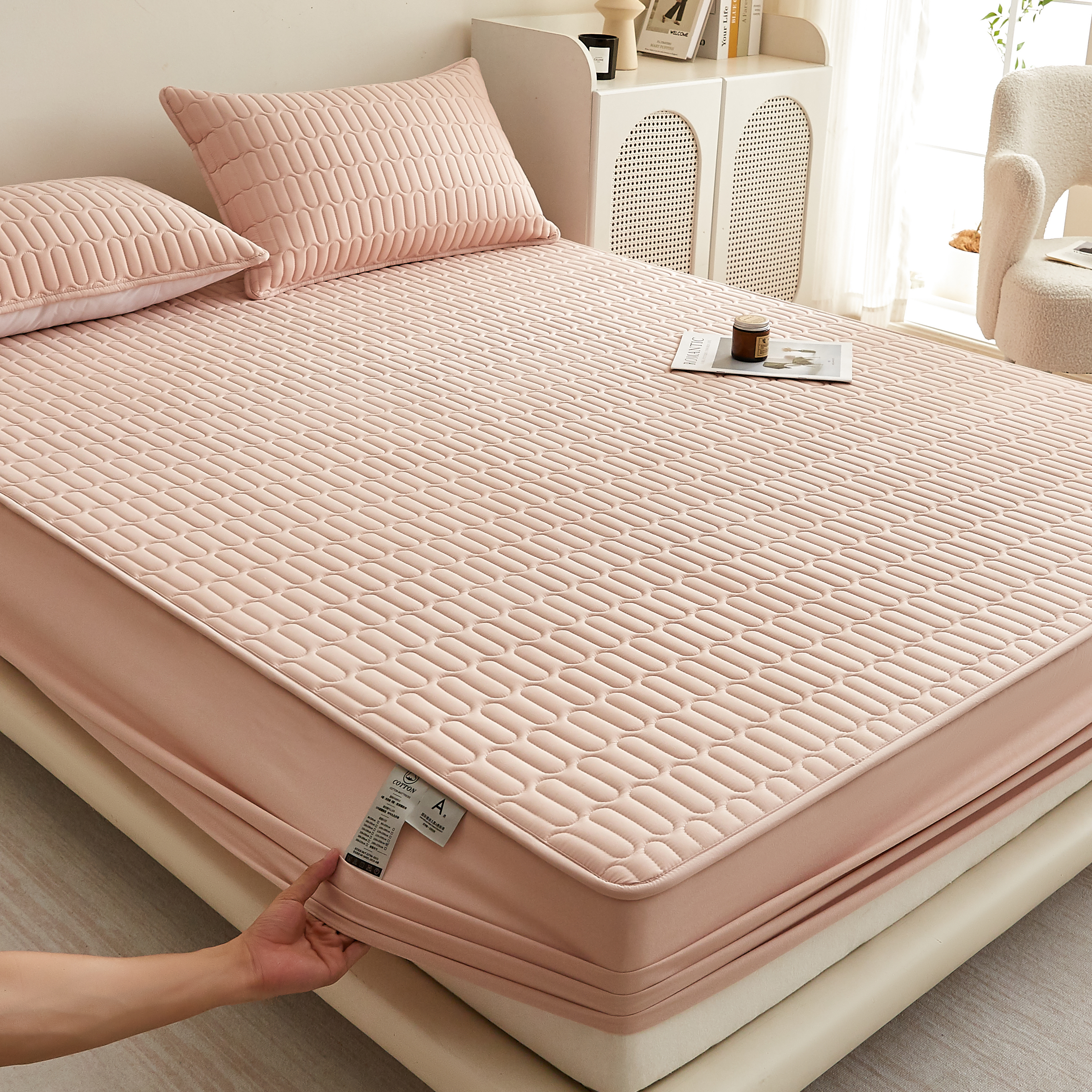 • 91家纺网 家纺一手货源 找家纺 蕾诺家纺 2025新款 菱格水洗棉亲肤棉夹棉床笠 菱格-玉粉