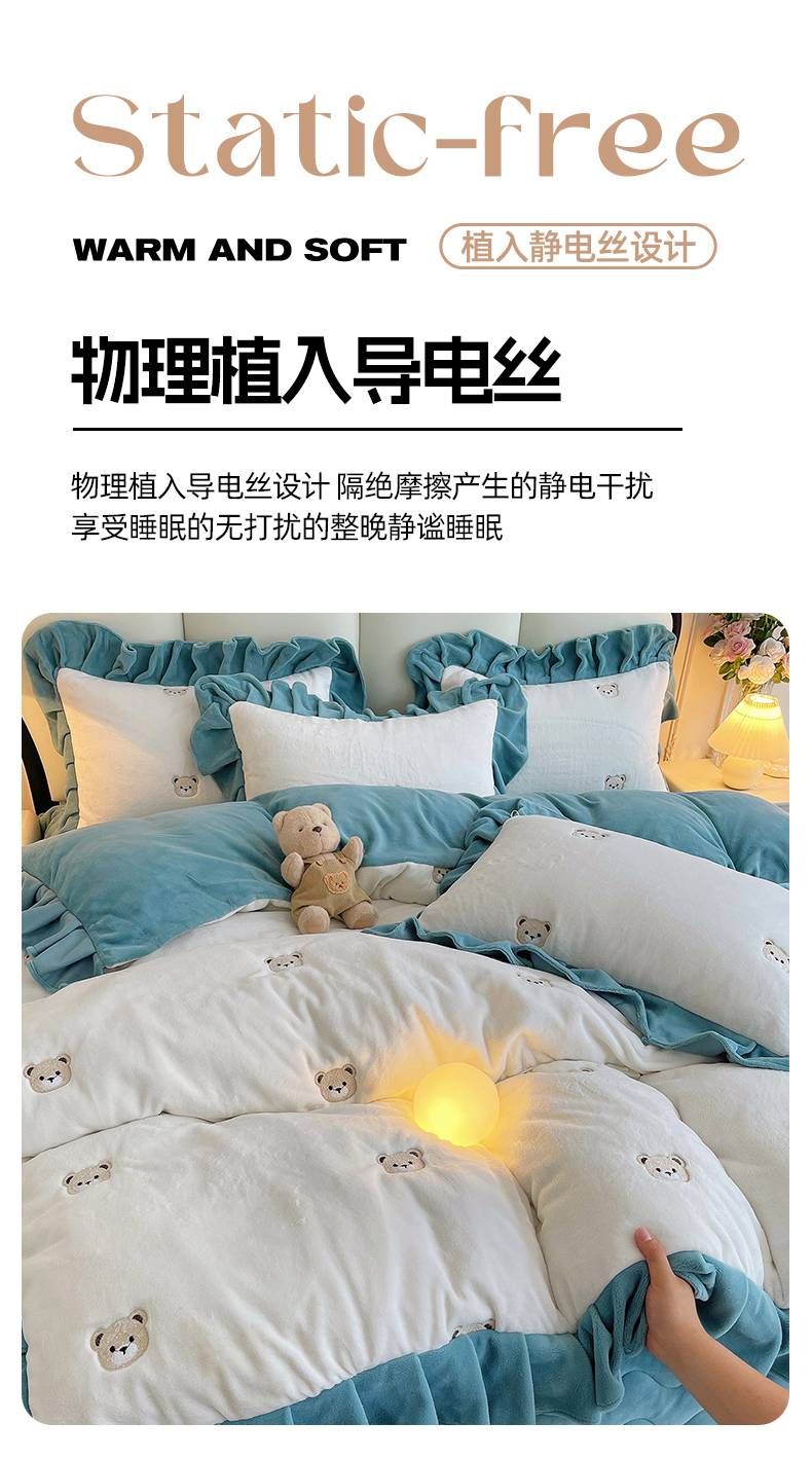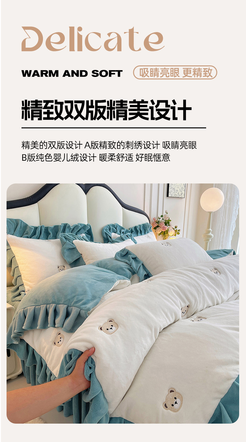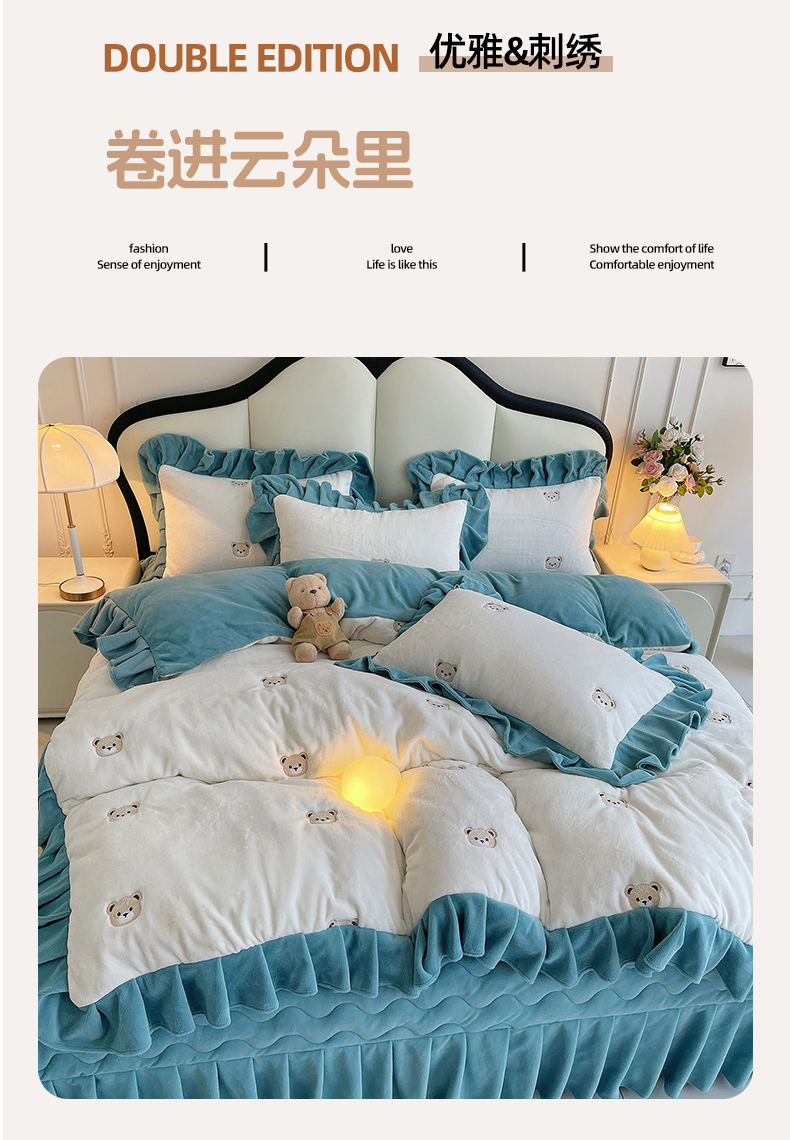 商品名称:茉保家纺 2025新款高克重9.5斤婴儿绒牛奶绒绣花夹棉床盖四件套 小熊-白拼蓝