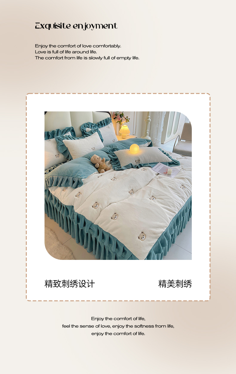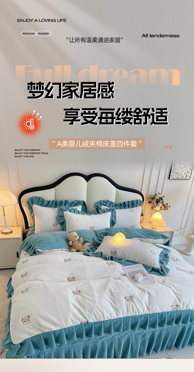 茉保家纺 2025新款高克重9.5斤婴儿绒牛奶绒绣花夹棉床盖四件套 小熊-白拼蓝