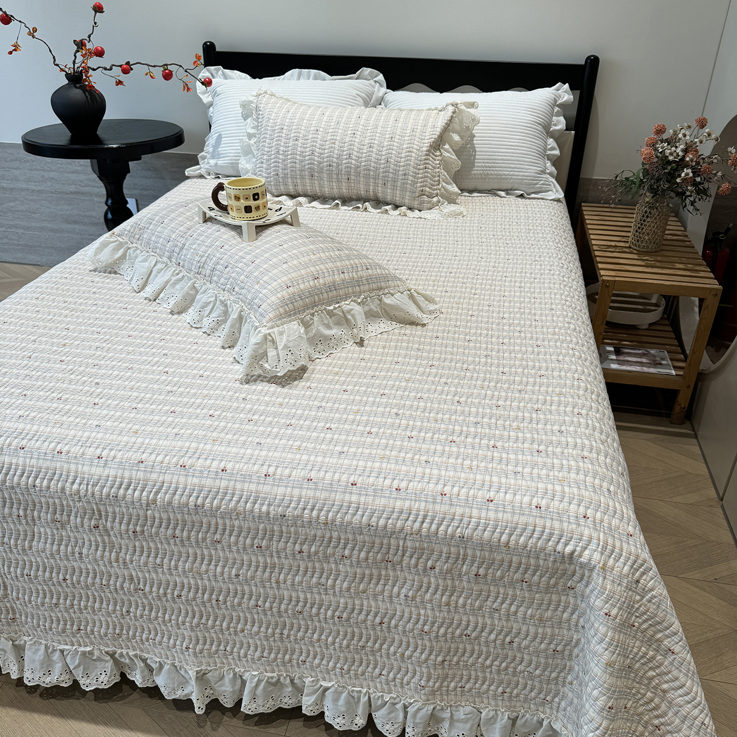 (总)莱豫家纺 2025春夏新款纯棉全棉花边款床盖三件套,呆呆熊,组合图仅供参考,花语绿,花语紫,柠檬,蔷薇,西瓜兔,夏蓝,夏梦,夏之语,小花熊,樱花
