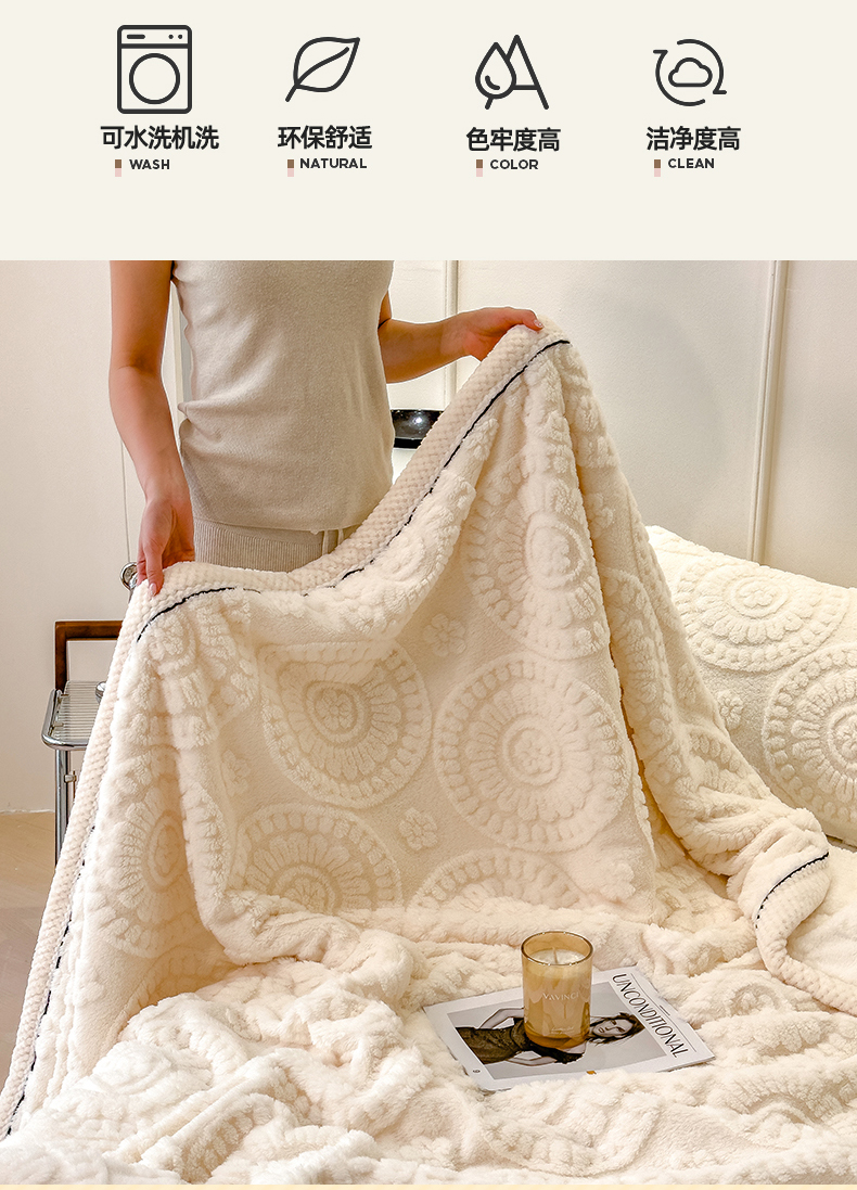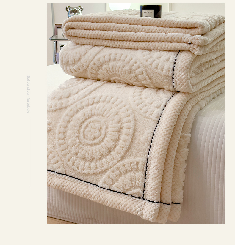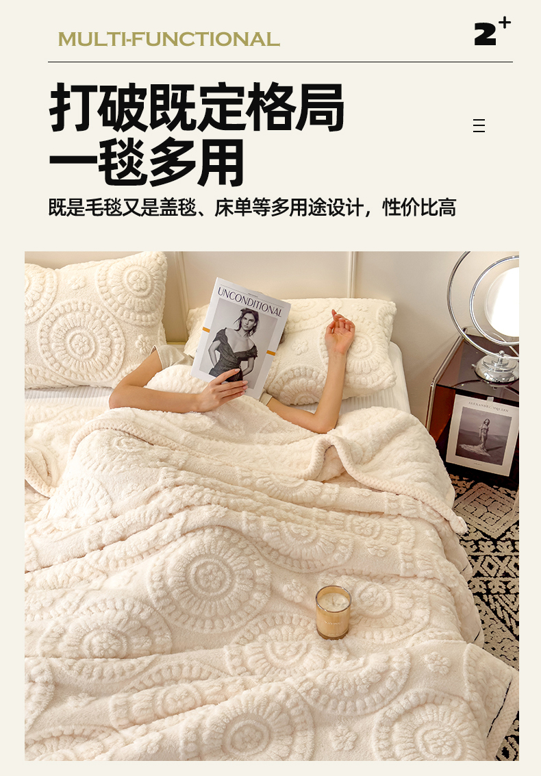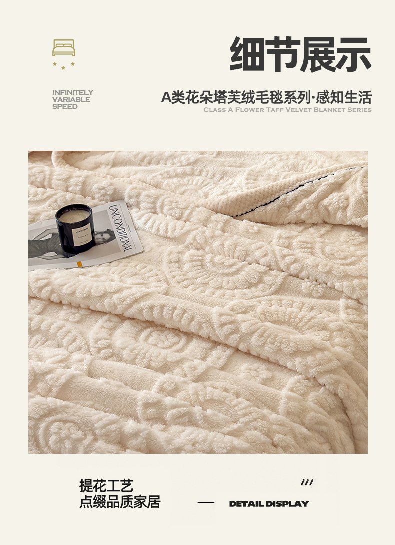 莱家富 2026新款新款A类塔芙绒雕花双面毛毯毯子-花朵(可提供跨境压缩) 花朵-奶白
