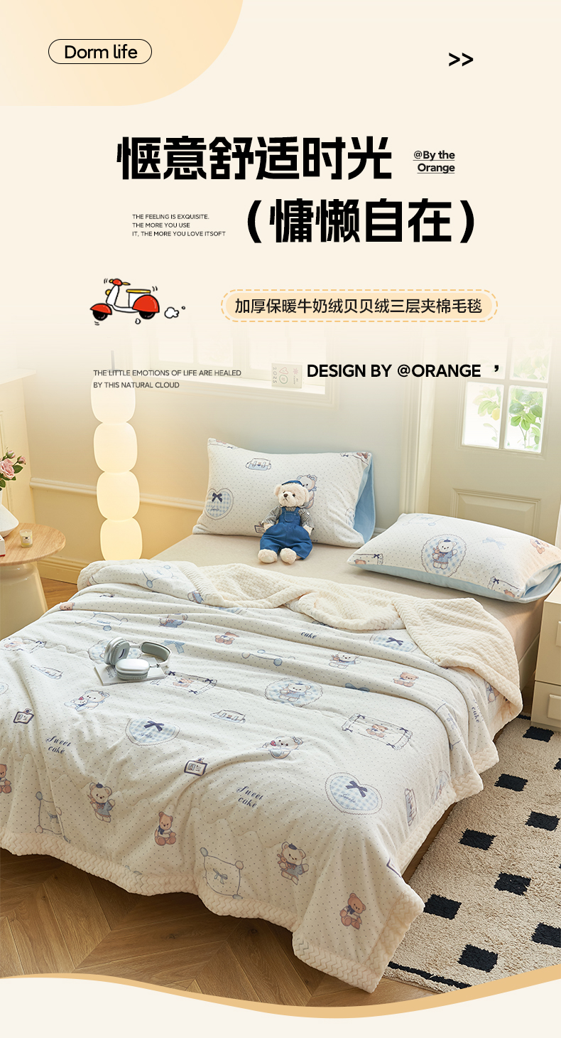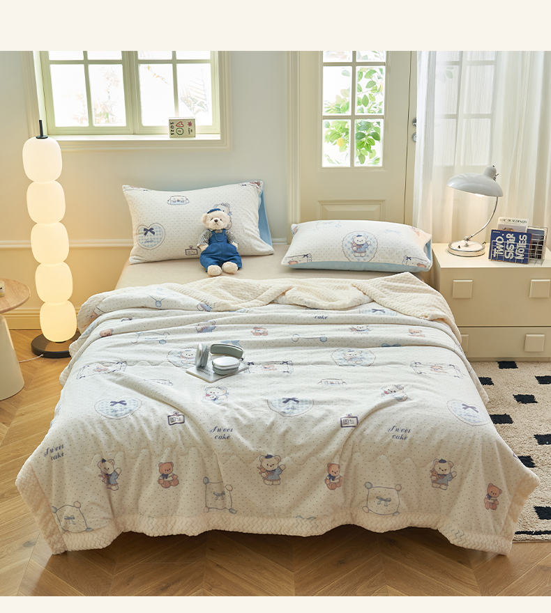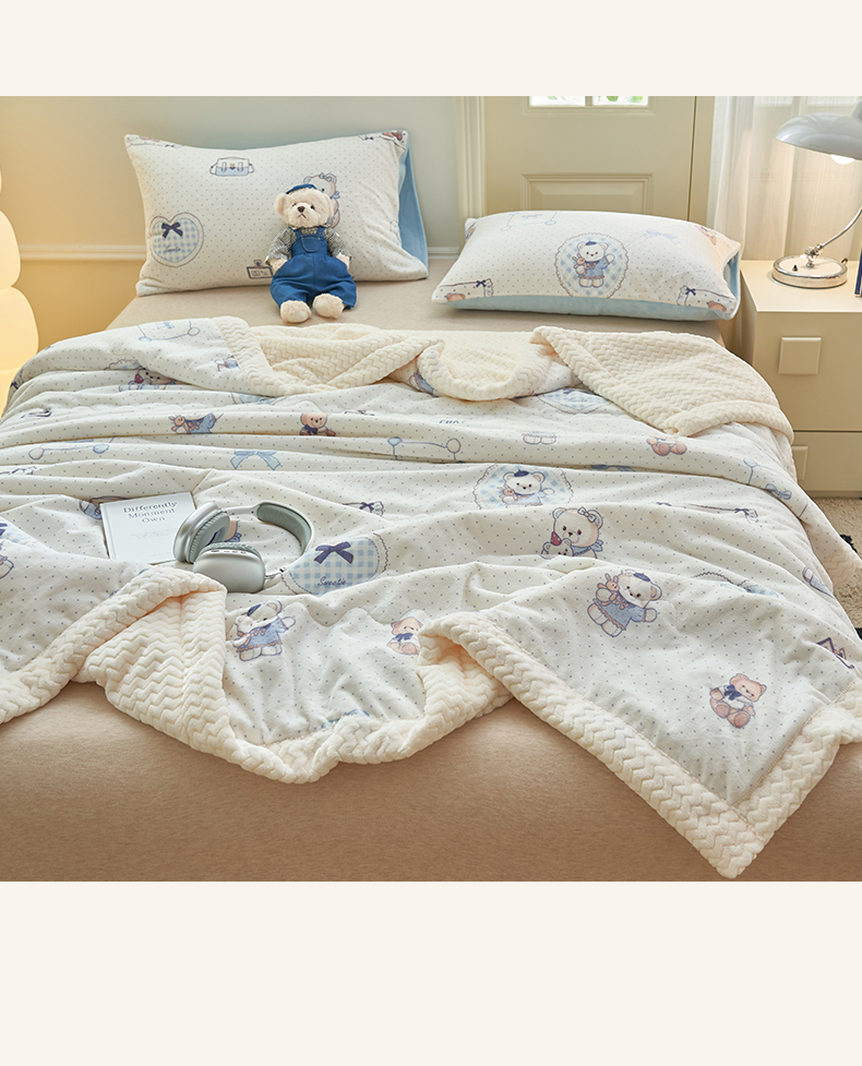 晨曦家纺 2025新款加厚保暖牛奶绒贝贝绒三层夹棉毛毯可爱卡通 萌萌熊仔