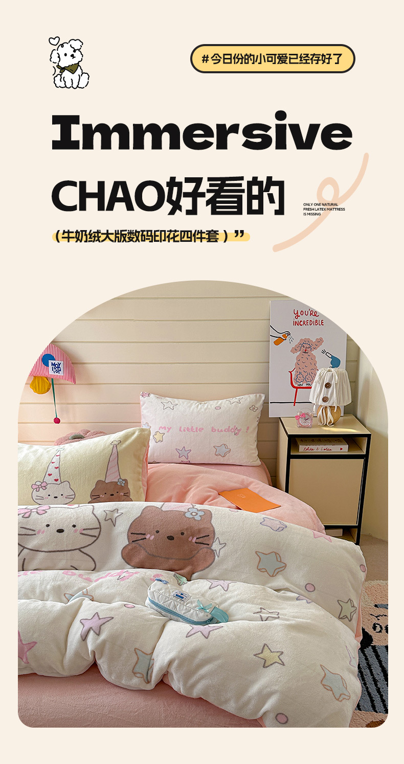 (总)美乐迪家纺 2025新款高品质大版牛奶绒四件套,波点小猫,波点小熊,大脸猫,费尔岛猫猫,费尔岛小熊,星星男孩