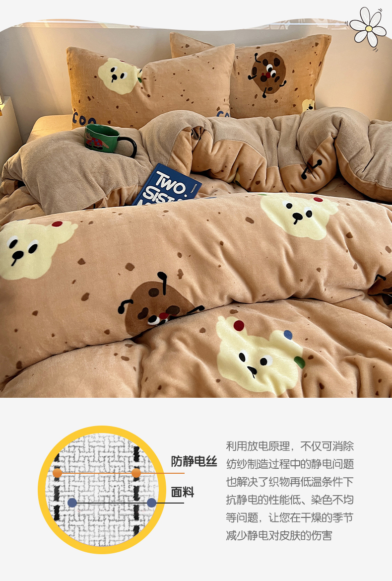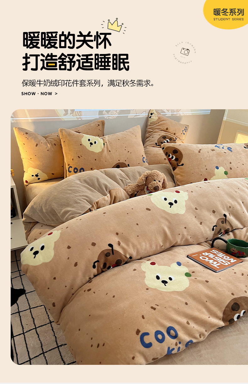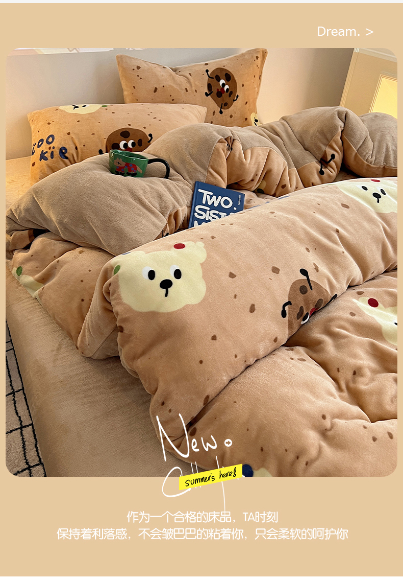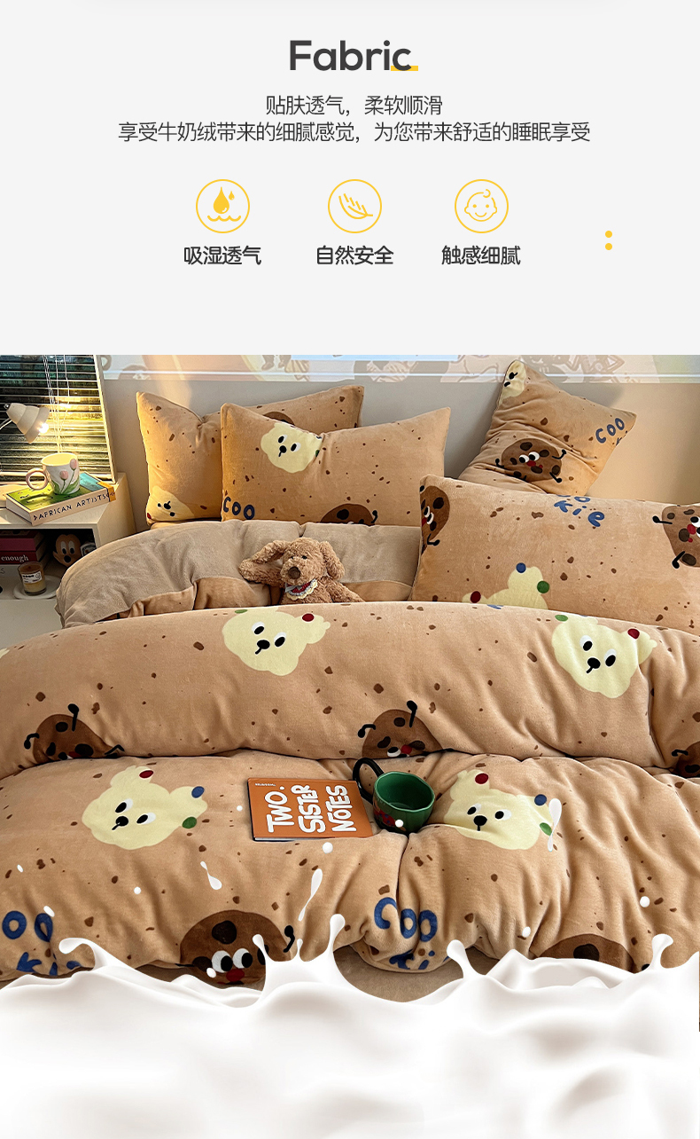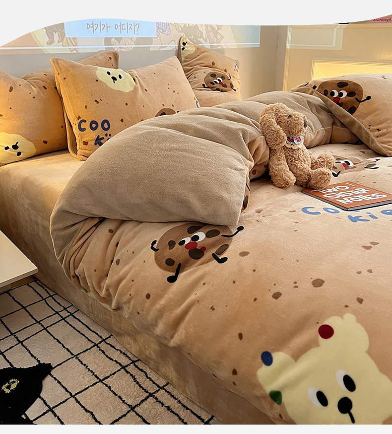 商品名称:瑞莱 2025新款A类200克高克重秋冬印花牛奶绒四件套-卡通系列 巧克力曲奇
