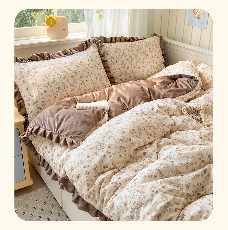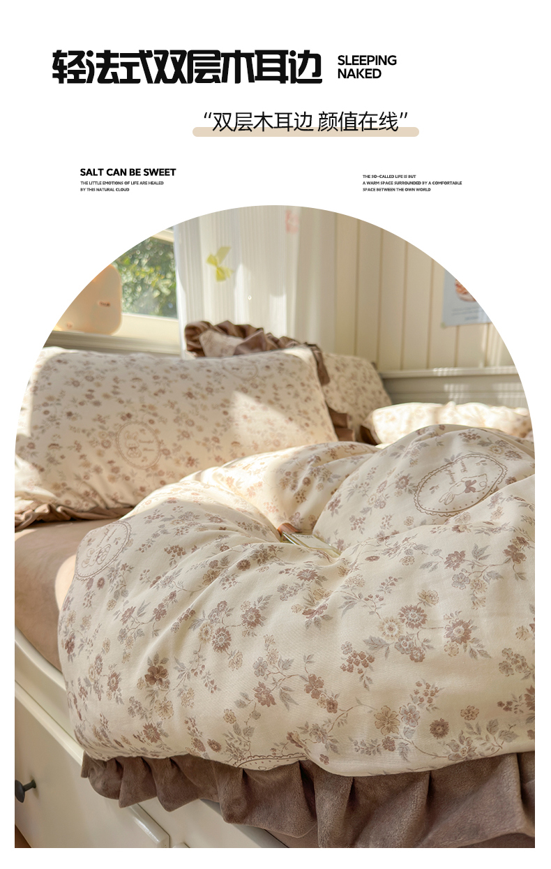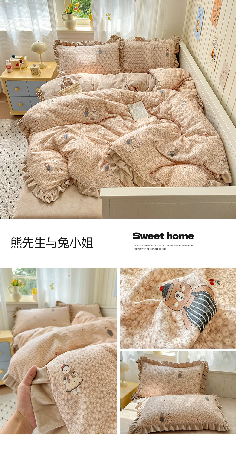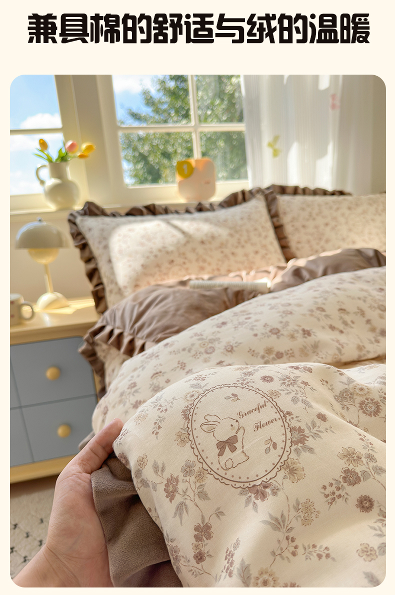 当前位置: 91家纺网 > 商品网购 > 床品套件 > 四件套 > 全棉普通四件套 > 淑女公社家纺 2025秋冬新款纯棉双层纱加韩国绒四件套 花园秘兔 咖
