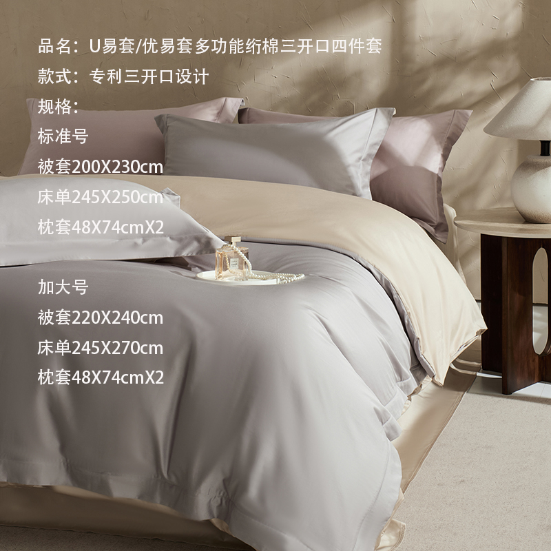 当前位置: 91家纺网 > 商品网购 > 床品套件 > 四件套 > 其它四件套 > LADYCOCO可可家居 2025新款三开口贡缎夹棉四件套 优易套/U易套 三开口被套,唯一专利发明单位,全球专利布局(控价不低于410元) 浅紫+浅灰