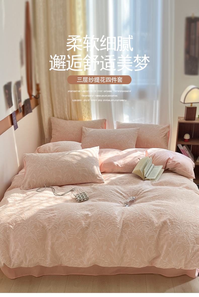 琪格格纺织 2025新款全棉A类色织三层纱提花四件套 三层纱 芳草 粉玉