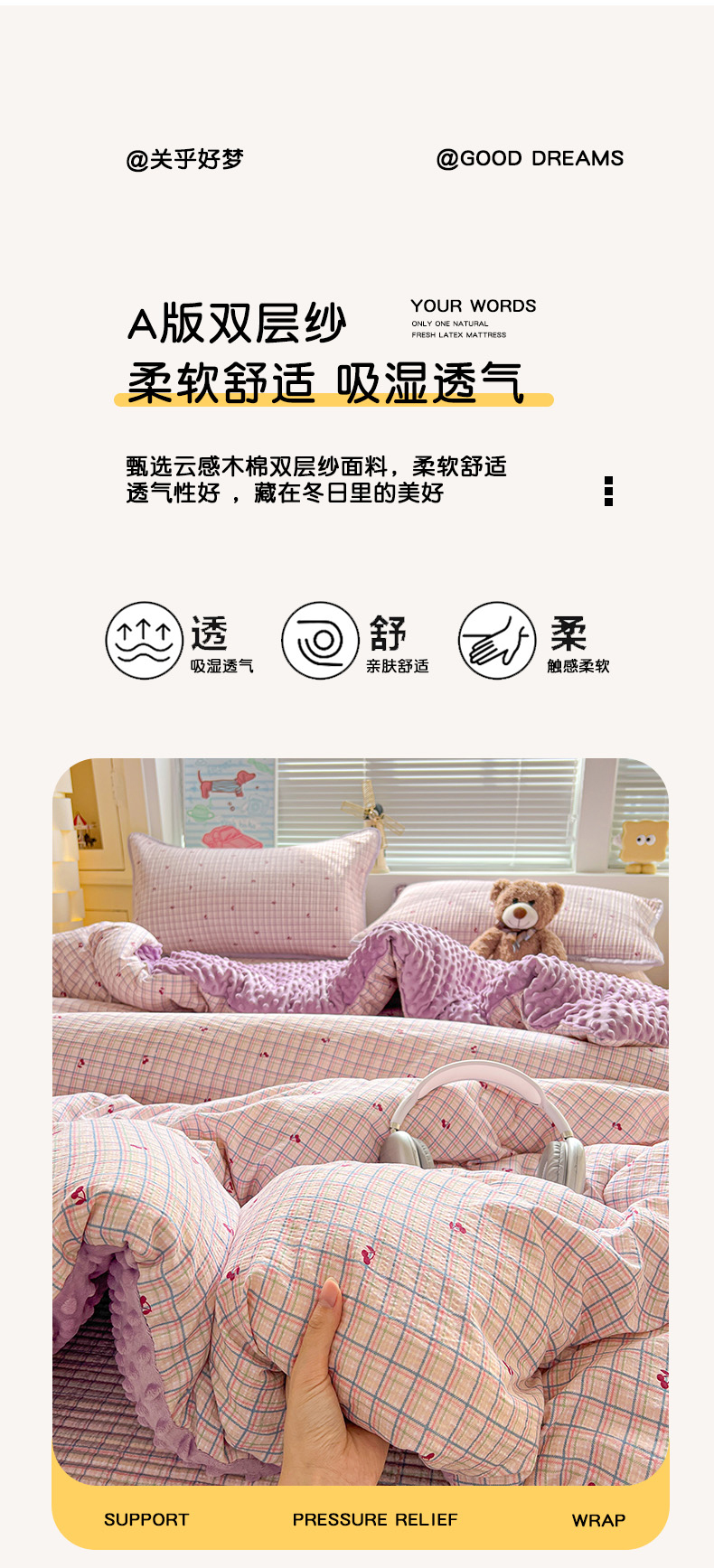 • 91家纺网 家纺一手货源 找家纺 优选 2025新款木棉双层纱ins少女心可爱加厚豆豆冬被四件套床盖三件套暖梦小红书推荐 格子樱桃