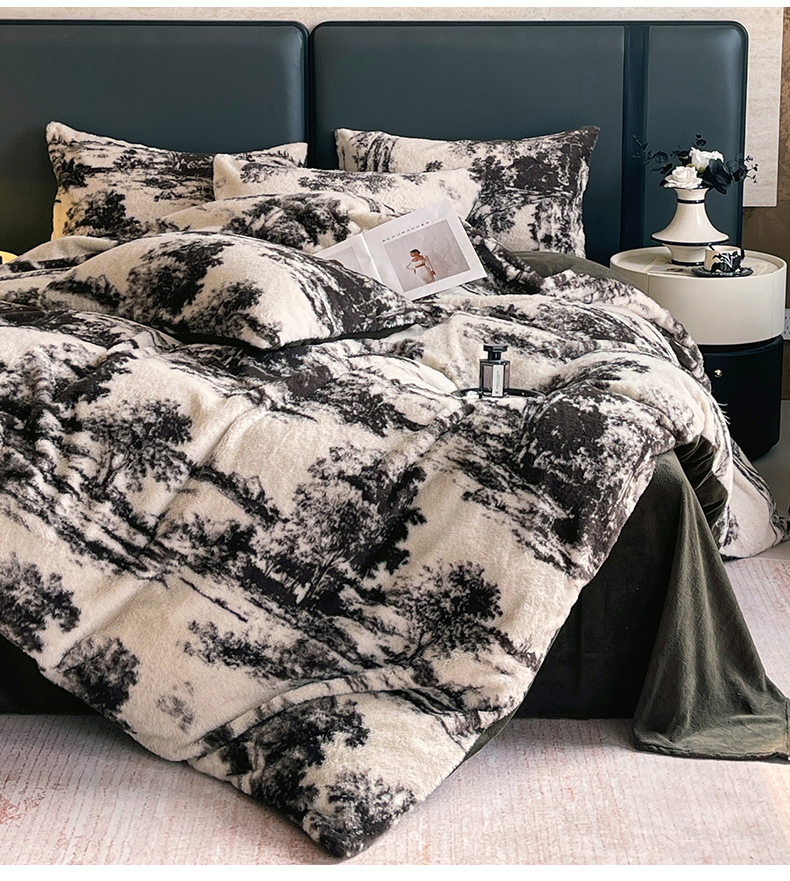 佰亿莱 2026新款印花兔毛绒双面锁温暖绒四件套 墨栖-白
