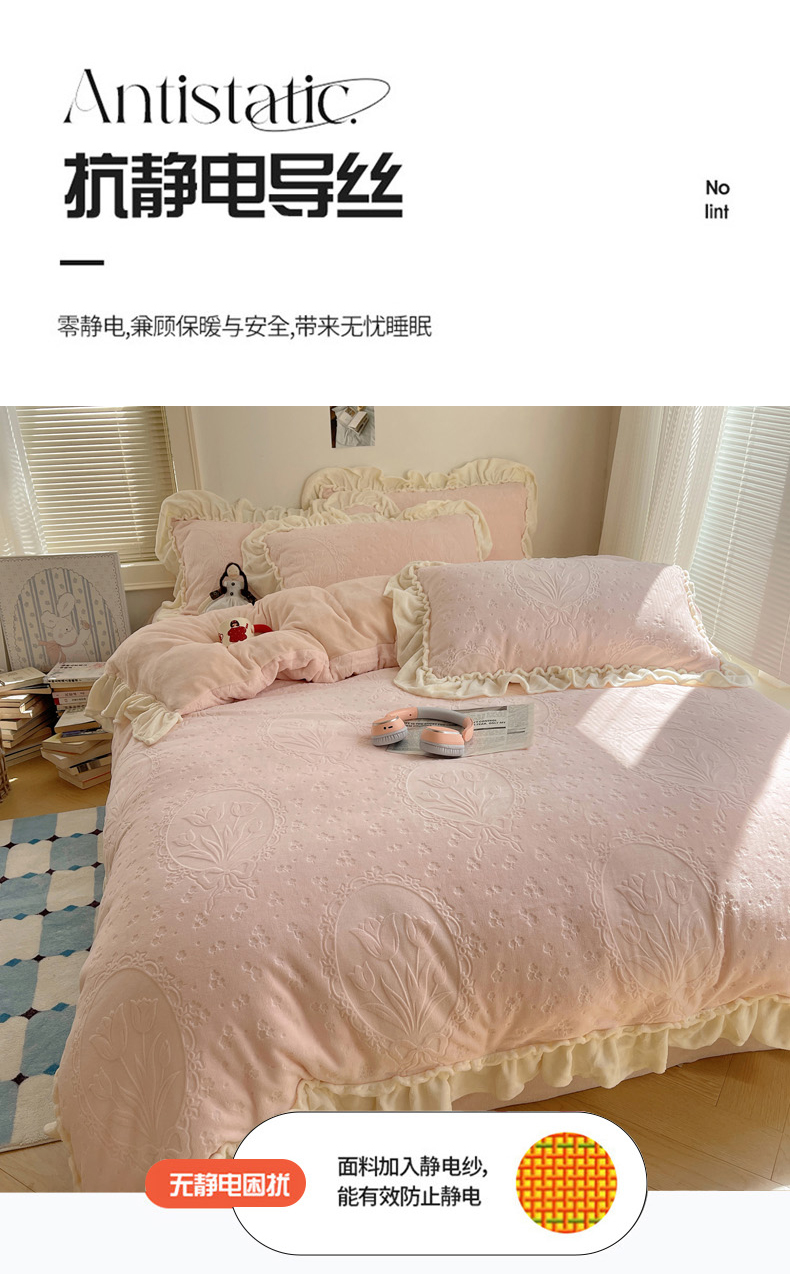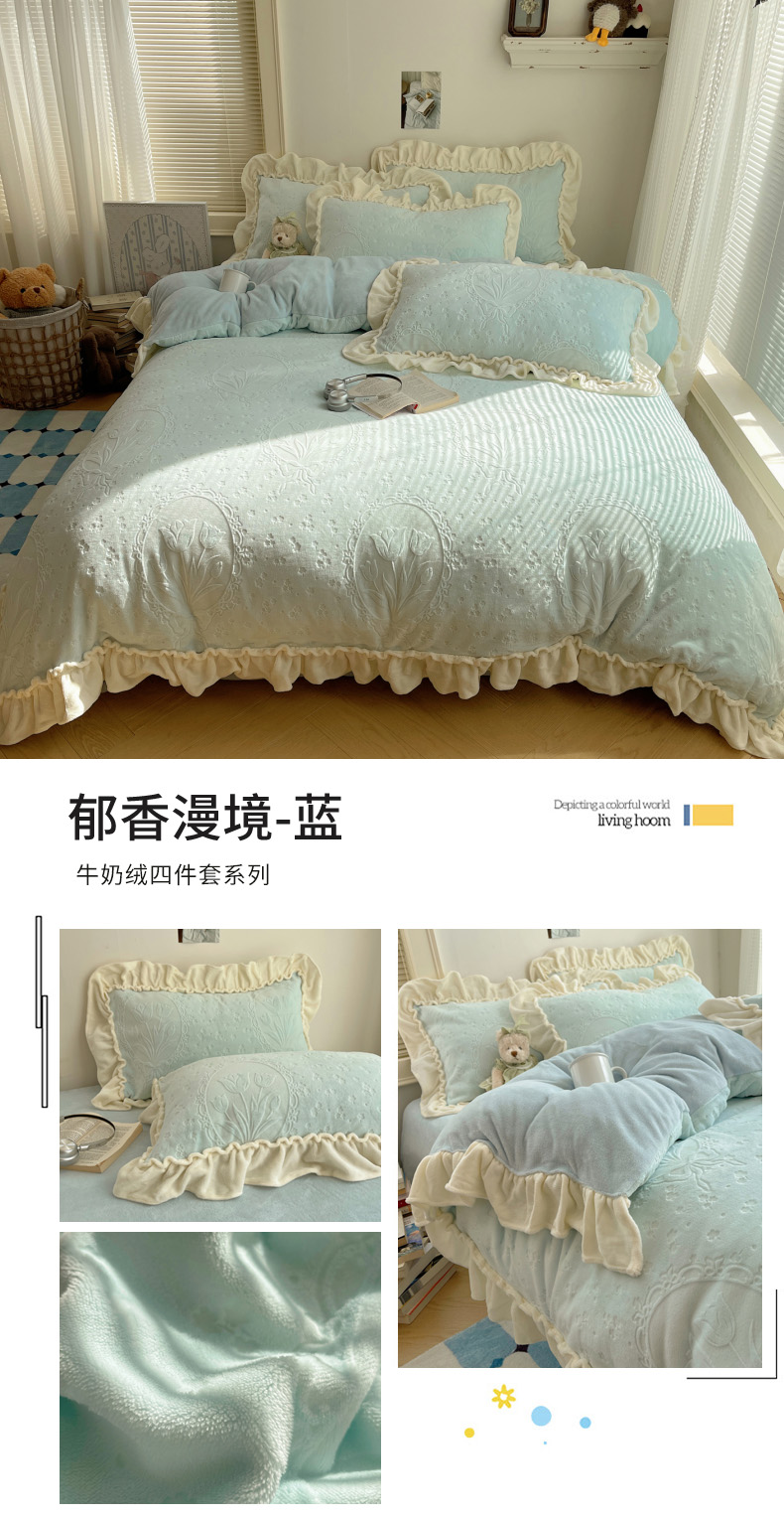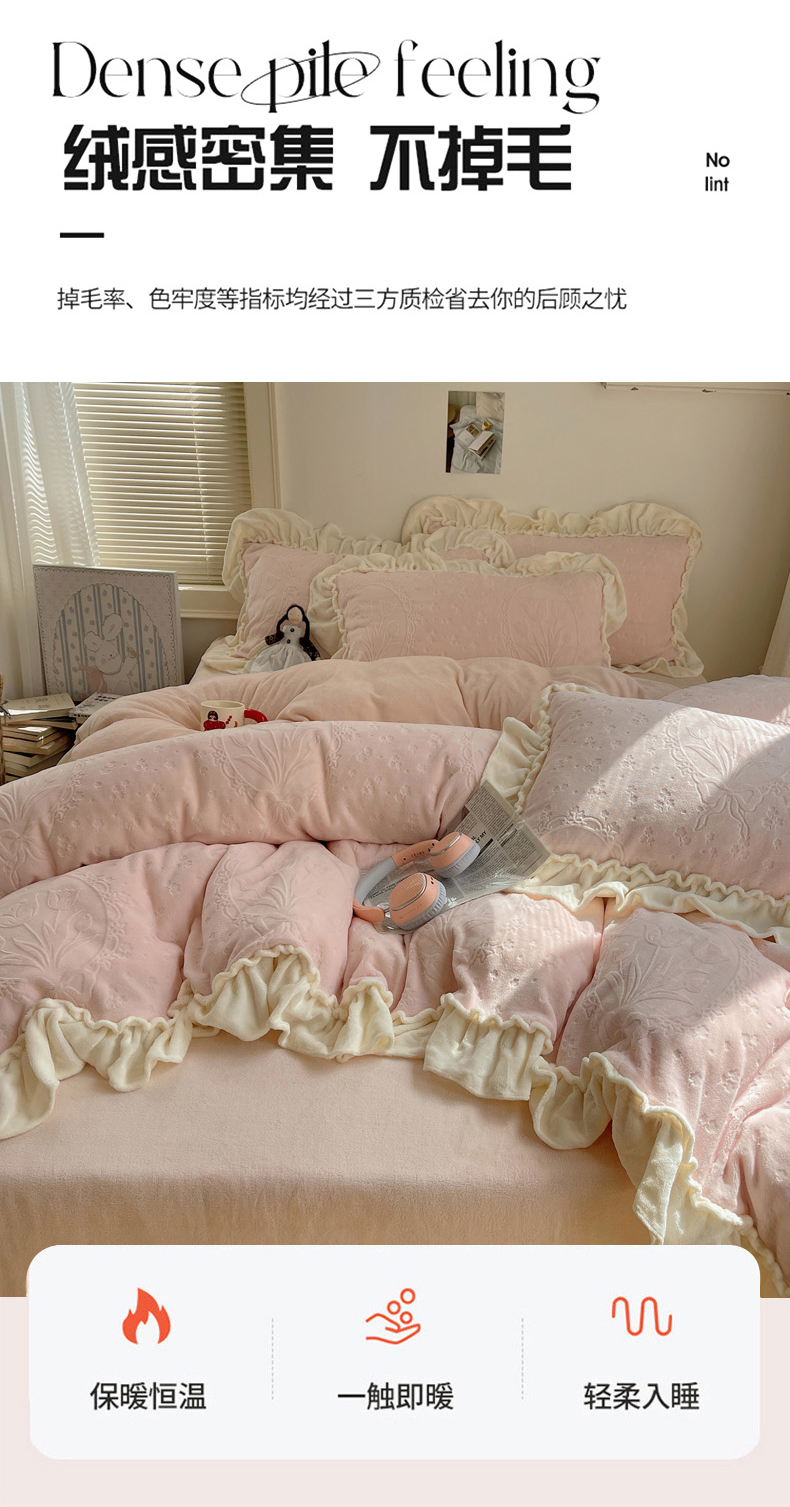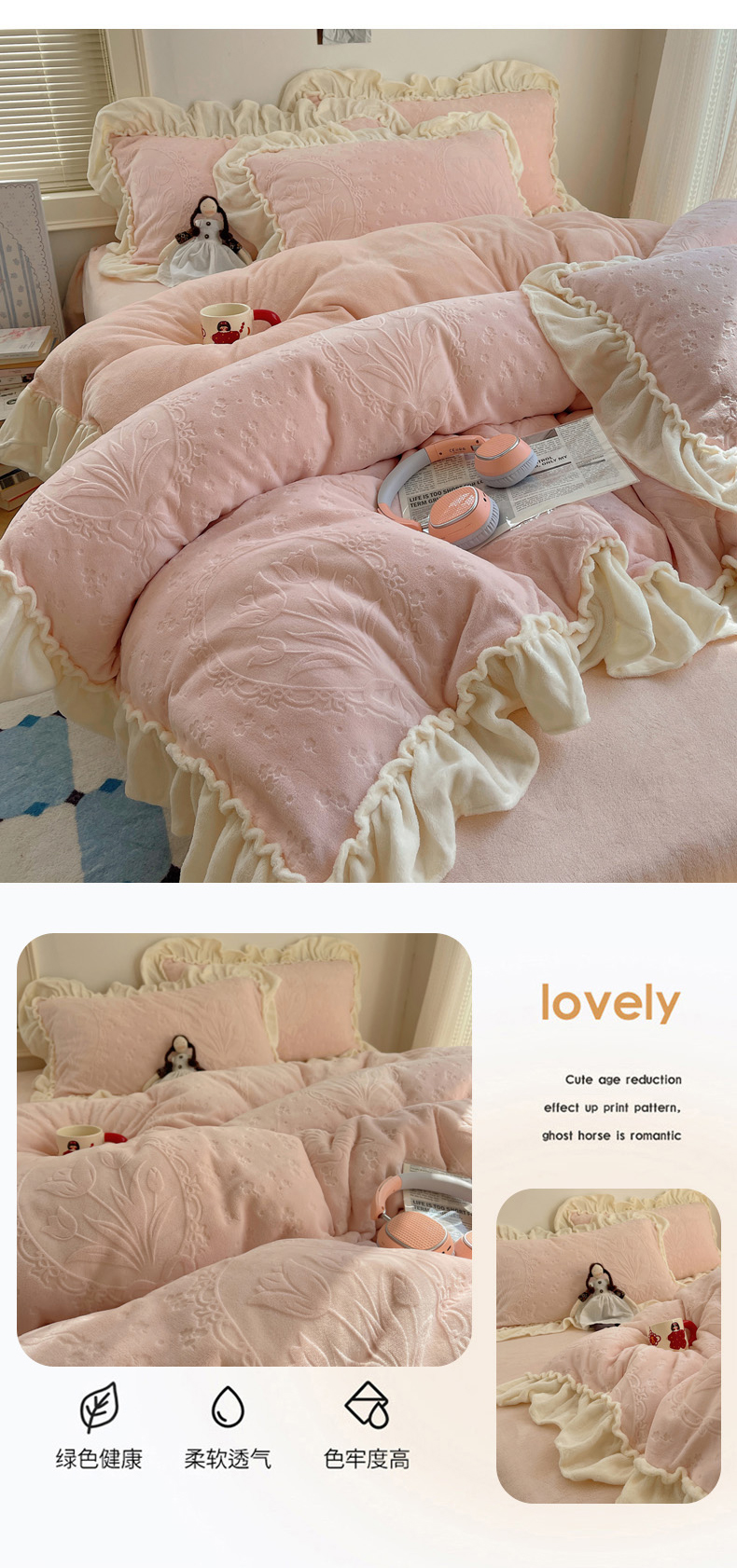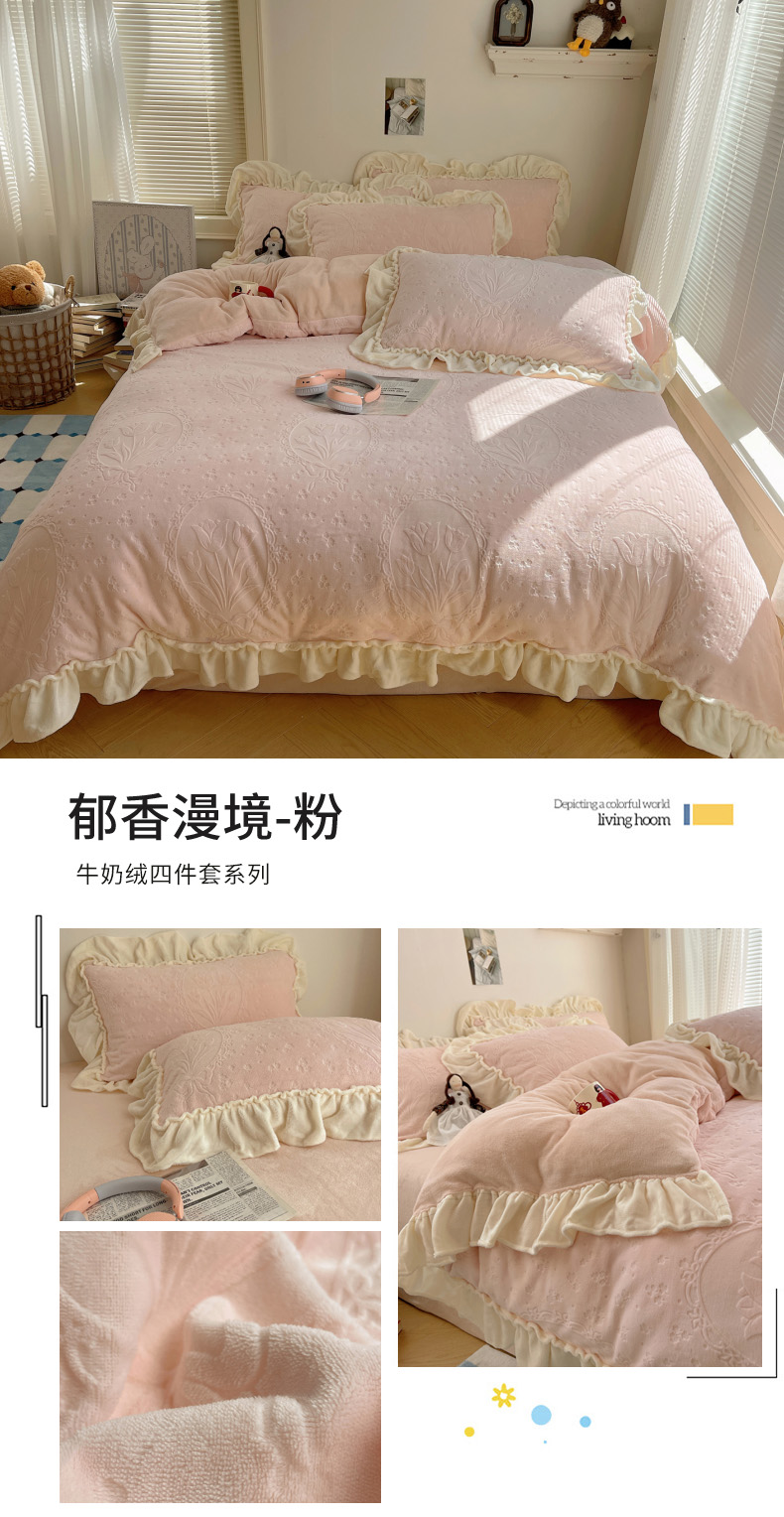 当前位置: 91家纺网 > 商品网购 > 床品套件 > 四件套 > 牛奶绒四件套 > 丽涵家纺 2025新款雕花牛奶绒公主风花边四件套郁香漫境 郁香漫境-粉