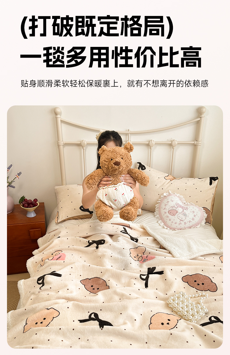 商品名称:红嘴企鹅 2025新款A类ins风卡通可爱加厚牛奶绒羊羔绒毛毯毯子办公室沙发儿童空调盖毯午休毯 蝴蝶结狗狗