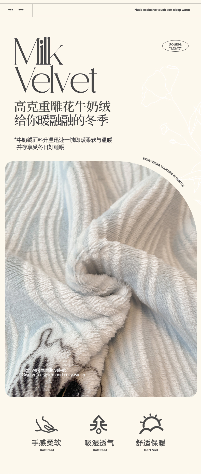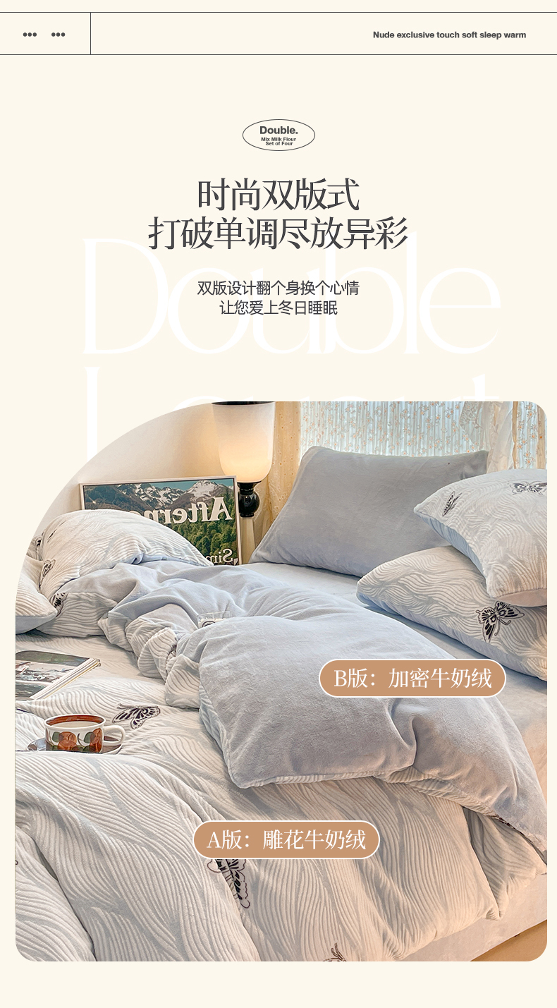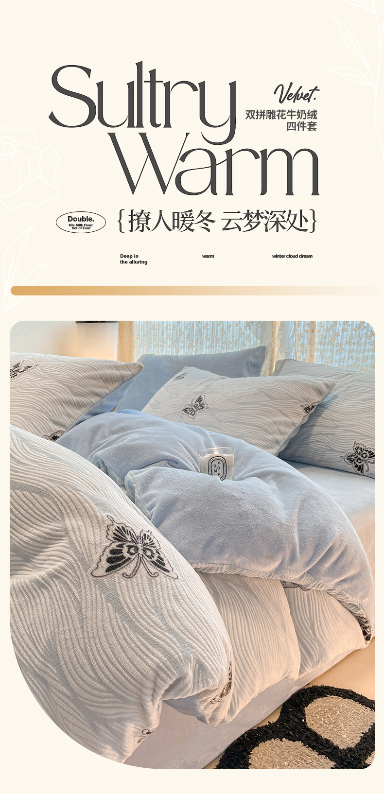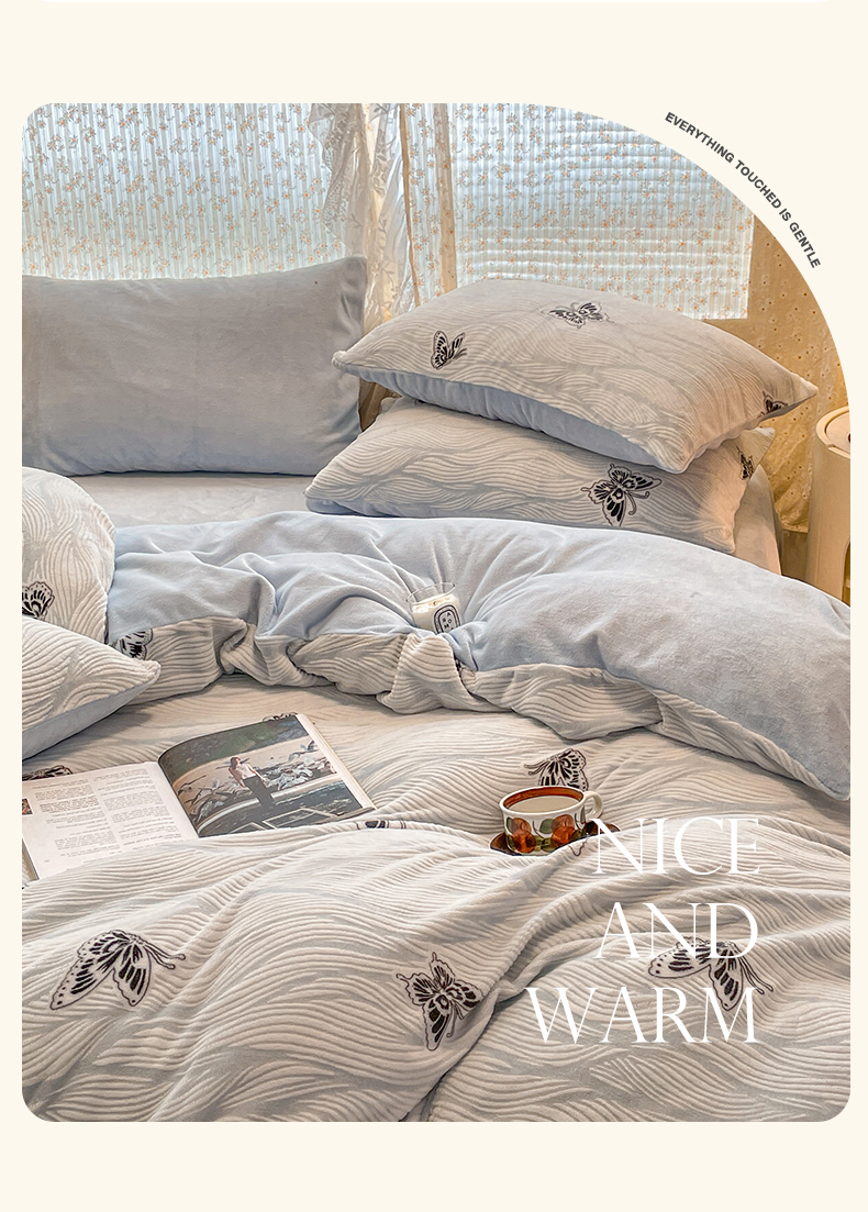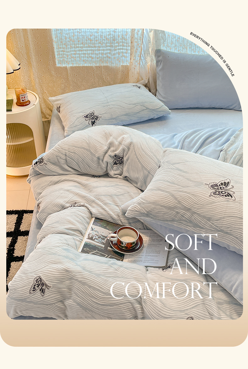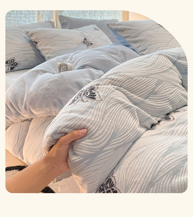 当前位置: 91家纺网 > 商品网购 > 床品套件 > 四件套 > 牛奶绒四件套 > 小叮当家纺仓储工厂店 2025新款高克重230克雕花牛奶绒四件套 水漾蝶舞-蓝