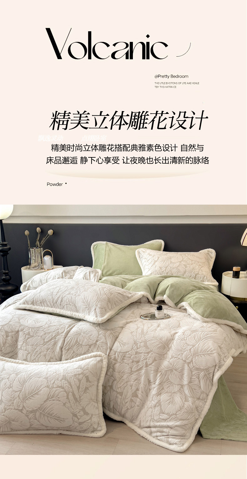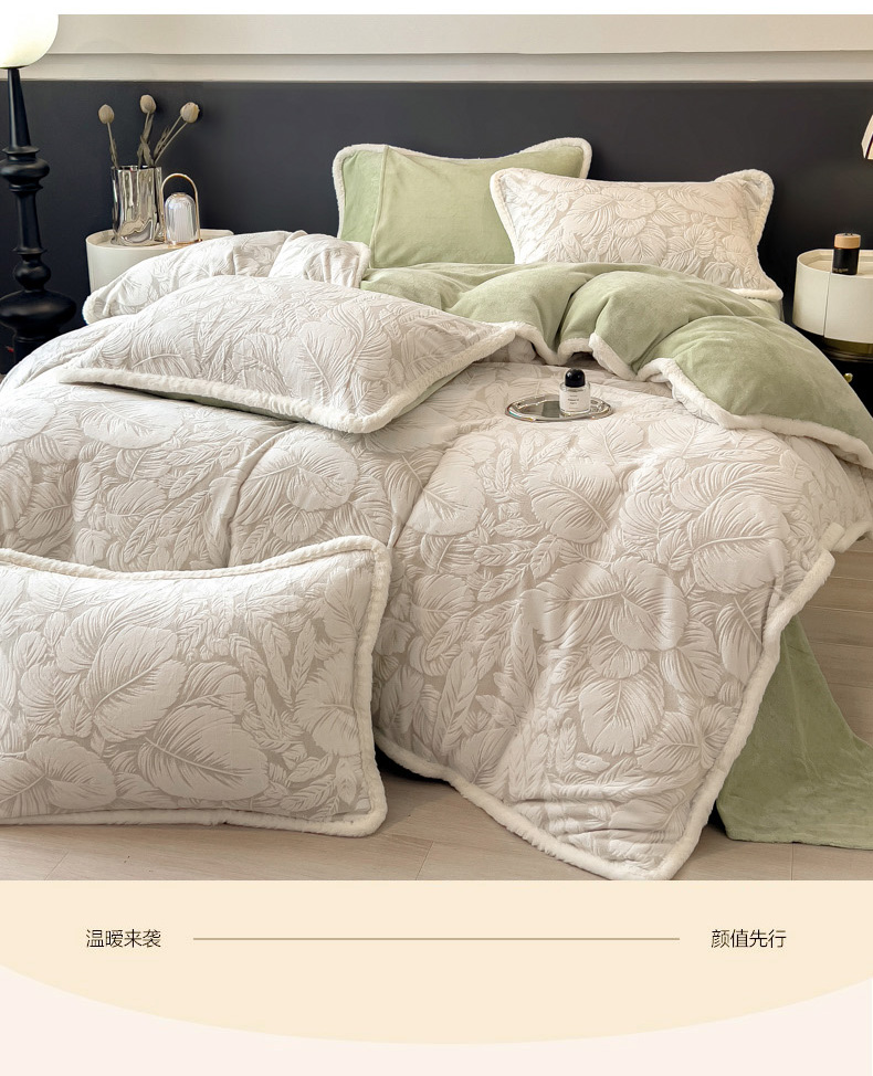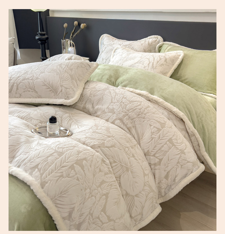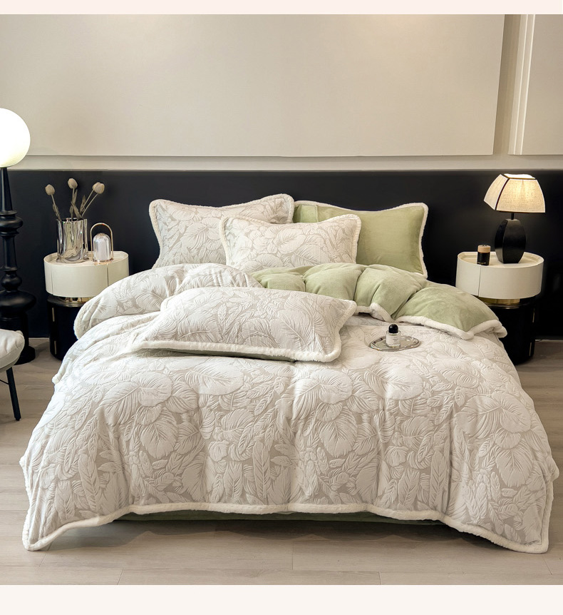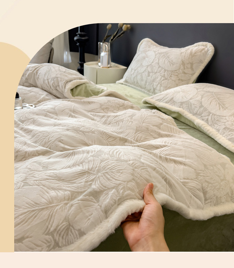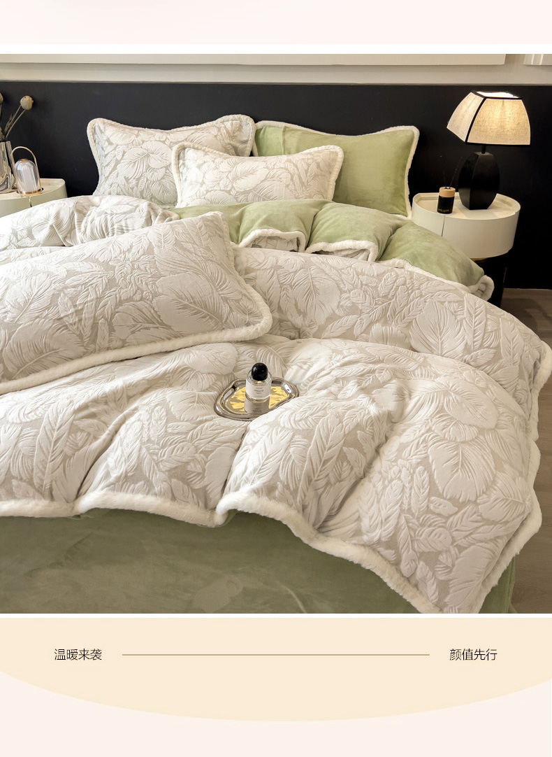 当前位置: 91家纺网 > 商品网购 > 床品套件 > 四件套 > 兔毛绒四件套 > 印季家纺 2025新款法式立体雕花绒兔毛包边四件套 一叶知秋(灰绿)