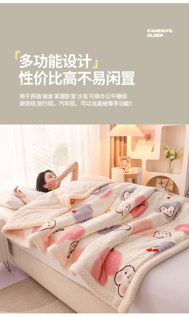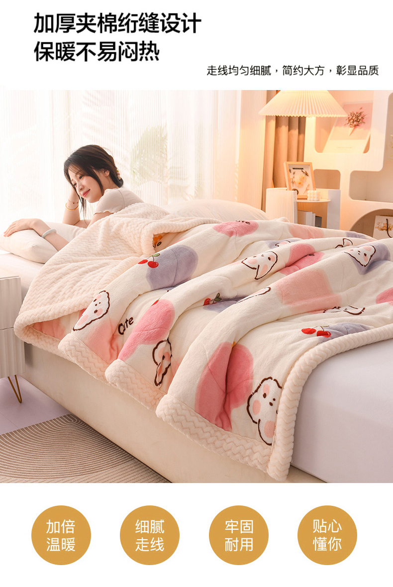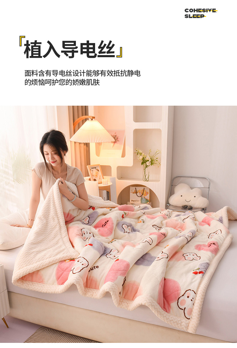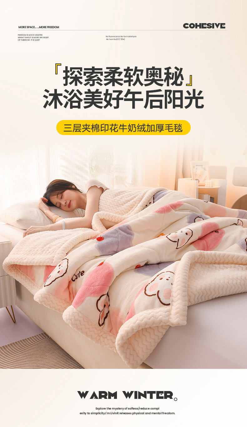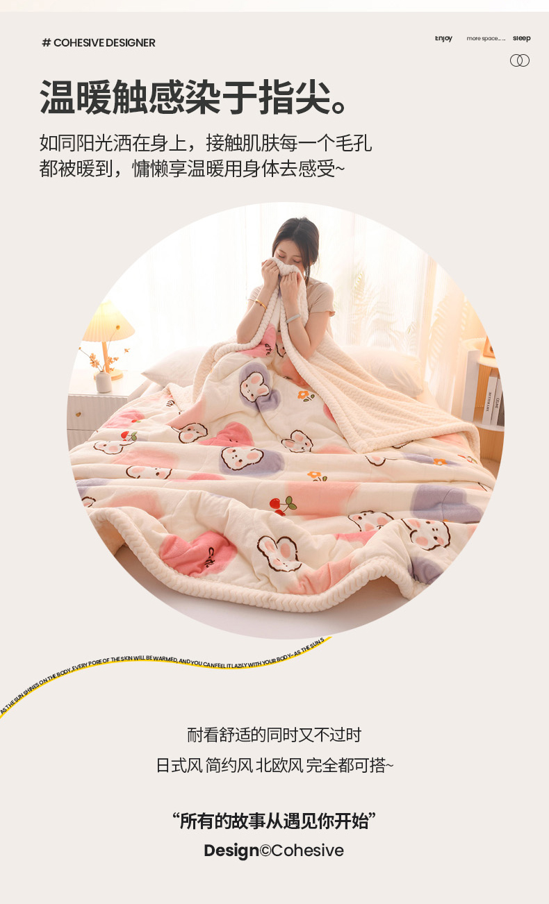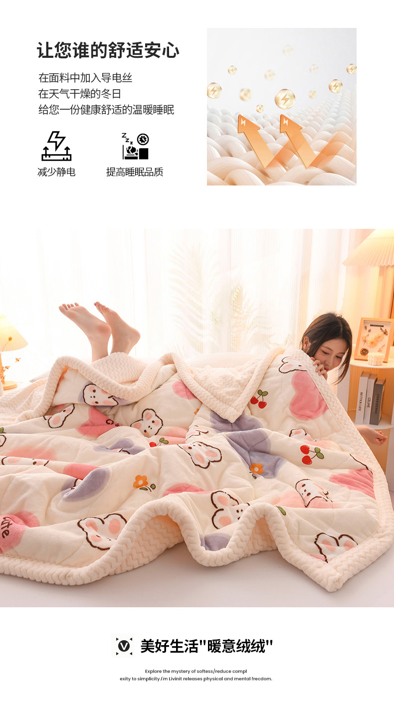 印季家纺 2025新款三层夹棉印花牛奶绒毛毯毯子 萌心兔