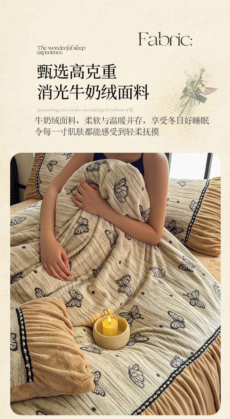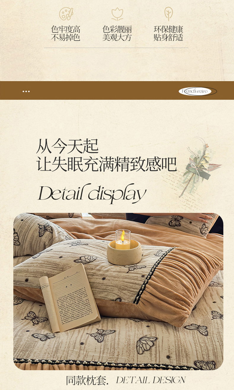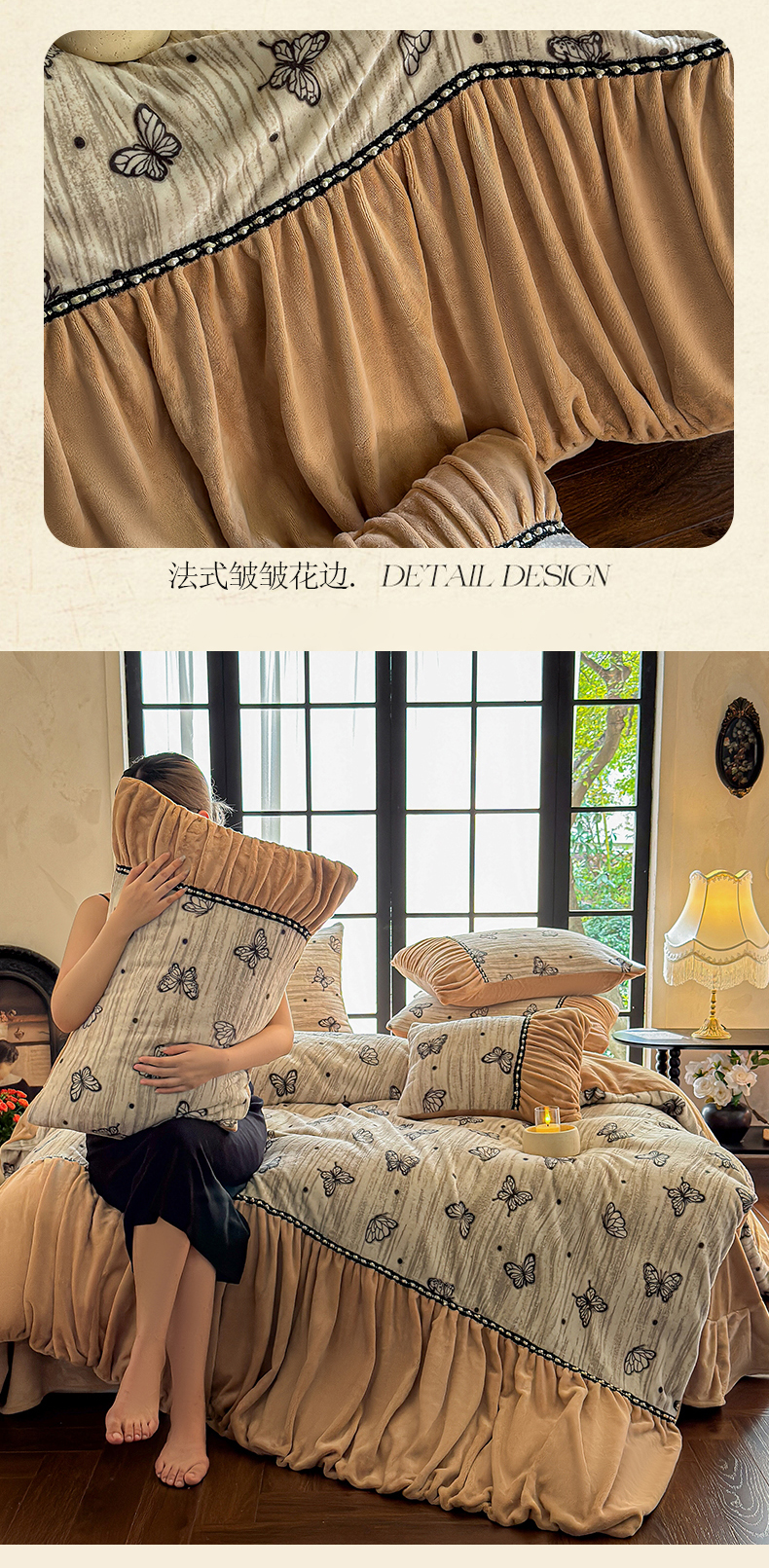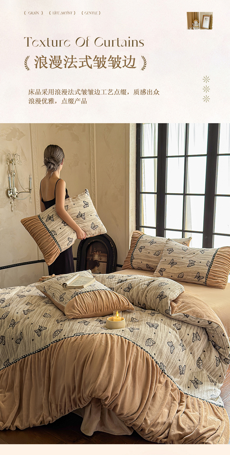 商品名称:纯优家纺 2025新款秋冬法式复古风邹邹边雕花牛奶绒四件套-蝶舞纷飞 蝶舞纷飞-奶咖