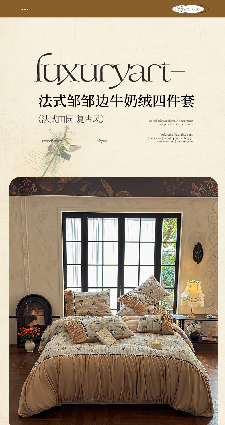 纯优家纺 2025新款秋冬法式复古风邹邹边雕花牛奶绒四件套-蝶舞纷飞 蝶舞纷飞-奶咖