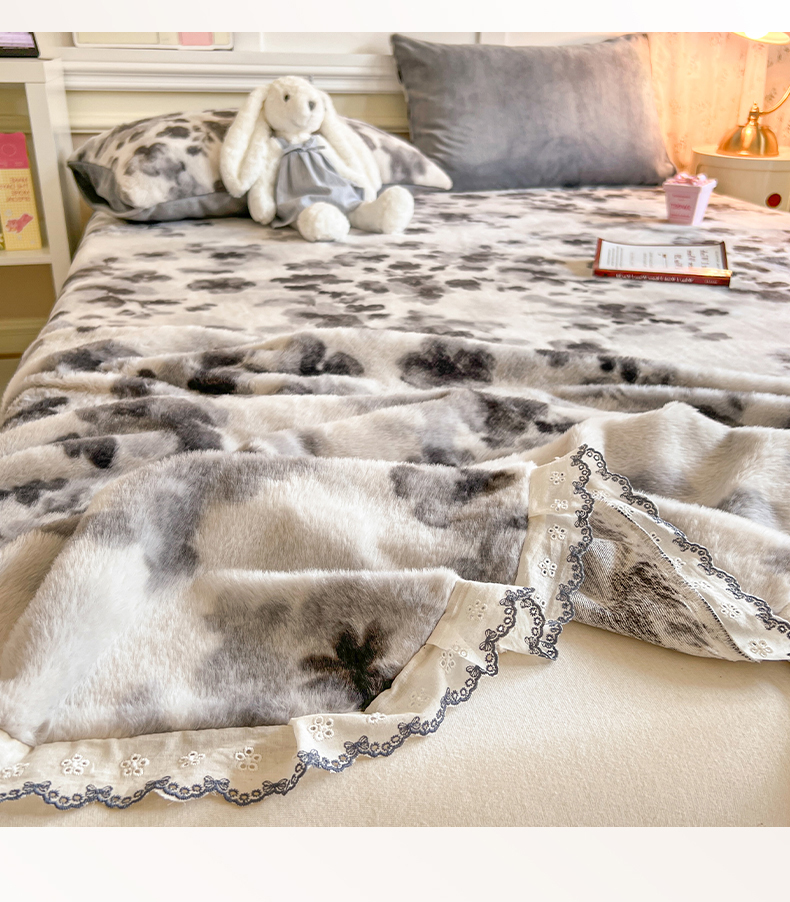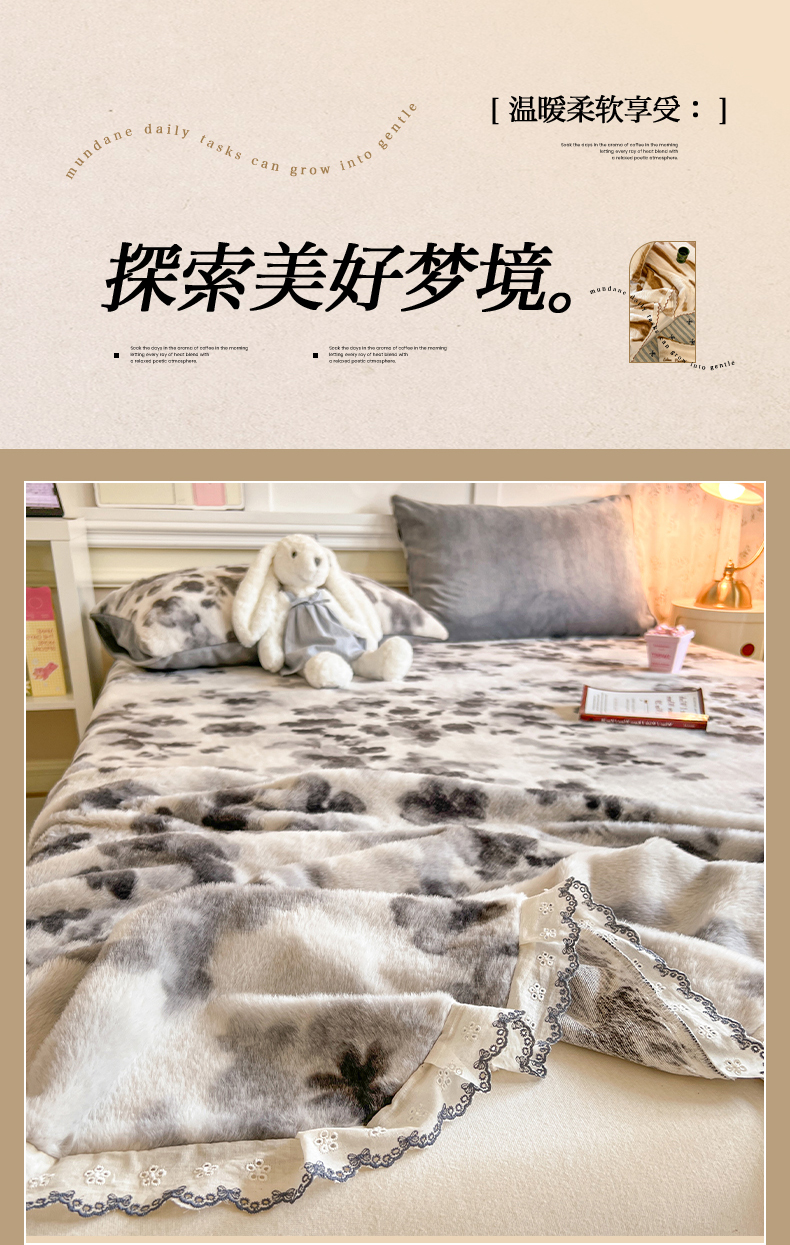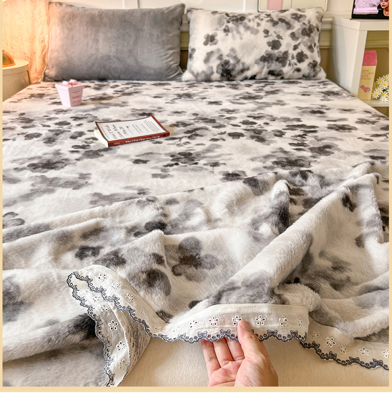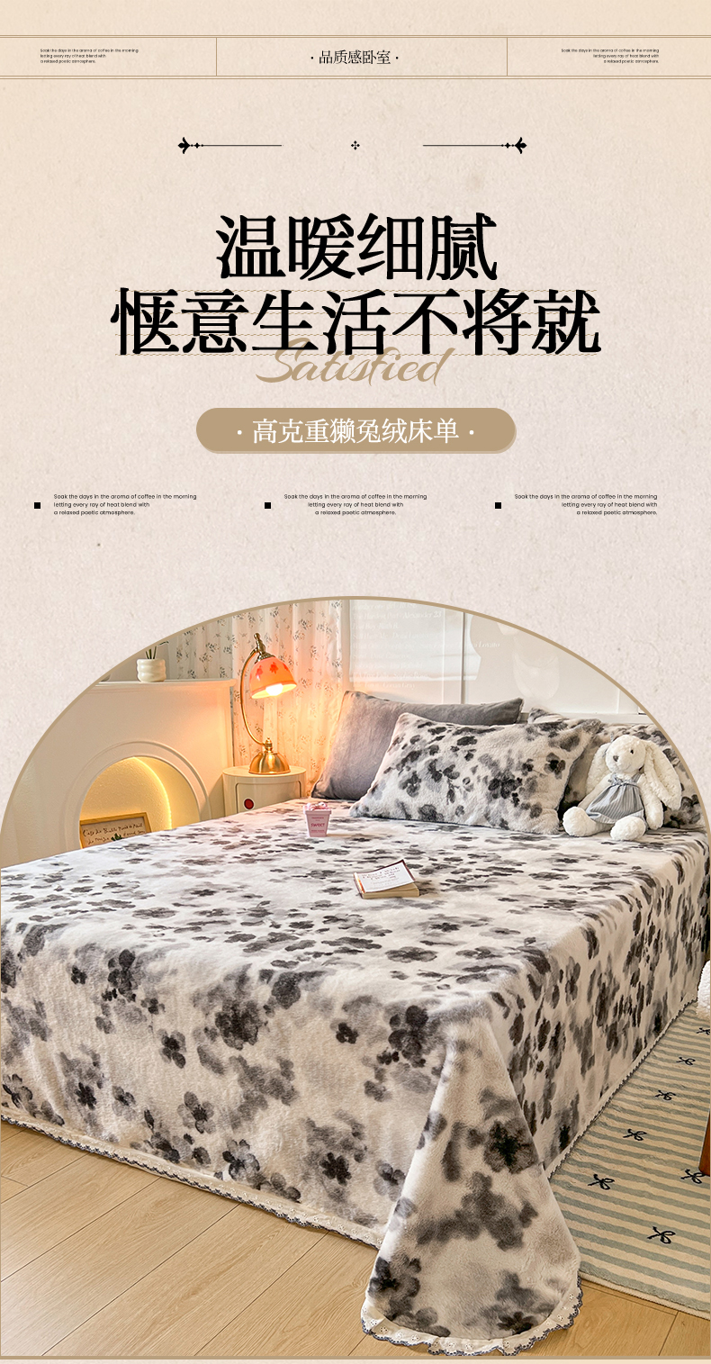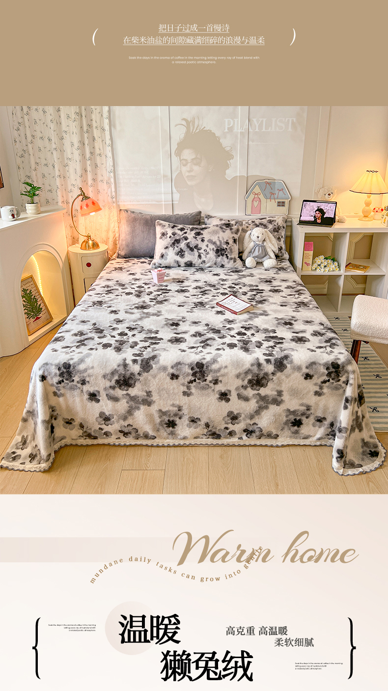 妖妖家纺 2025新款高克重兔毛花边印花单床单 床单单件 墨痕