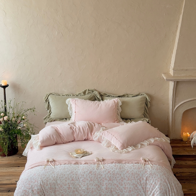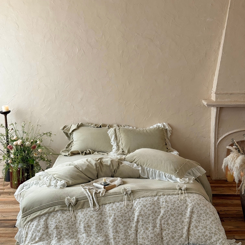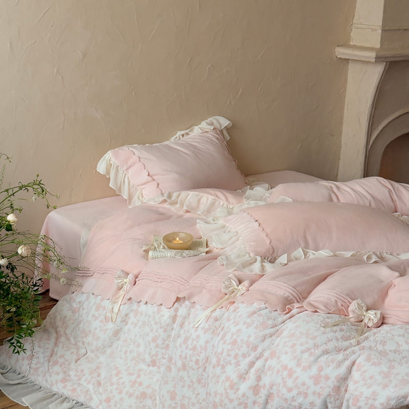 (总)佳汐蓝 2025春夏新品双层皱皱纱刺绣+织带+荷叶边四件套--白茶花,奶白,曲奇