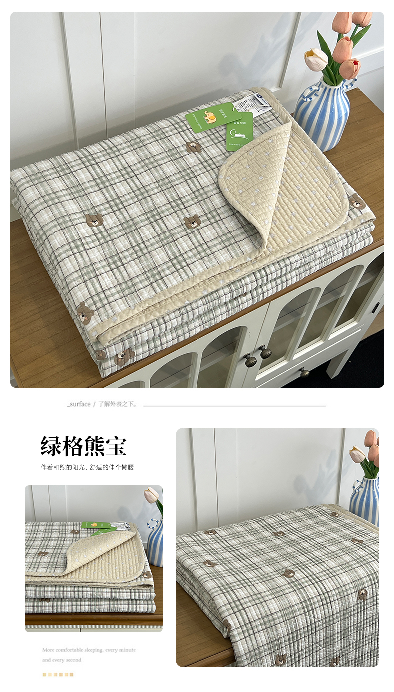 商品名称:沐纯家居 2025新款跑量款双面纯棉 棉花填充水洗床盖 绿格熊宝