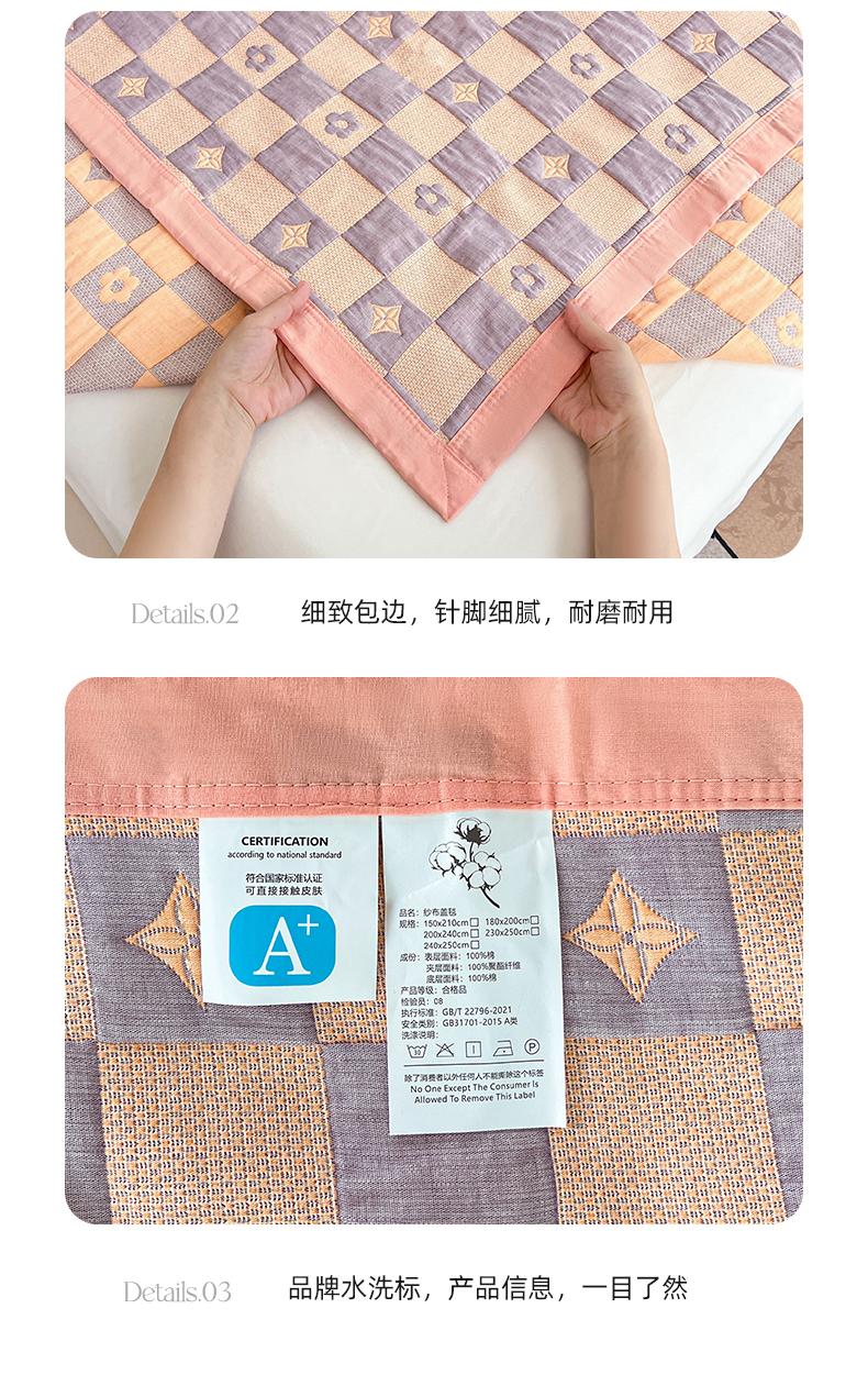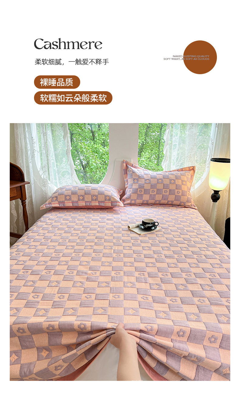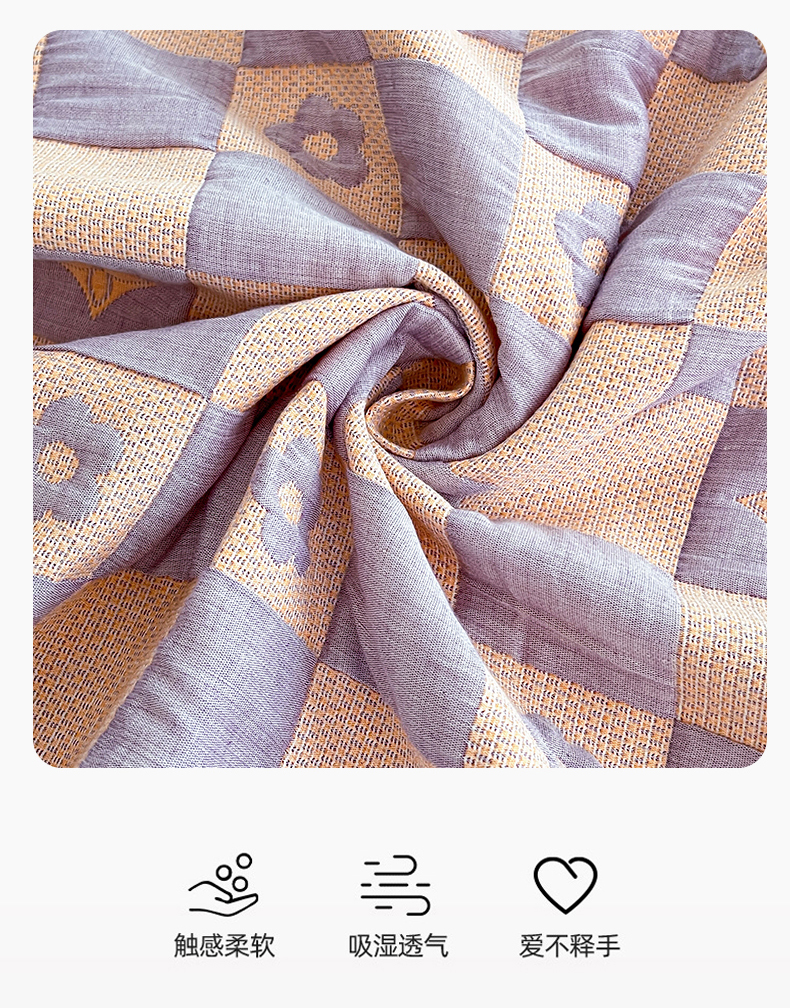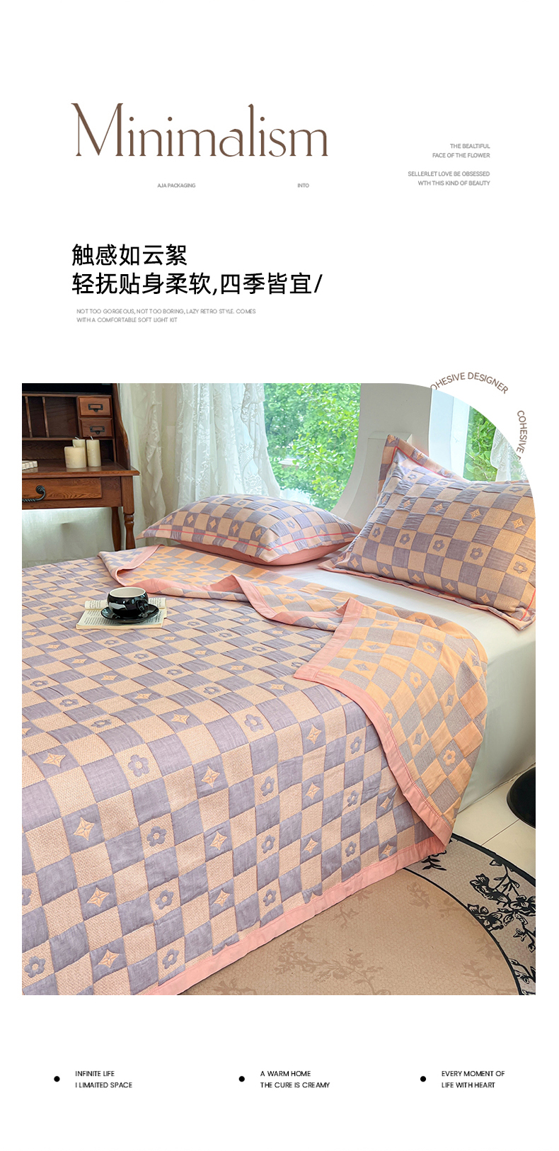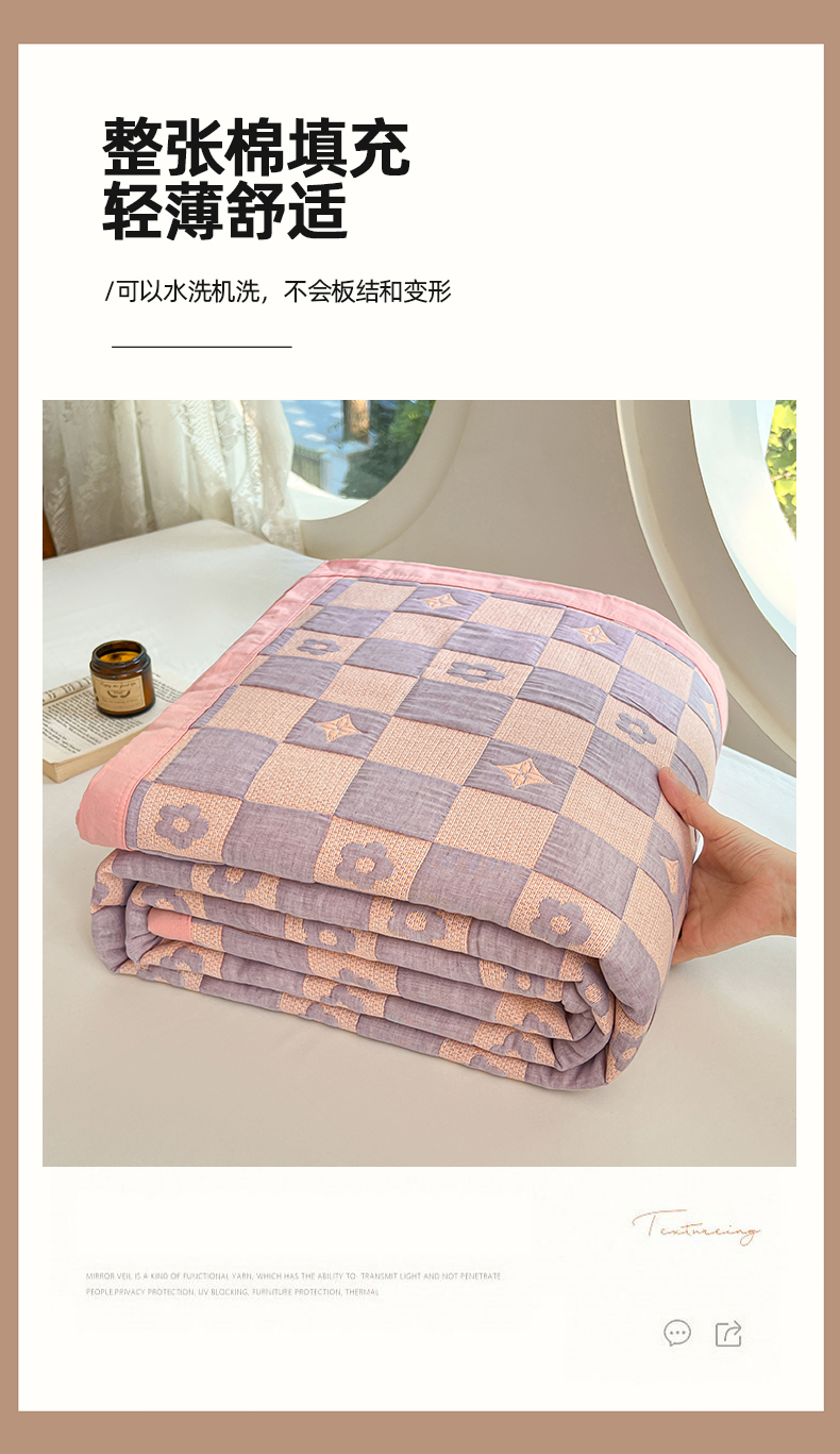 商品名称:yyds网供 2025新款A类色织全棉三层纱布床盖三件套喷气夹棉盖毯夏被厚床单多功能榻榻米风格一 小香风粉紫