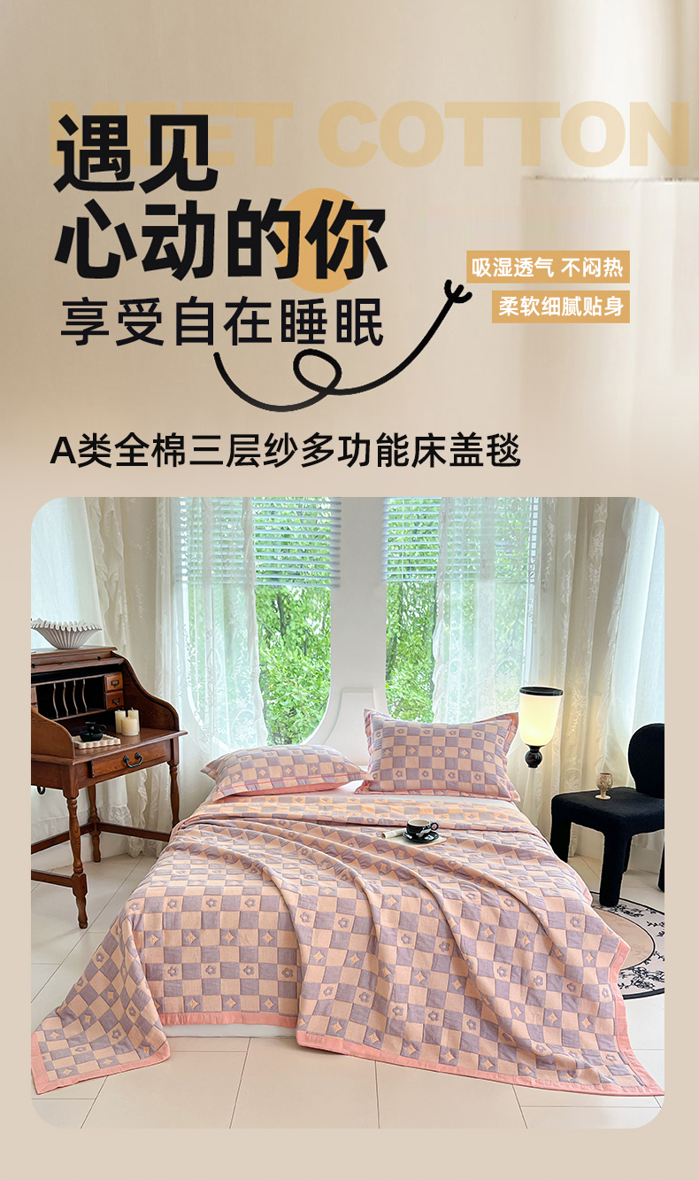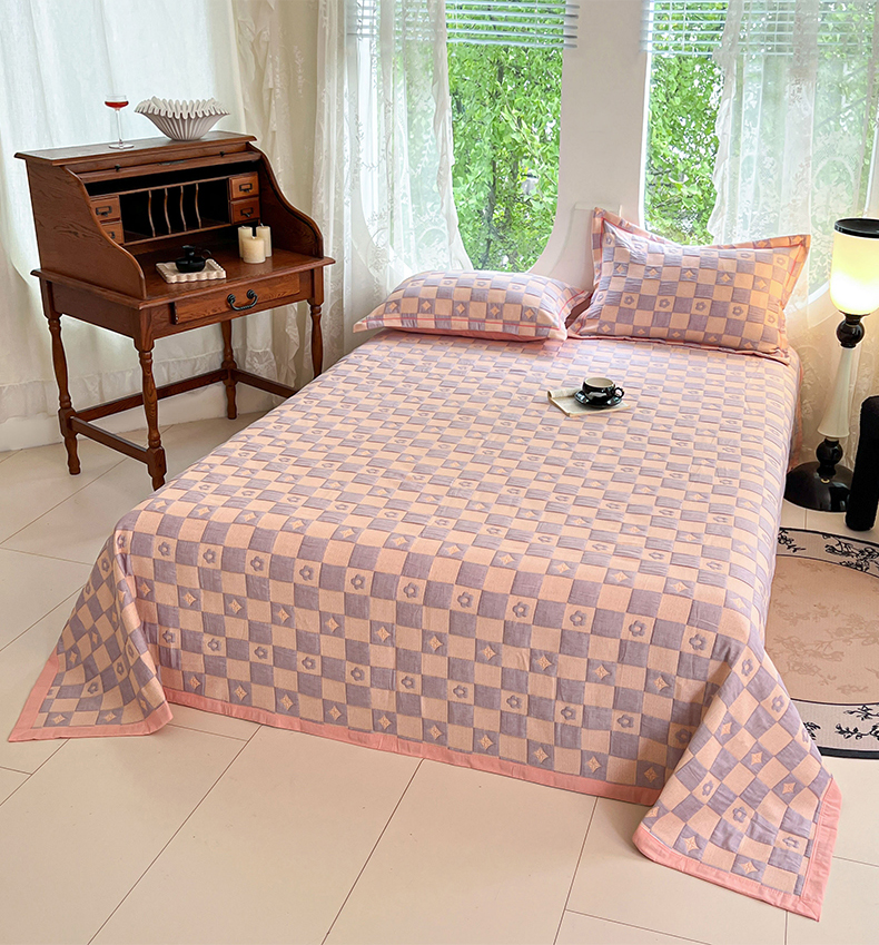 yyds网供 2025新款A类色织全棉三层纱布床盖三件套喷气夹棉盖毯夏被厚床单多功能榻榻米风格一 小香风粉紫