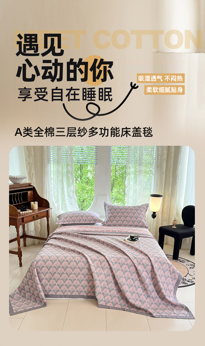 商品名称:(总)yyds网供 2025新款A类色织全棉三层纱布床盖三件套喷气夹棉盖毯夏被厚床单多功能榻榻米风格二