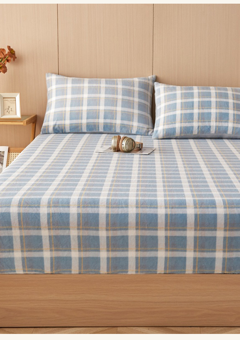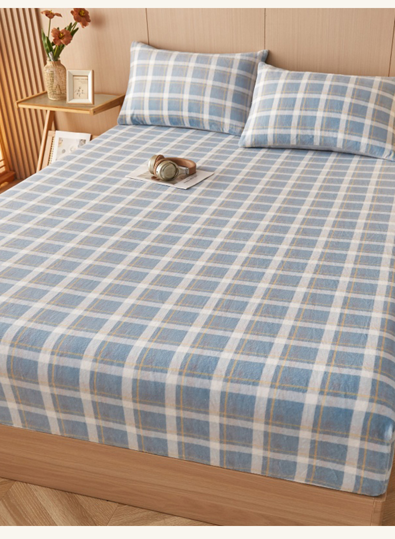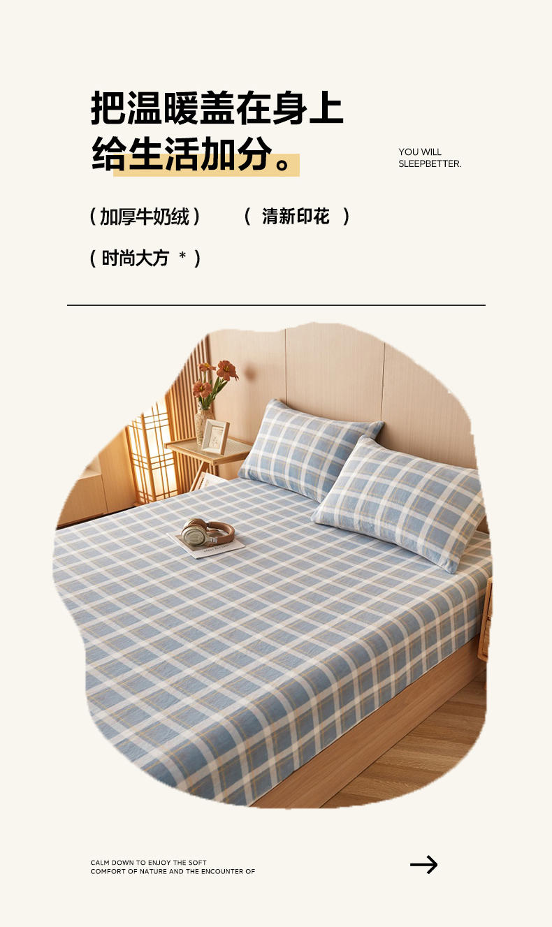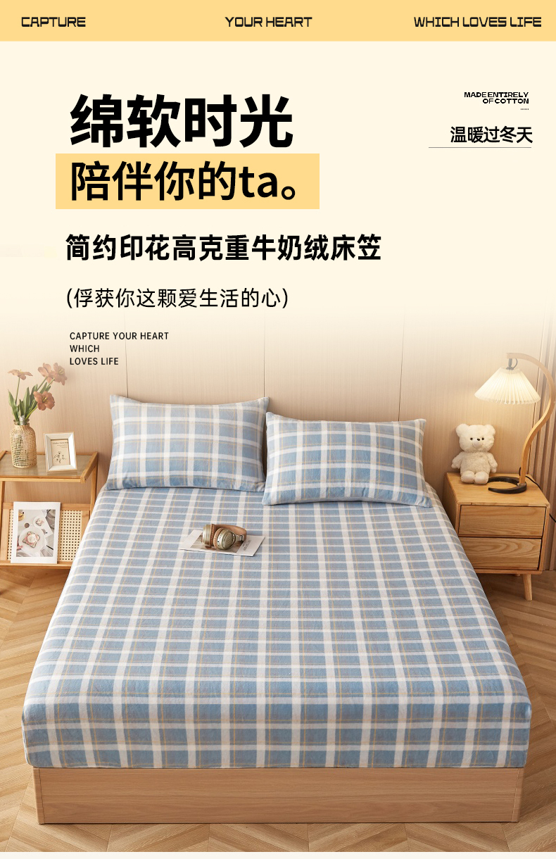 (总)一禾 2025新款简约印花高克重牛奶绒床笠,彩波点,简兮粉,简兮蓝,简兮绿,蓝大格,蓝小格,维卡蓝