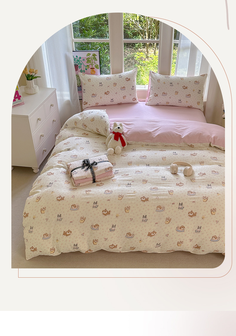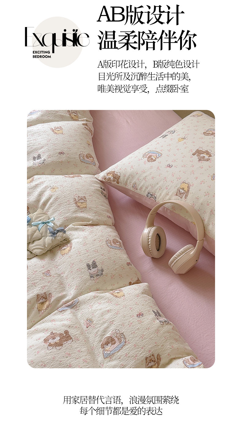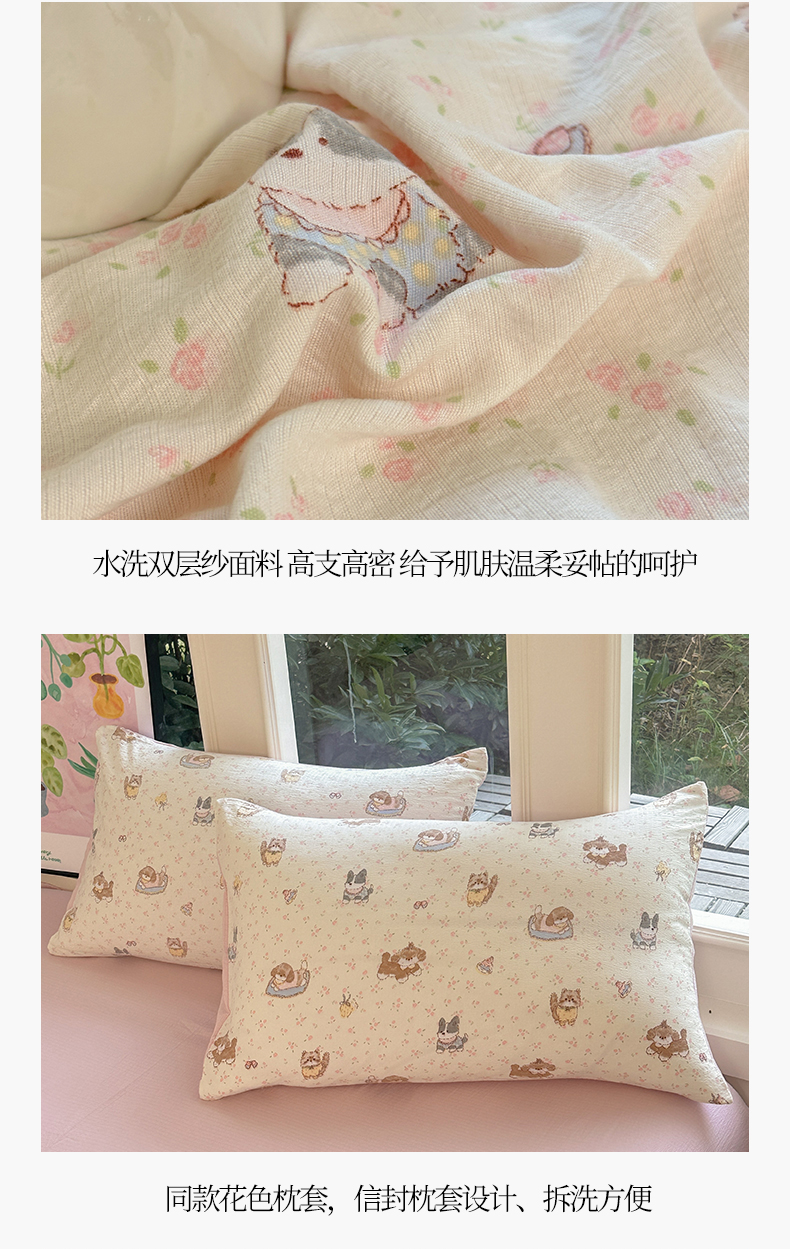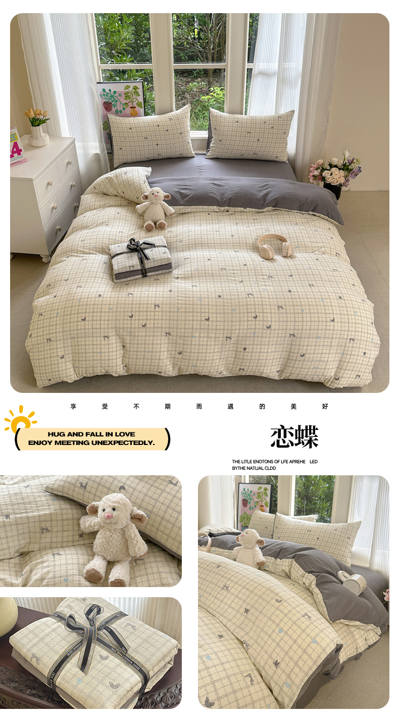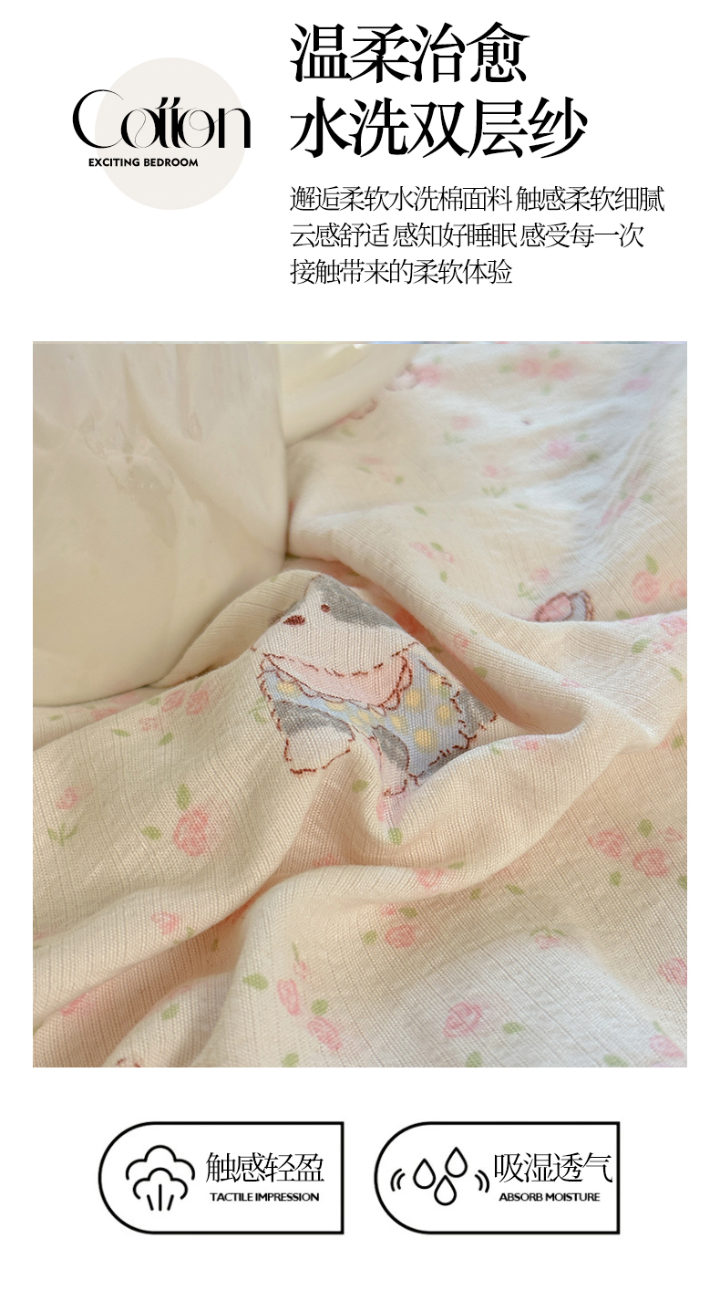 当前位置: 91家纺网 > 商品网购 > 床品套件 > 四件套 > 化纤普通四件套 > 桔禾家纺 2025新款小清新水洗棉有氧双层纱印花云感木棉皱皱纱四件套 萌宠格子铺