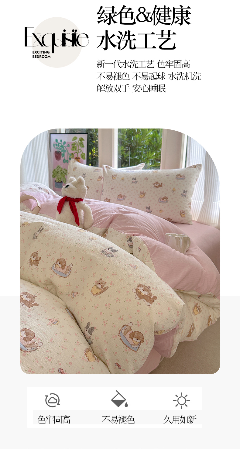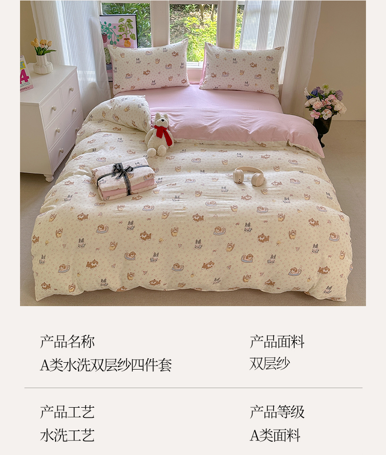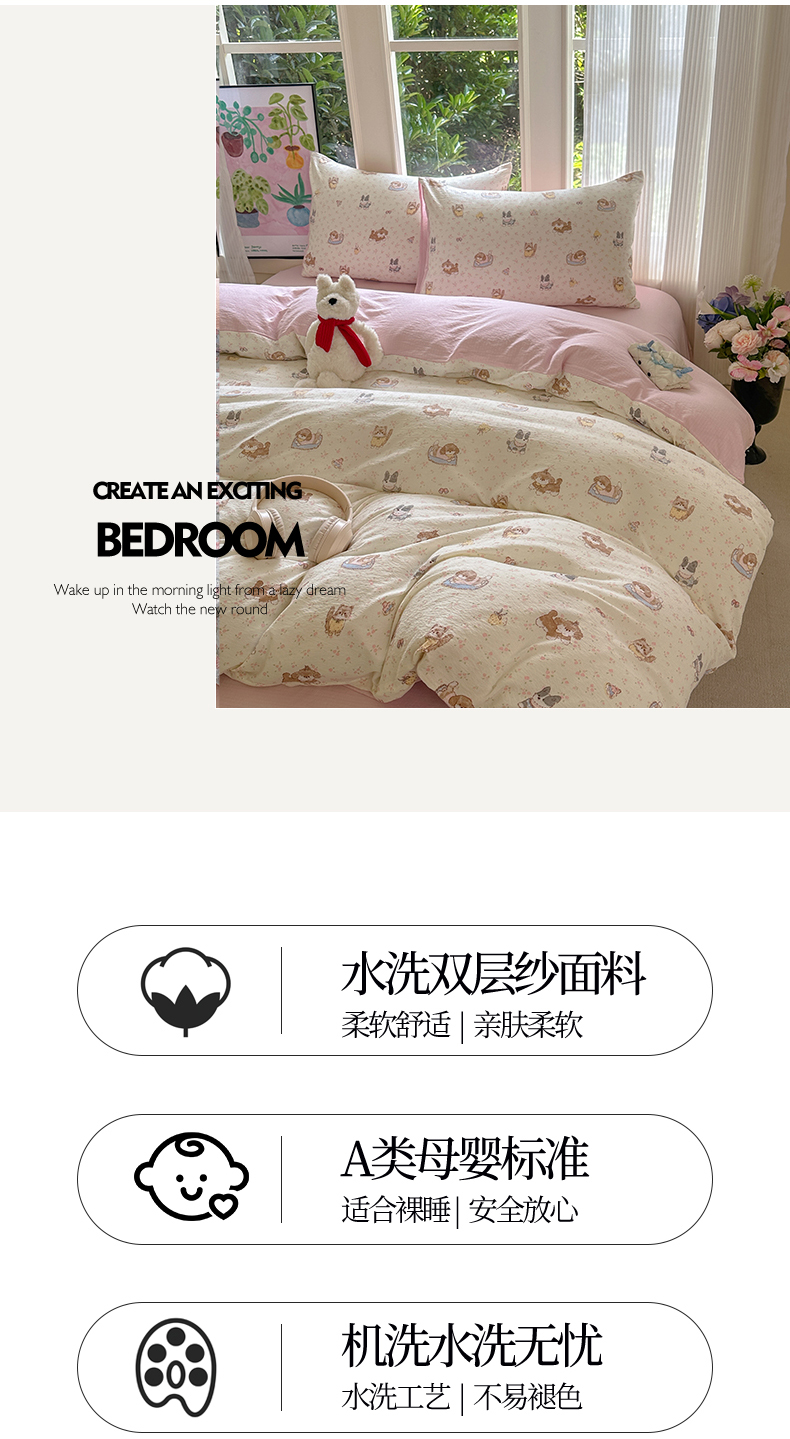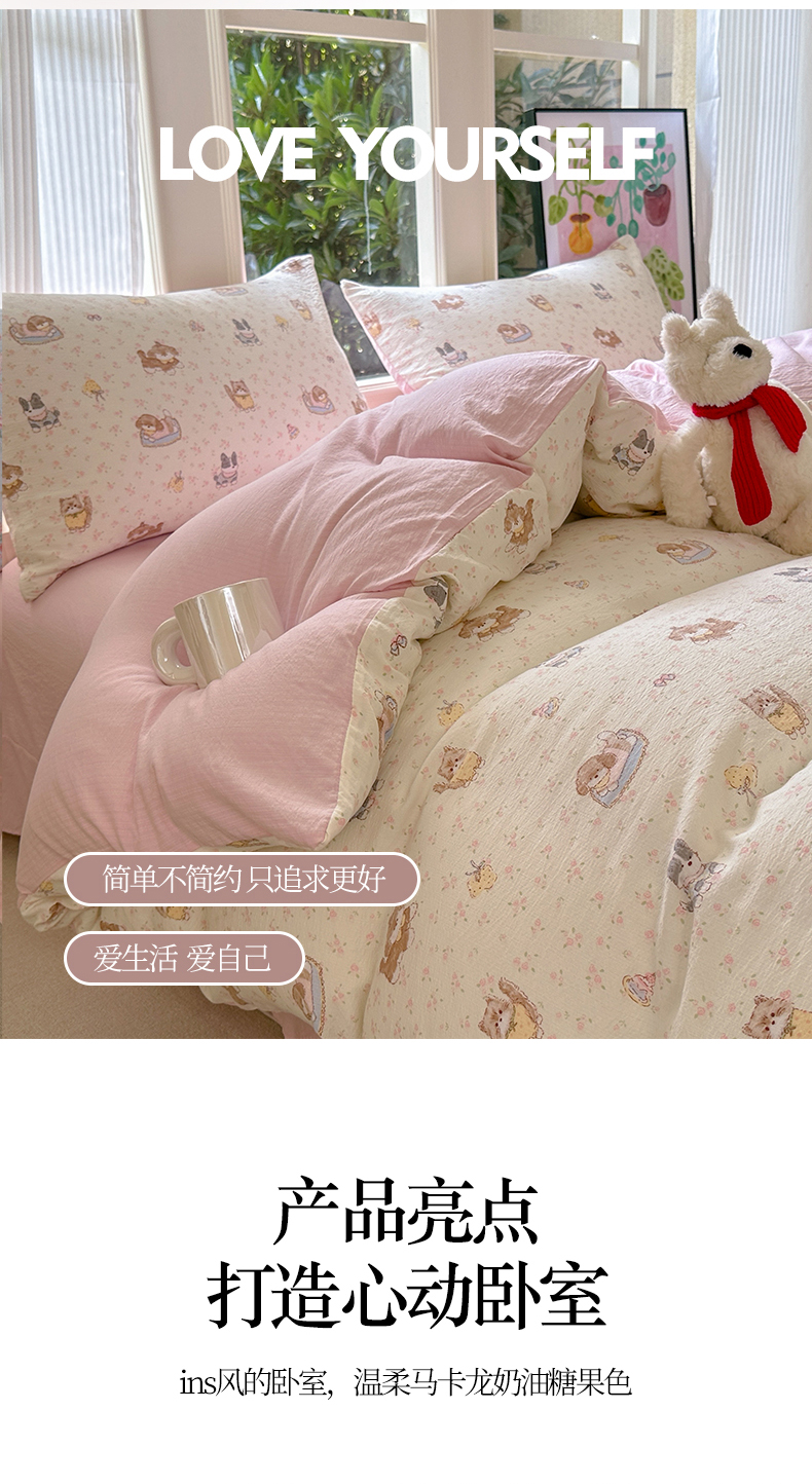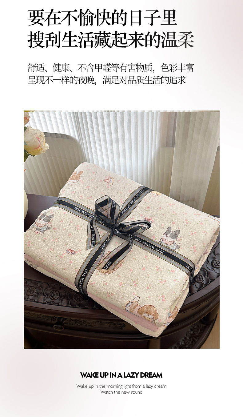 当前位置: 91家纺网 > 商品网购 > 床品套件 > 四件套 > 化纤普通四件套 > 桔禾家纺 2025新款小清新水洗棉有氧双层纱印花云感木棉皱皱纱四件套 萌宠格子铺