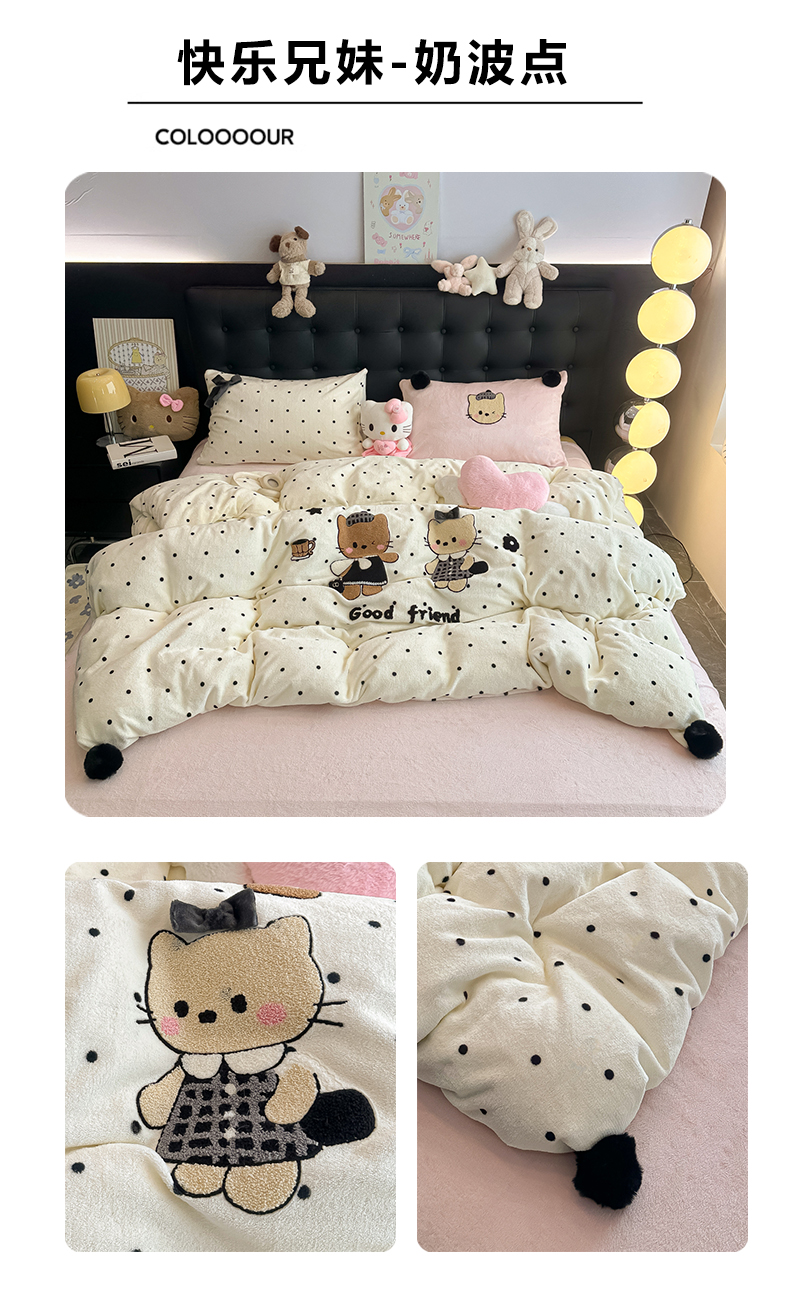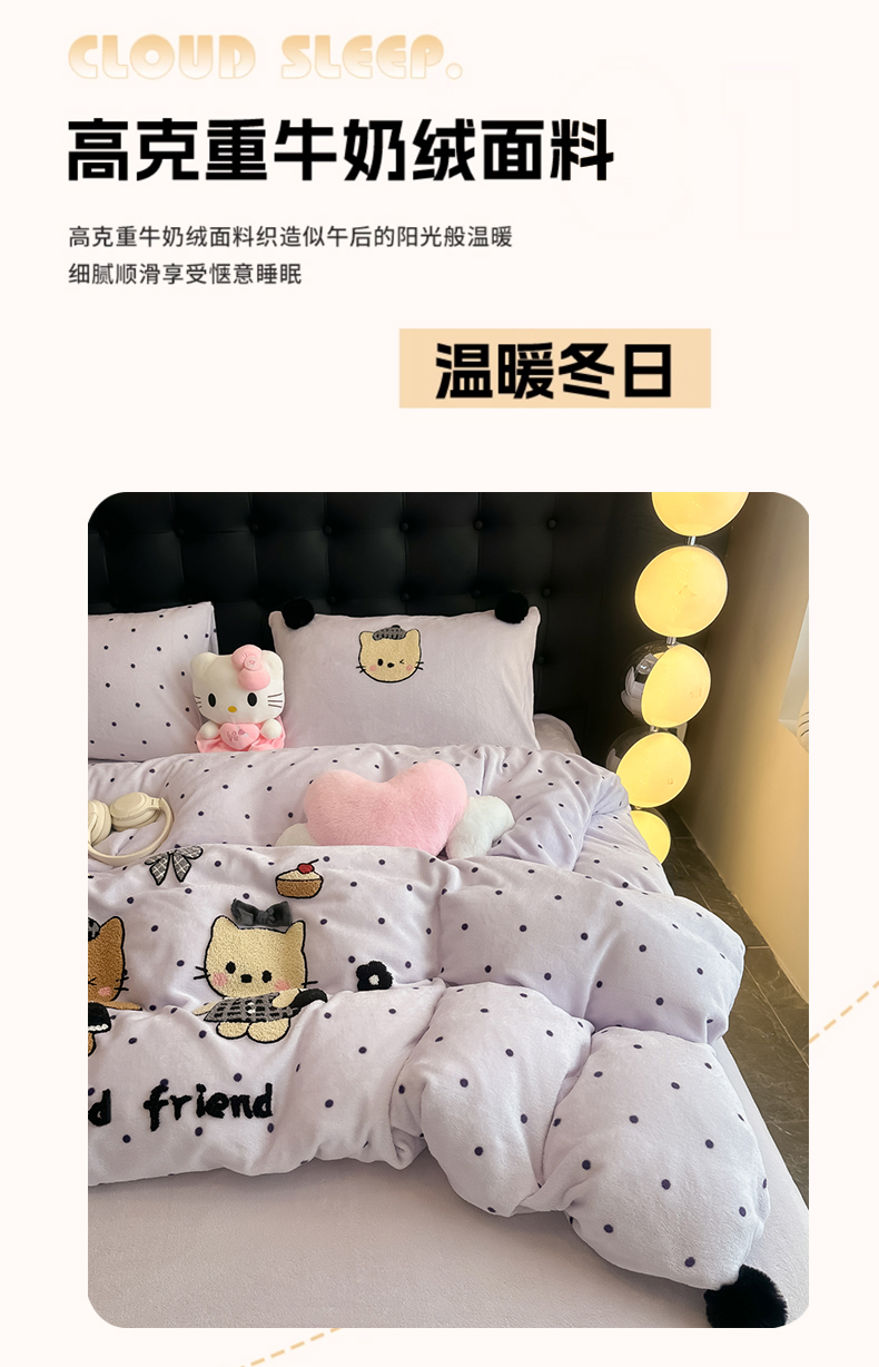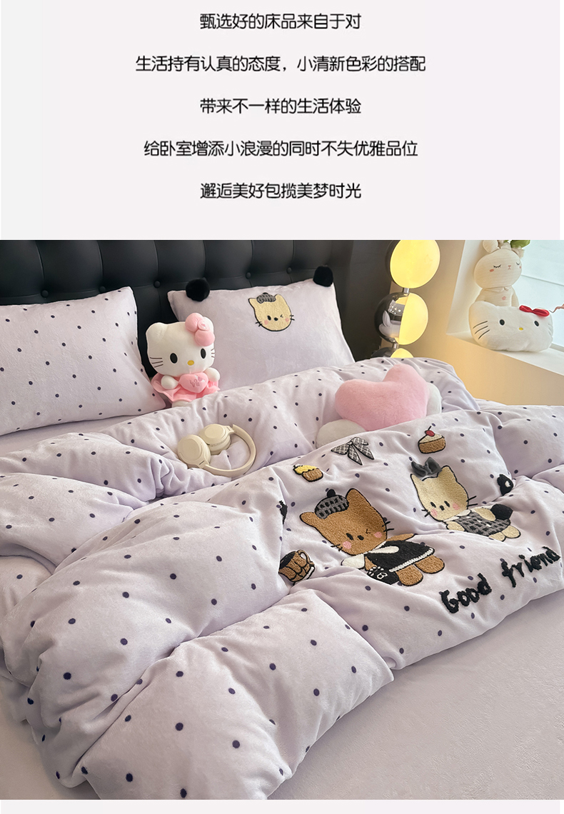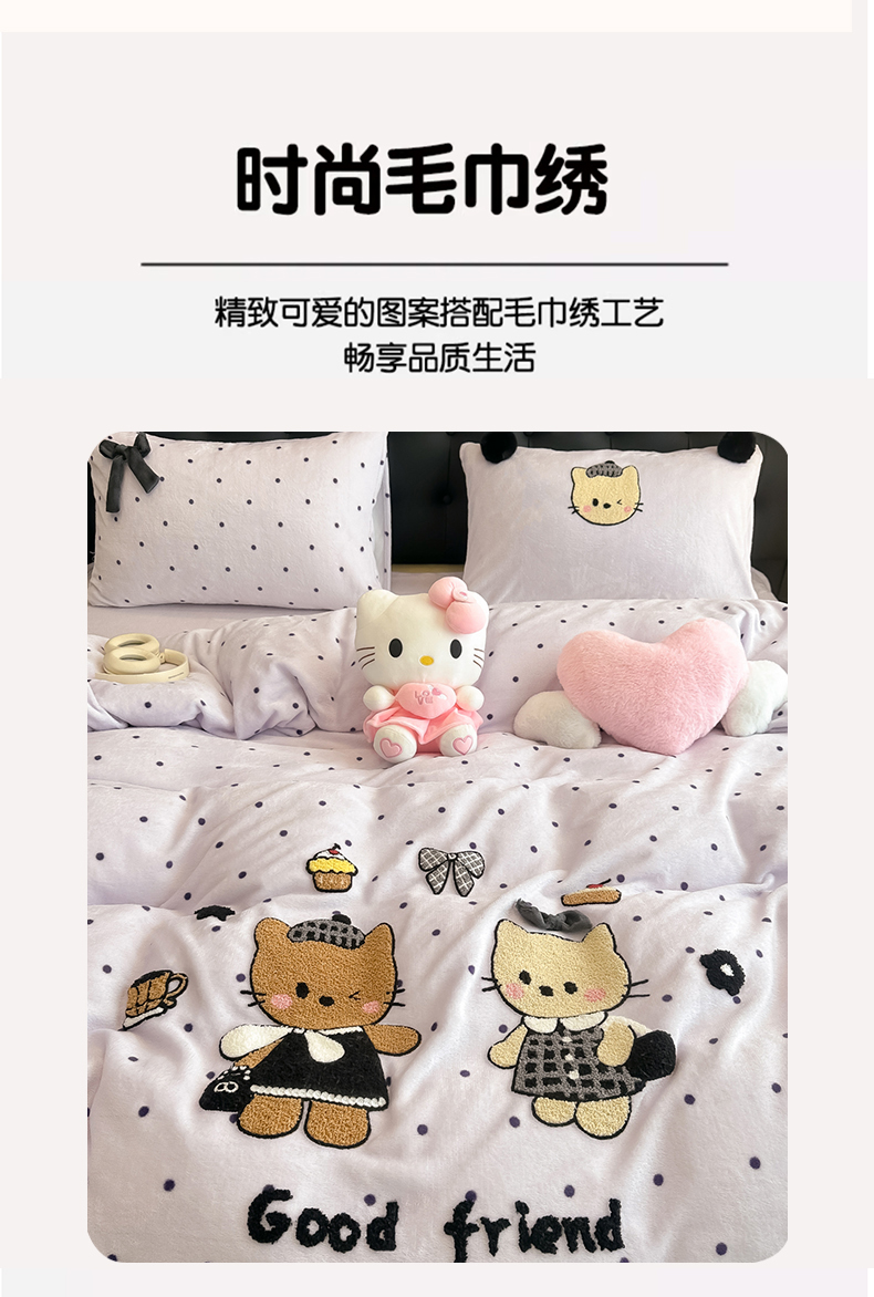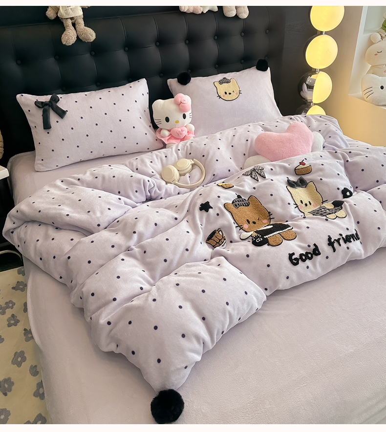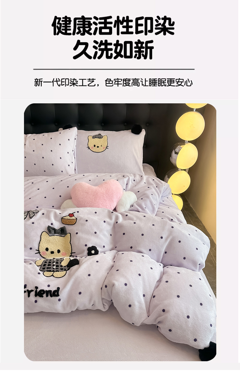 子钦家纺 2025秋冬新款暗黑系小红书同款加厚牛奶绒蝴蝶结款毛巾绣床单床笠四件套-快乐兄妹场景二 快乐兄妹-紫波点