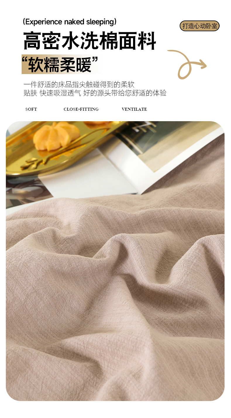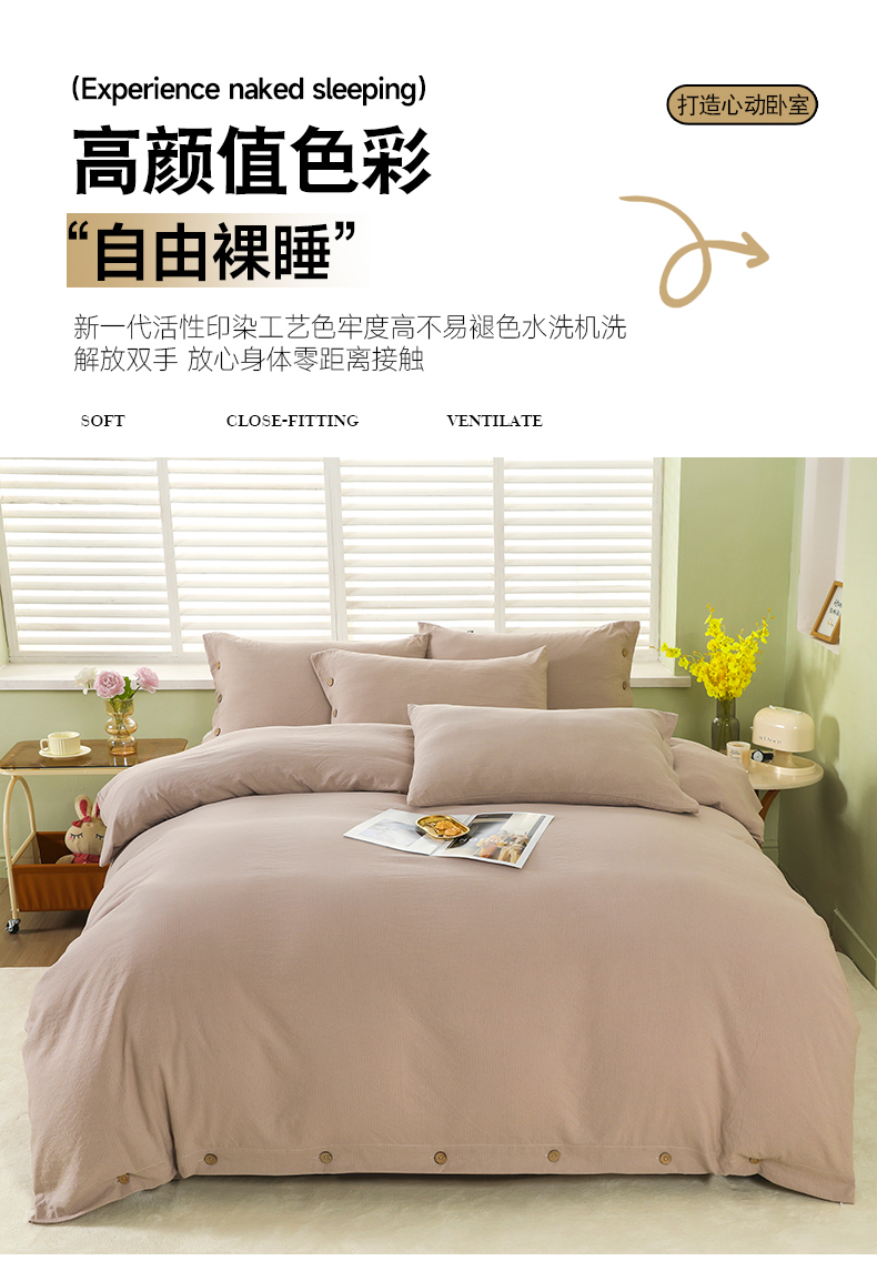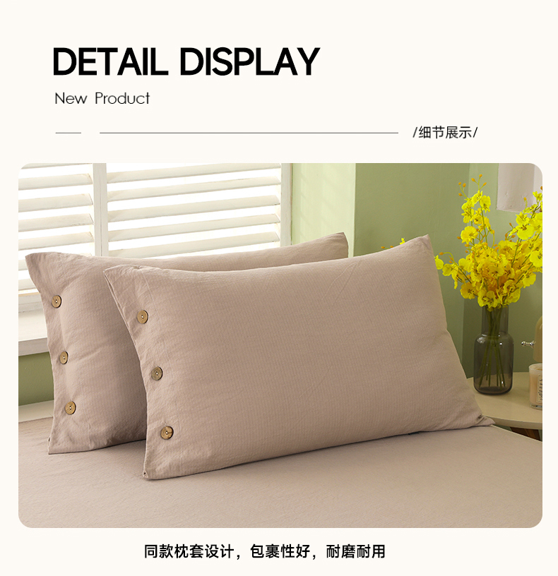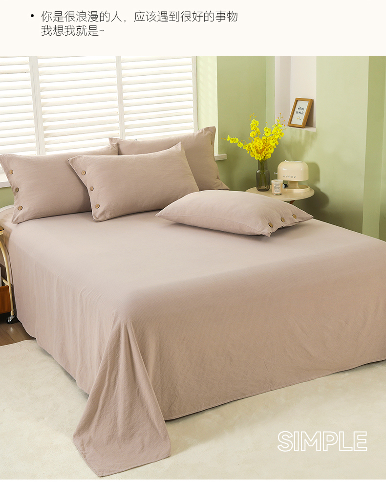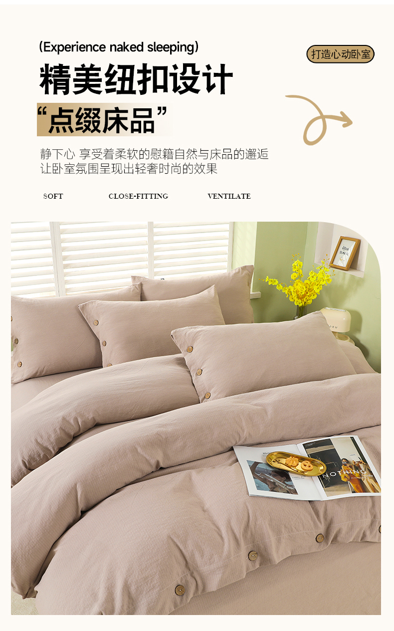 商品名称:博婷 2026新款水洗棉麻皱皱纱纽扣工艺款四件套 浅咖