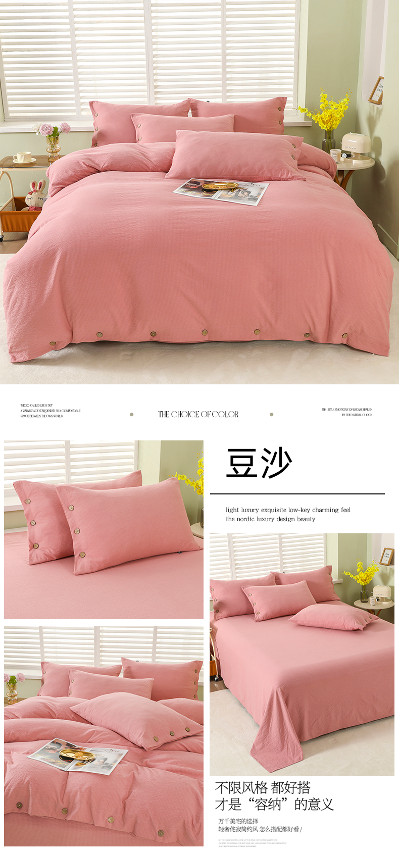 (总)博婷 2026新款水洗棉麻皱皱纱纽扣工艺款四件套,豆沙,湖蓝,灰色,姜黄,蓝色,浅咖