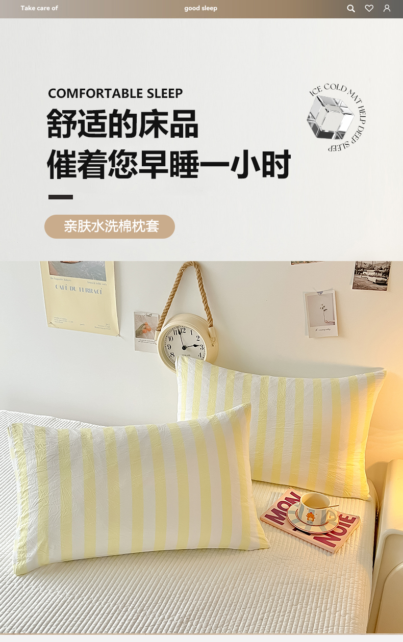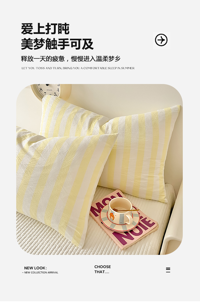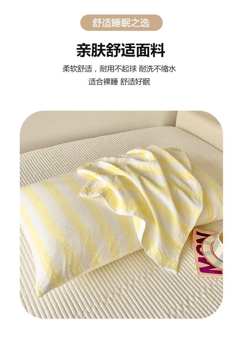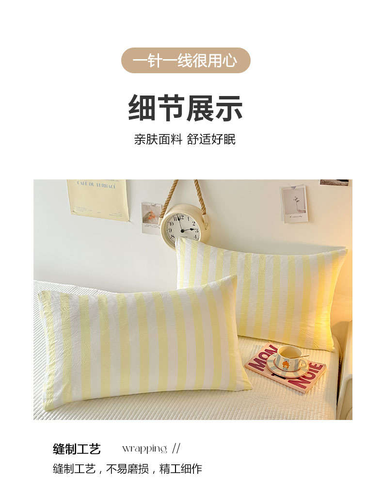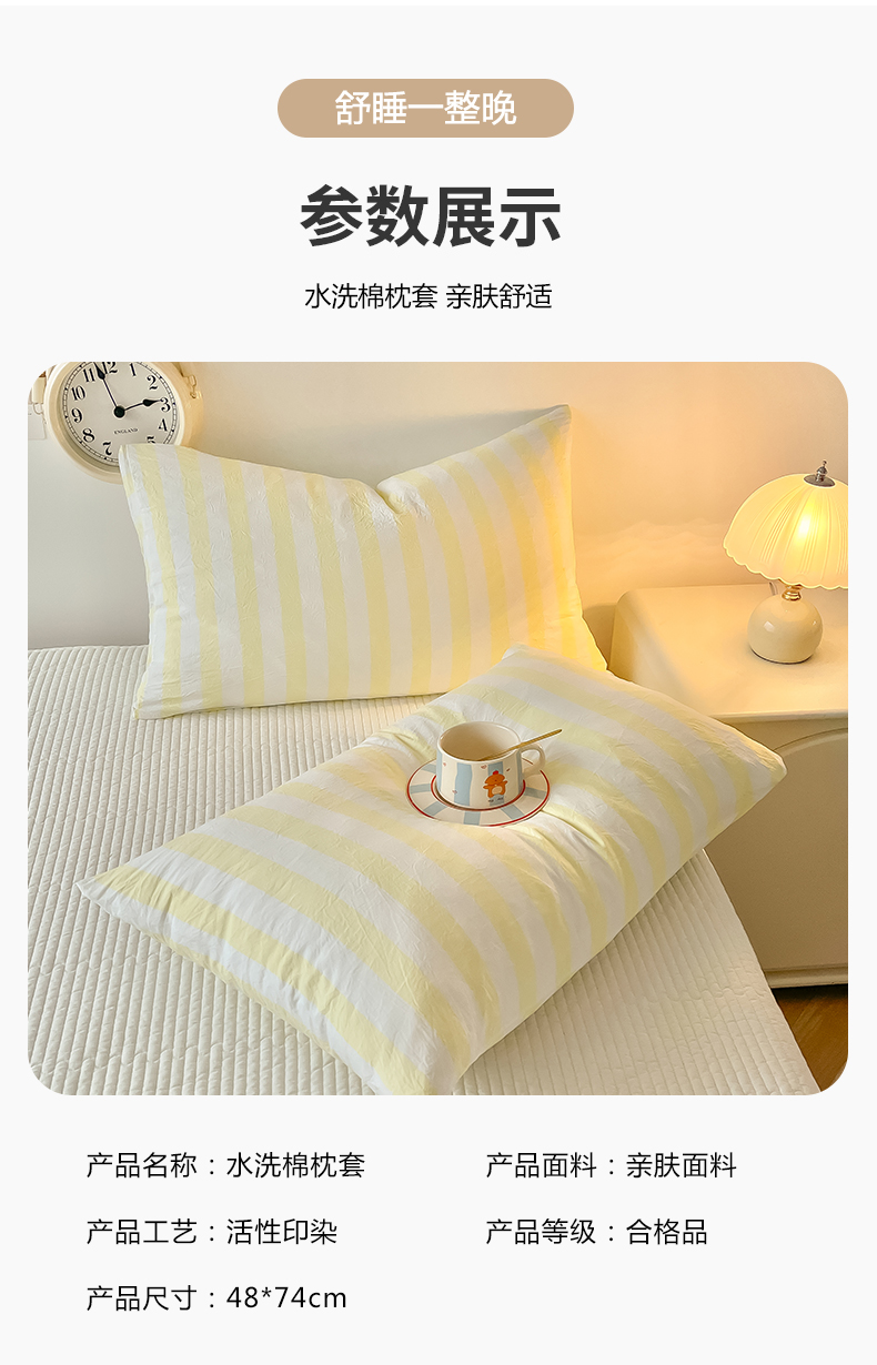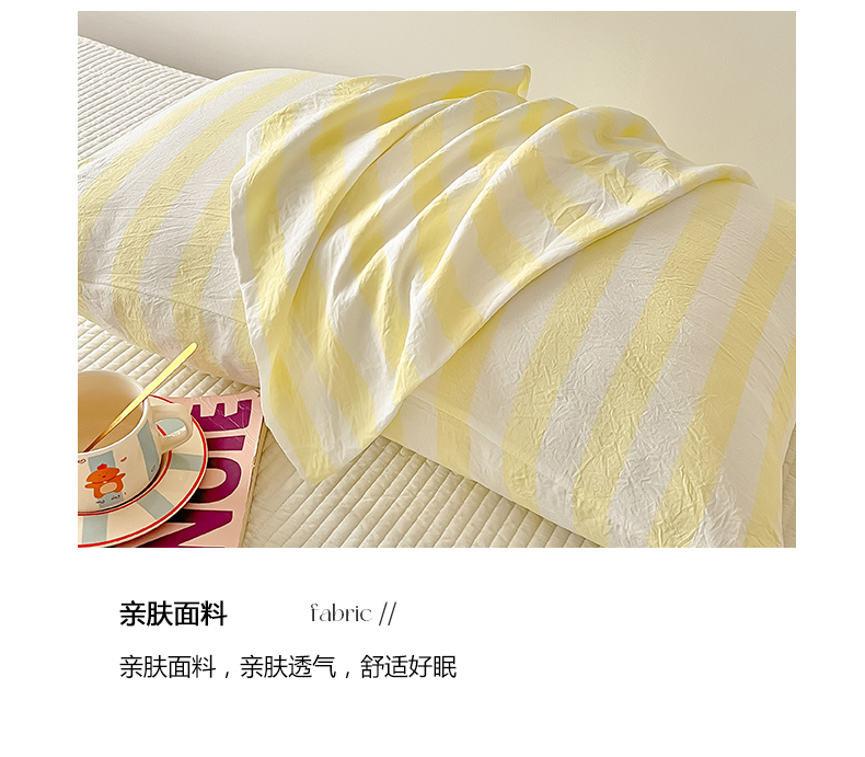 商品名称:爱彼家纺 2026新款条纹系列中条枕套一只一对装亲肤柔软-春夏新品 水洗棉条纹鹅黄