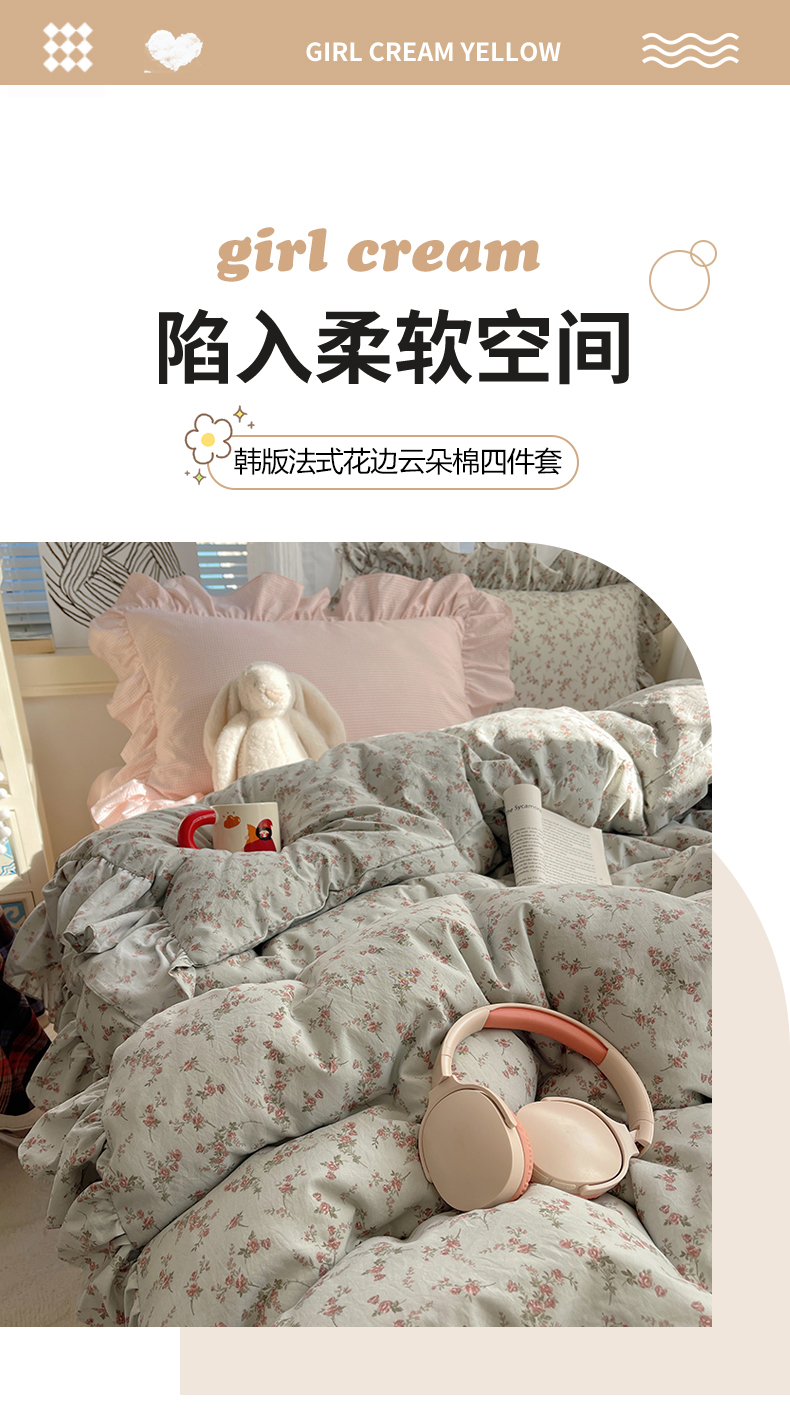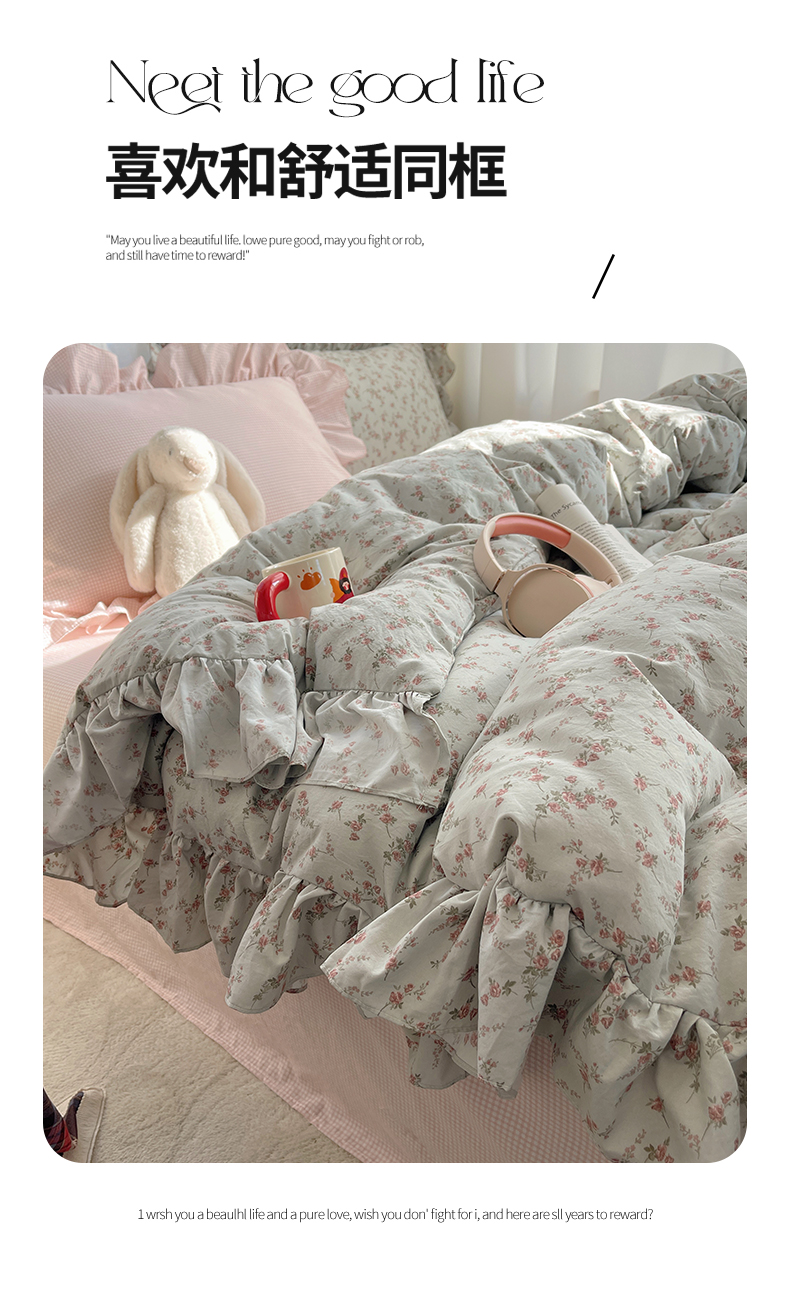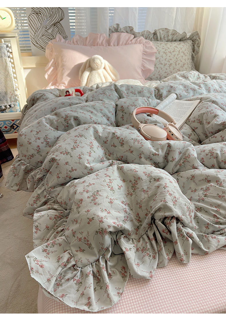 当前位置: 91家纺网 > 商品网购 > 床品套件 > 四件套 > 化纤普通四件套 > 三朵家纺 2026新款A类云柔水洗棉韩版法式花边云朵棉四件套 惜花灰绿