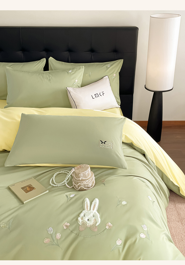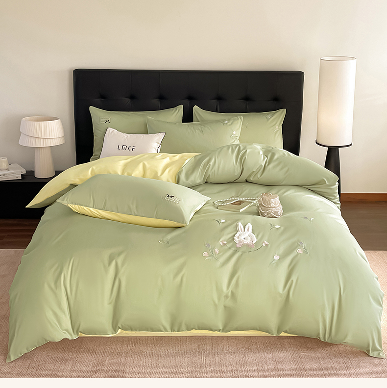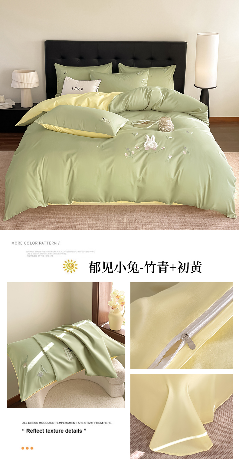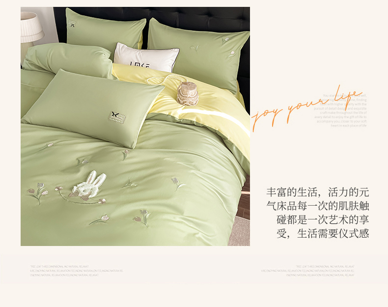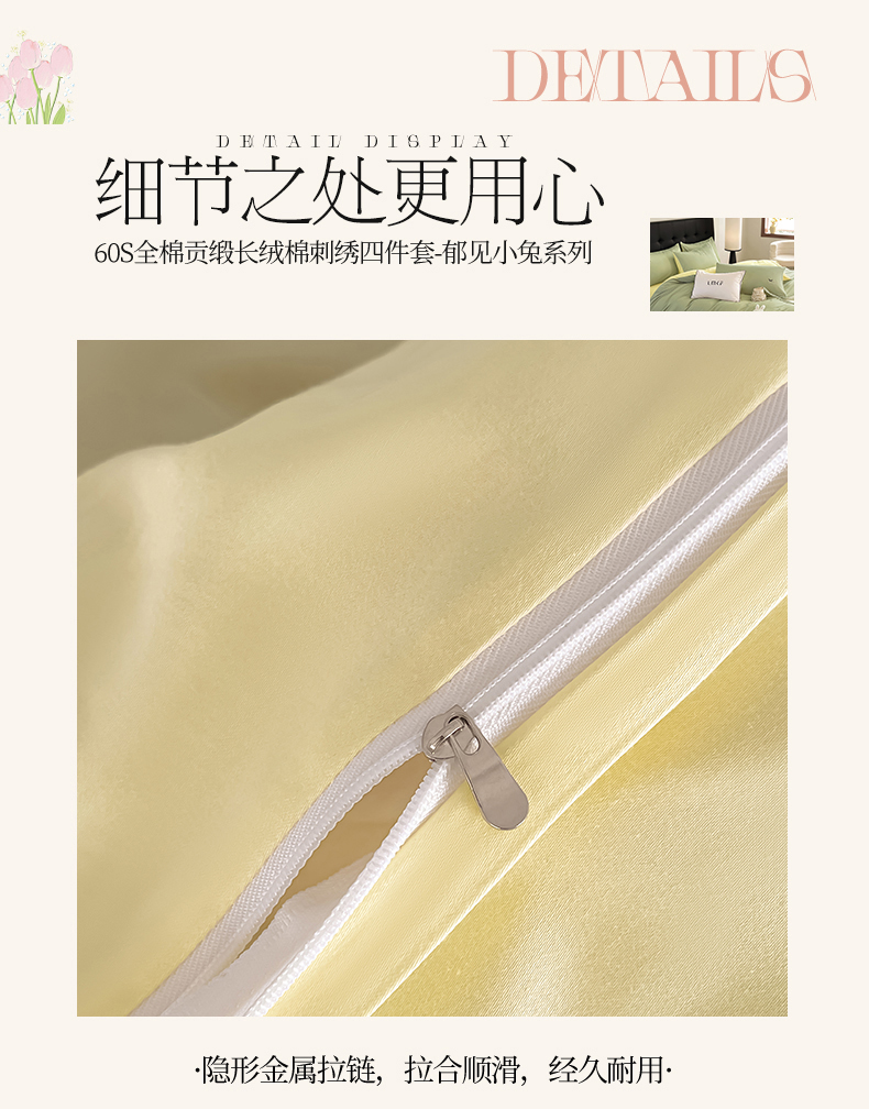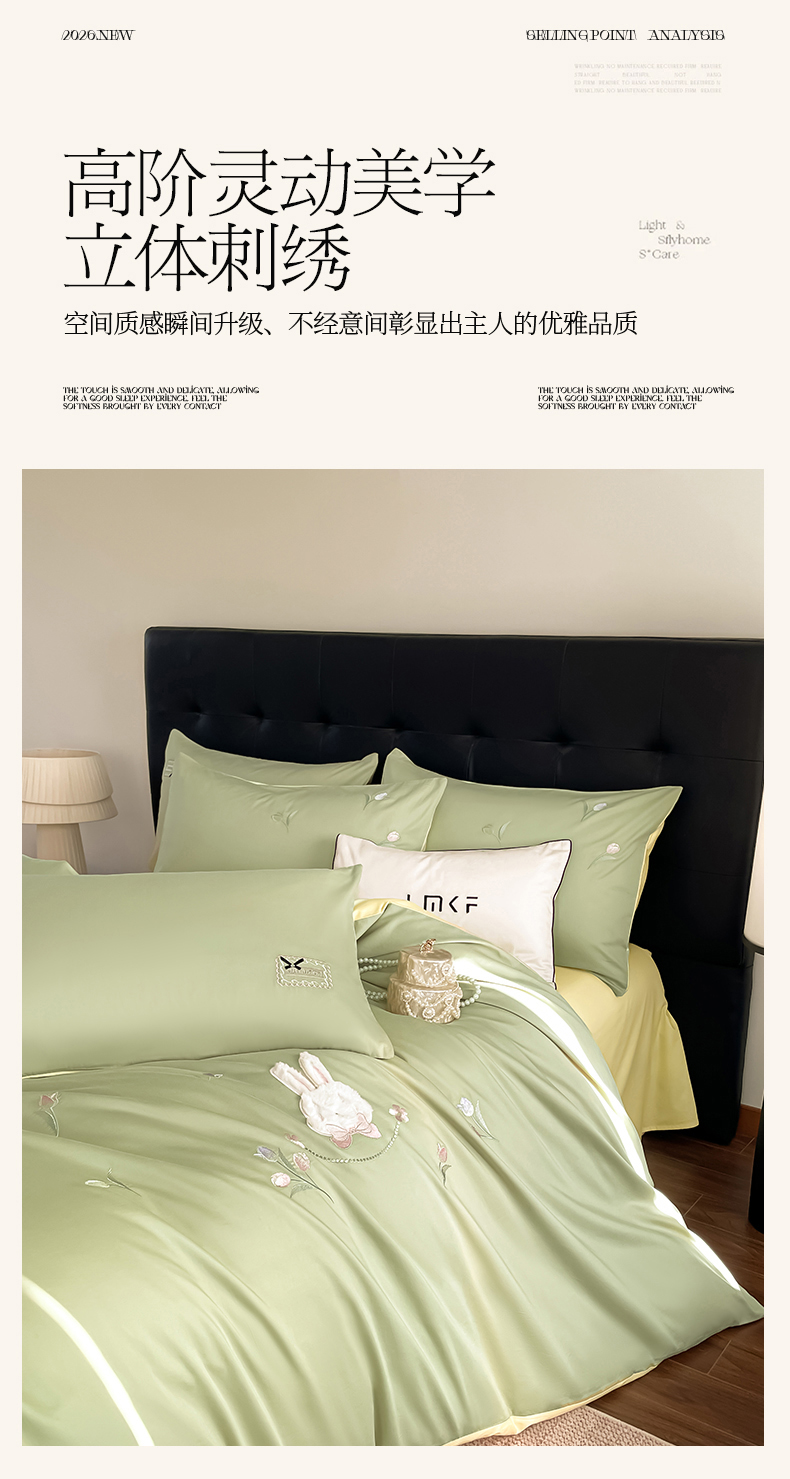 当前位置: 91家纺网 > 商品网购 > 床品套件 > 四件套 > 长绒棉四件套 > 蓝米卡夫 2026春季新款-60S长绒棉贡缎刺绣系列四件套-郁见小兔(礼盒) 郁见小兔-竹青+初黄