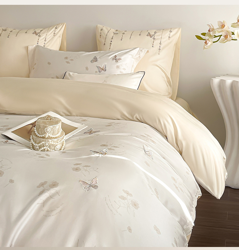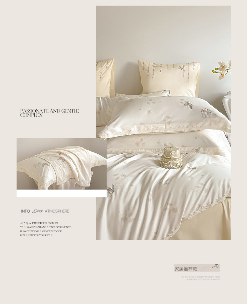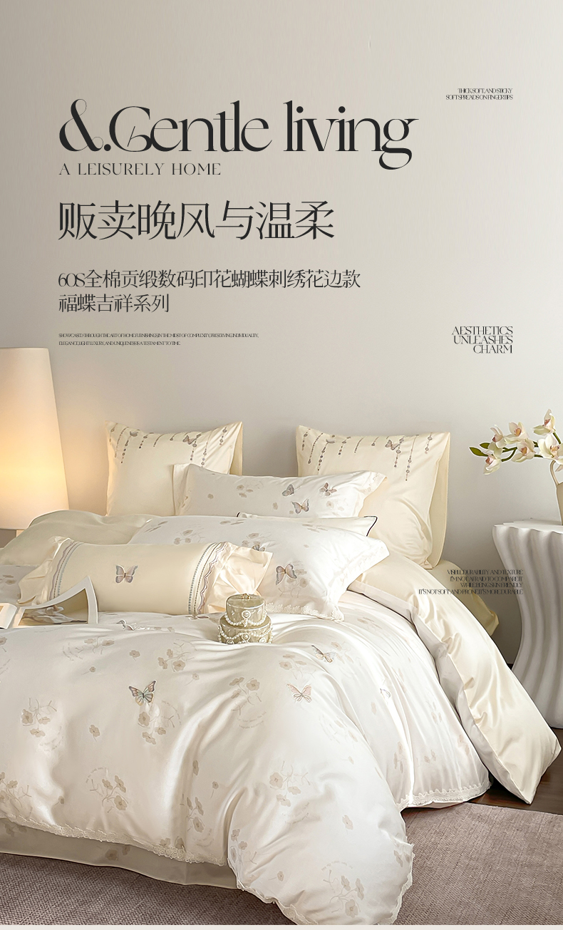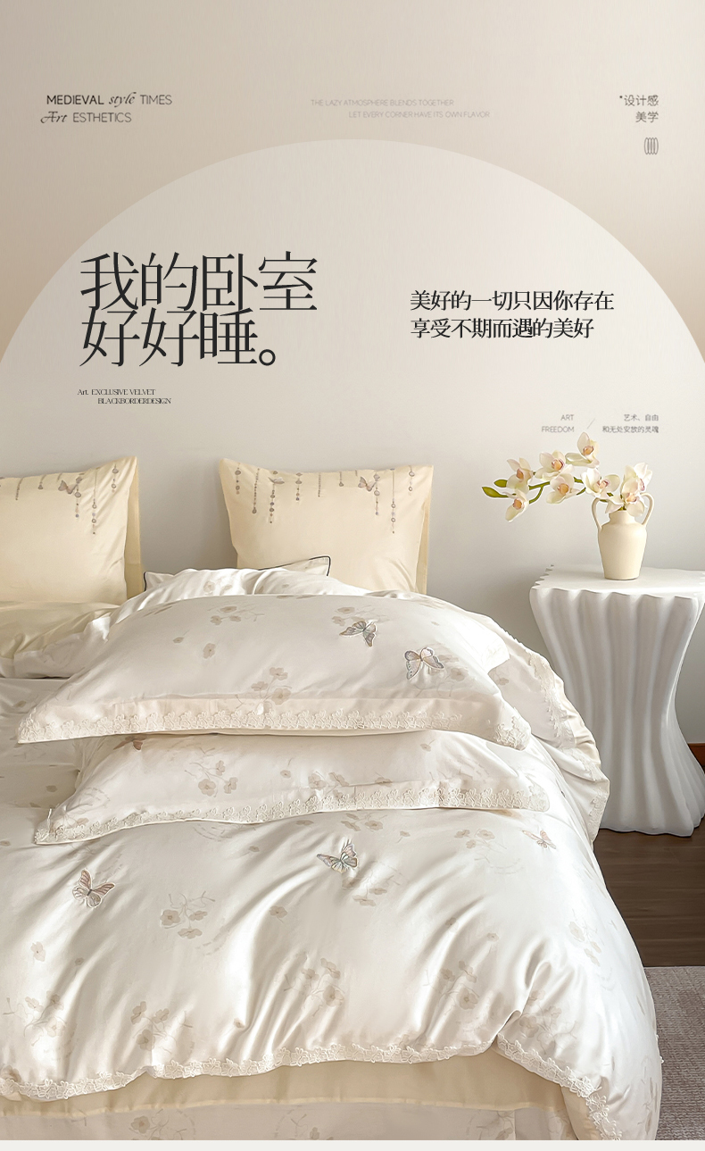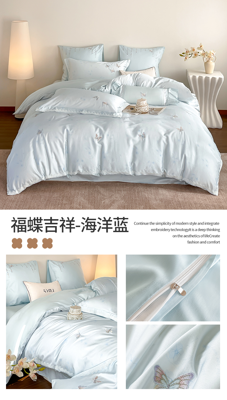 (总)蓝米卡夫 2026春季新款-60S长绒棉贡缎蝴蝶刺绣花边系列四件套-福蝶吉祥(礼盒)-拍摄风格2,福蝶吉祥-大地色,福蝶吉祥-海洋蓝,福蝶吉祥-优雅粉