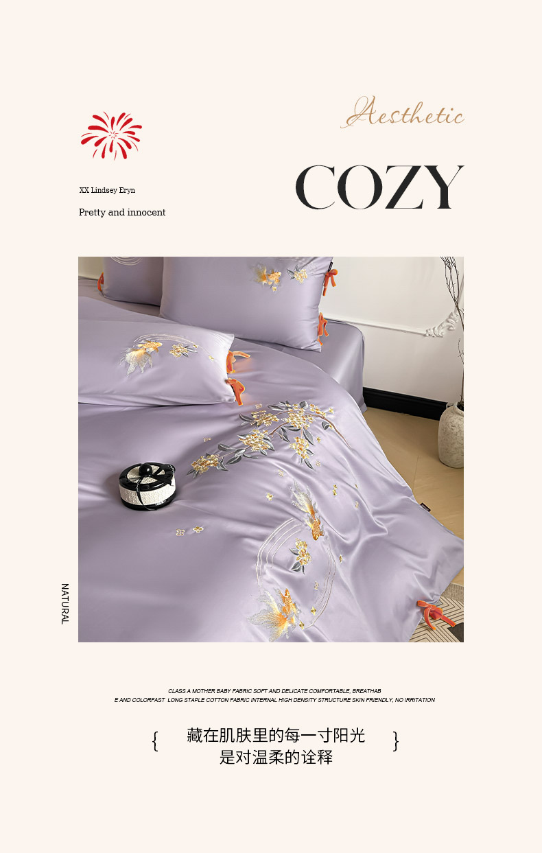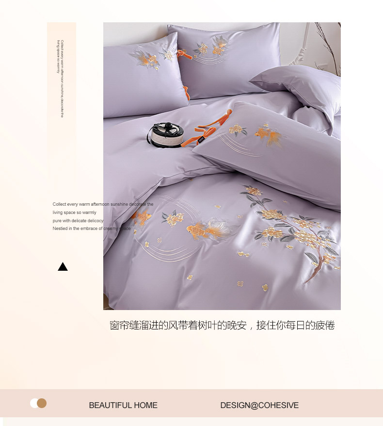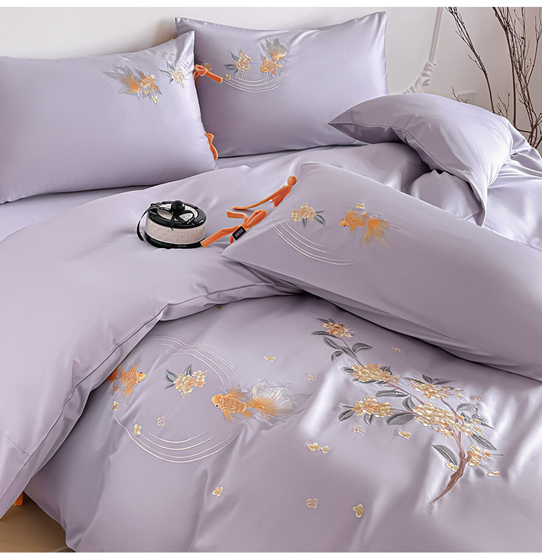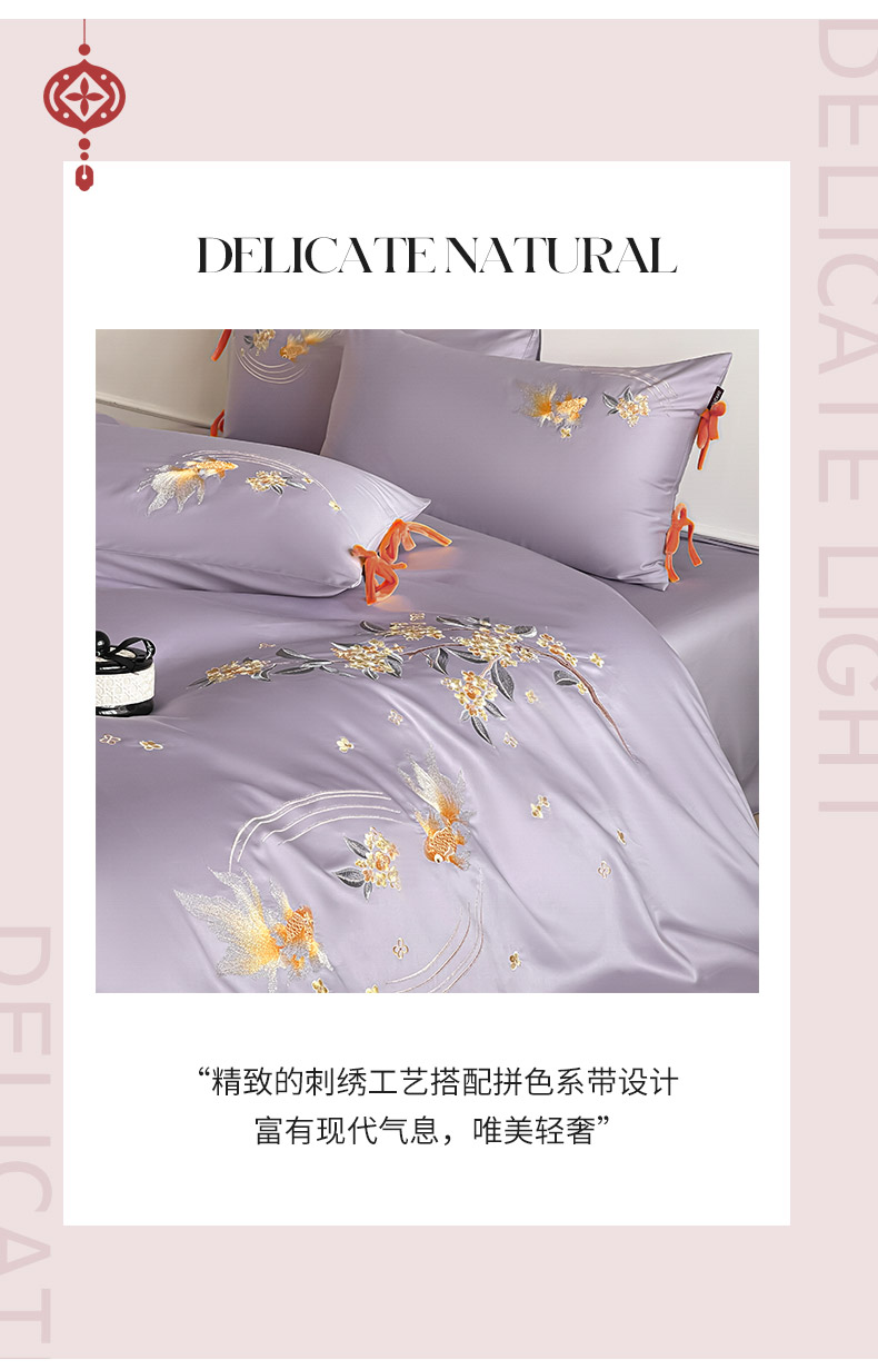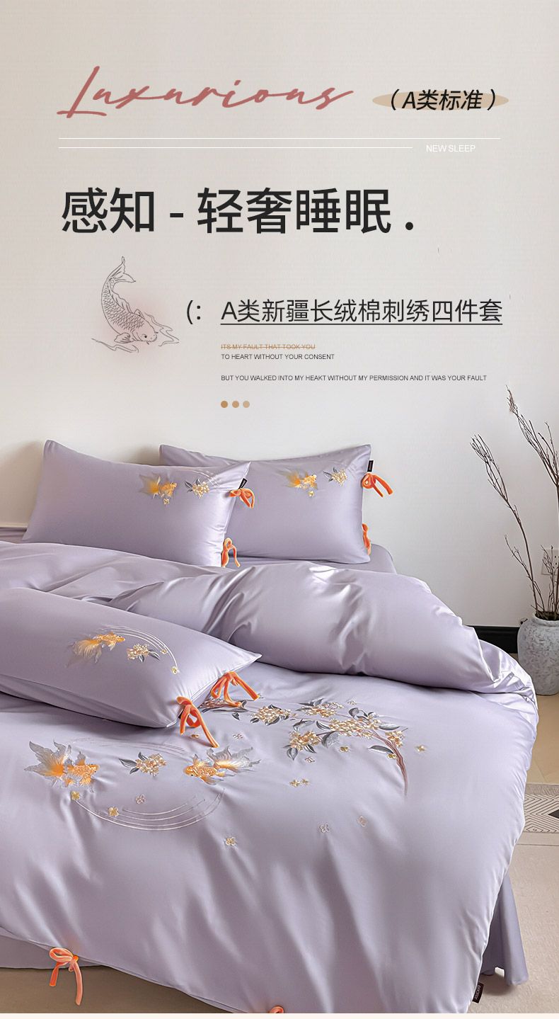 • 91家纺网 家纺一手货源 找家纺  2026新款50S双股A类长绒棉纯棉四件套全棉喜庆刺绣被套床单床笠-福瑞锦鲤 福瑞锦鲤-紫