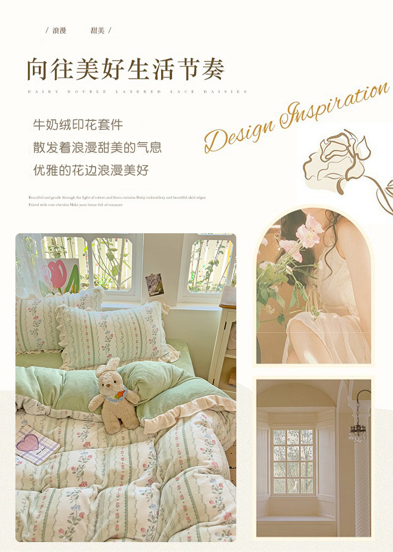 迪梦姿家纺 2025新款牛奶绒印花花边款四件套 曼林绿