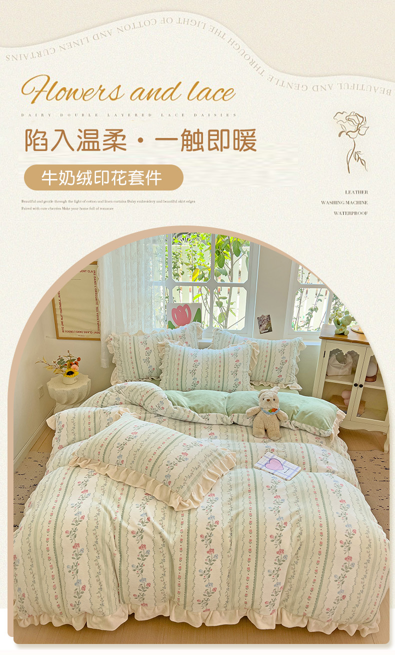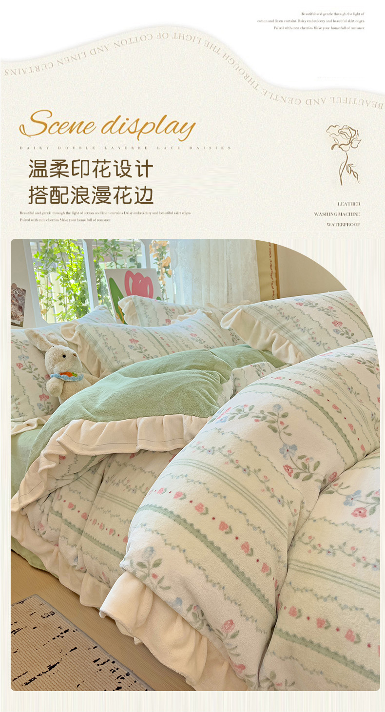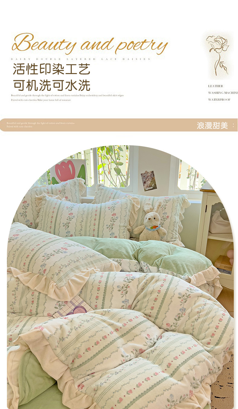 商品名称:迪梦姿家纺 2025新款牛奶绒印花花边款四件套 曼林绿