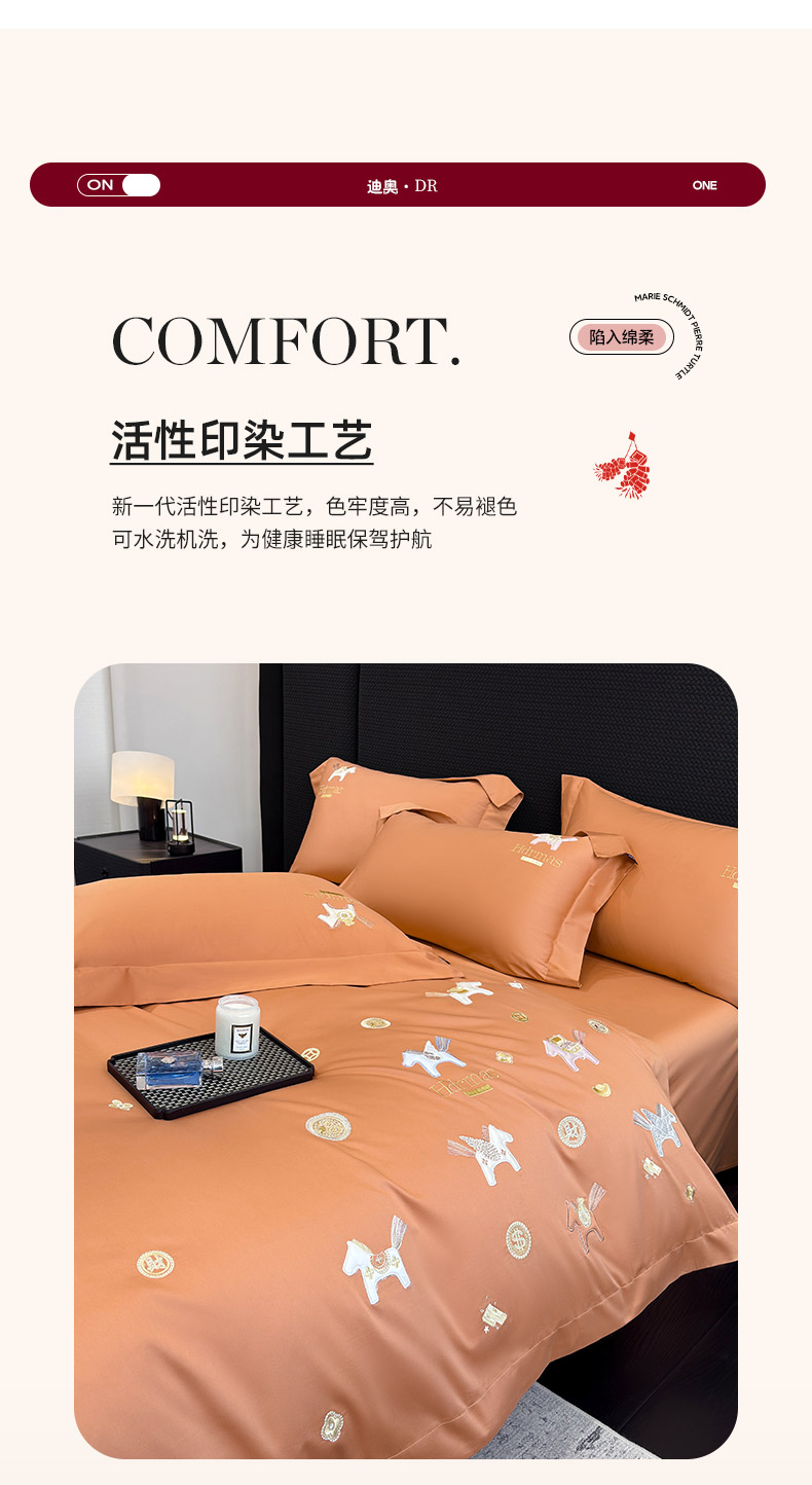 2026新款【迪奥】马年50S双股A类长绒棉纯棉四件套100全棉新年刺绣被套床单 马上有钱-橙