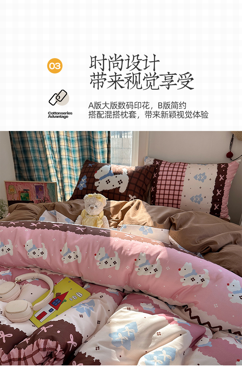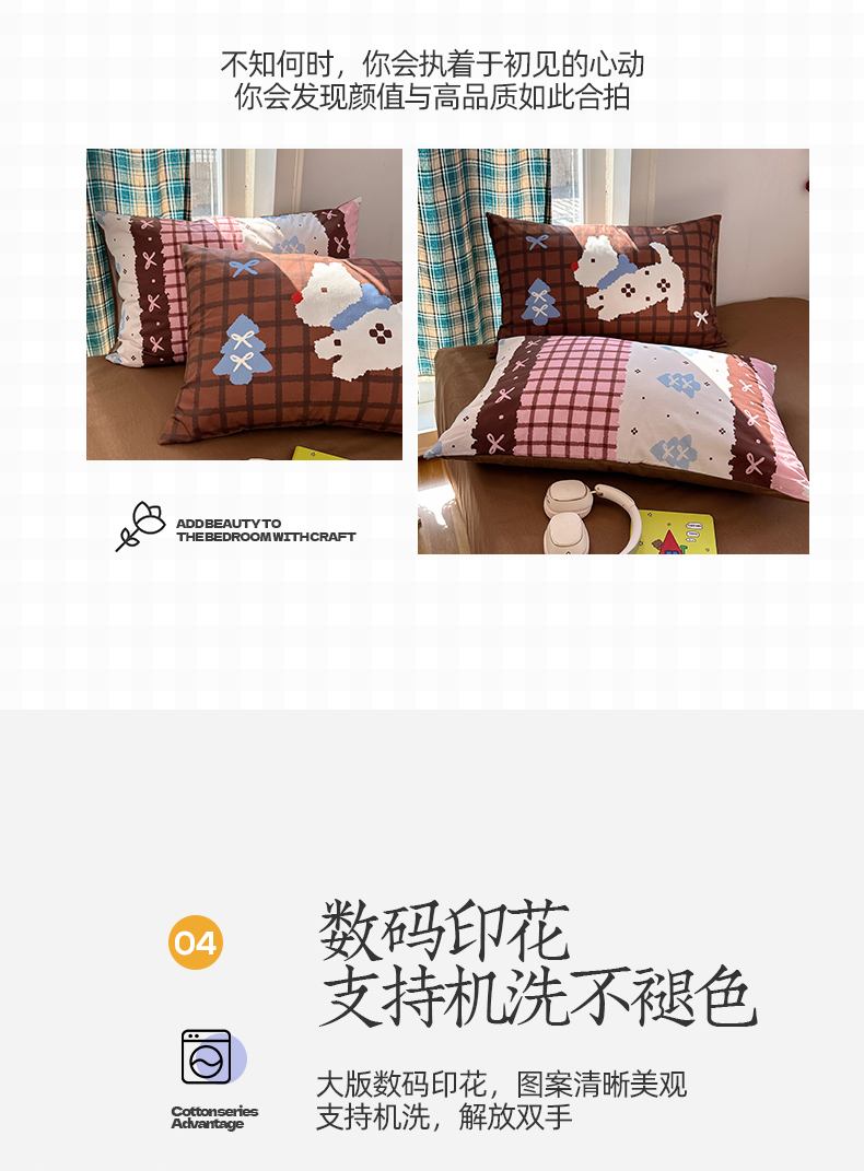 商品名称:桃子家居 2026新款纯棉混搭大版数码印花枕套小清新猫咪可爱系列四件套 棉混搭-甜美童话狗