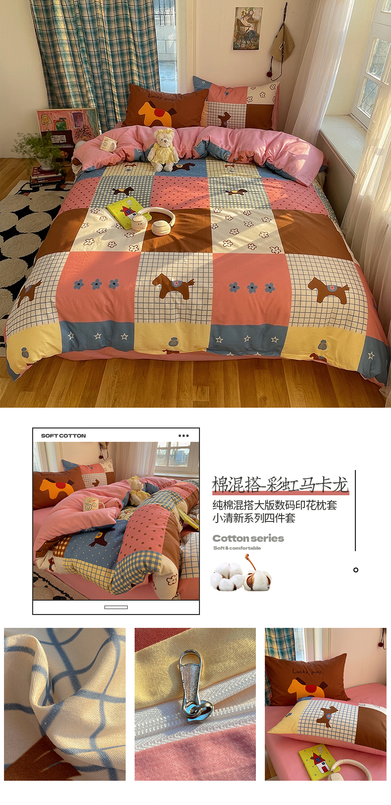 (总)桃子家居 2026新款纯棉混搭大版数码印花枕套小清新猫咪可爱系列四件套,棉混搭-彩虹马卡龙,棉混搭-红格幸运星,棉混搭-可可布丁猫,棉混搭-梦幻森林马,棉混搭-奶糖可可猫,棉混搭-苹果哈曼猫,棉混搭-甜美童话狗,棉混搭-甜心软糖猫