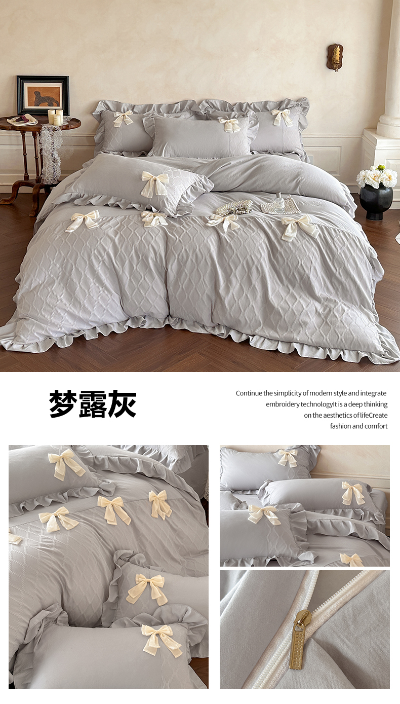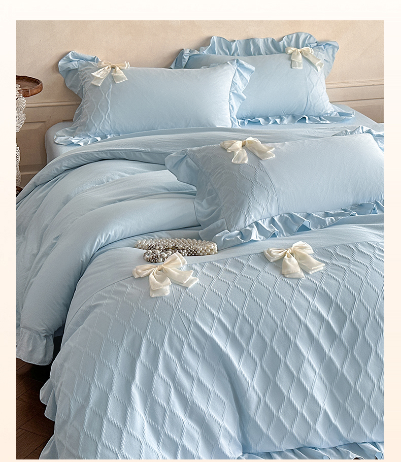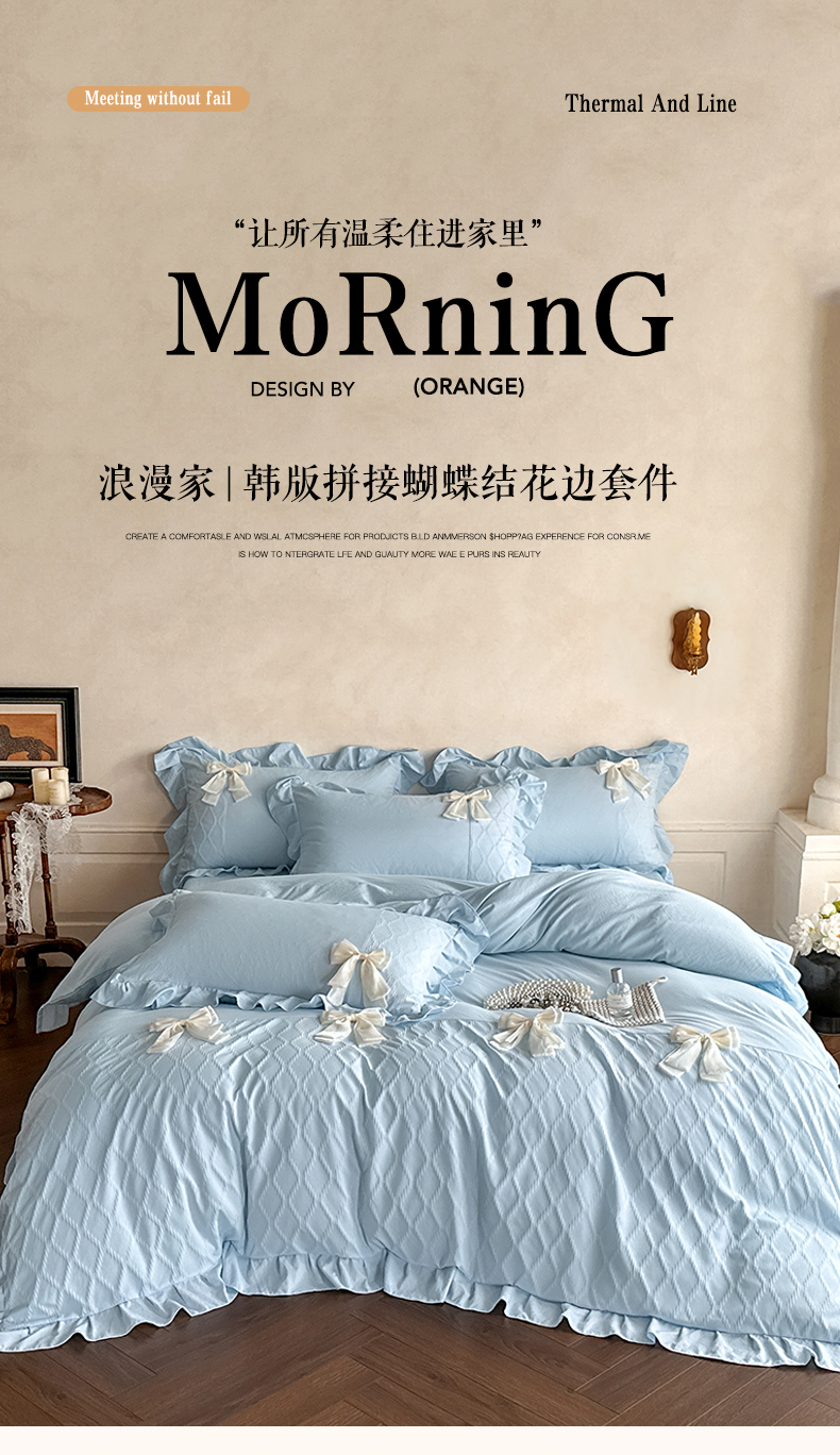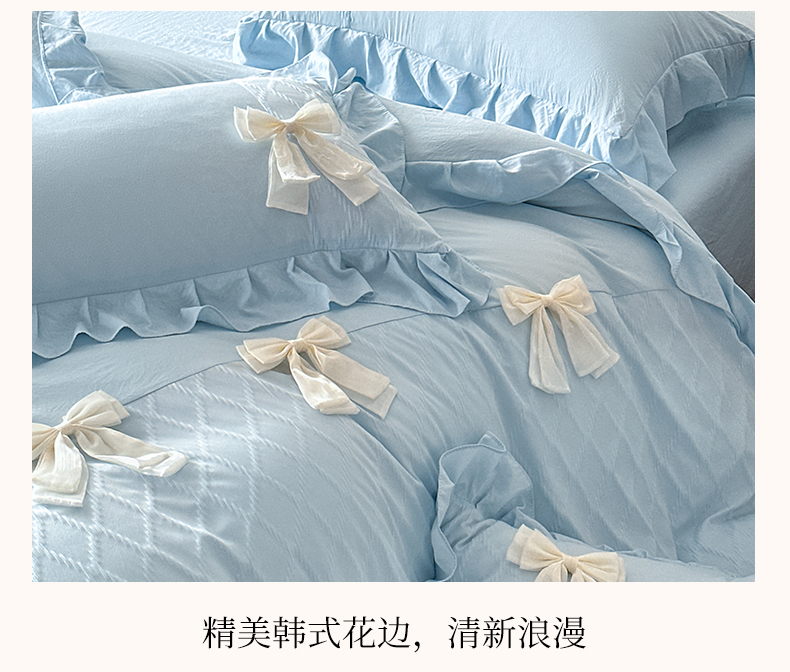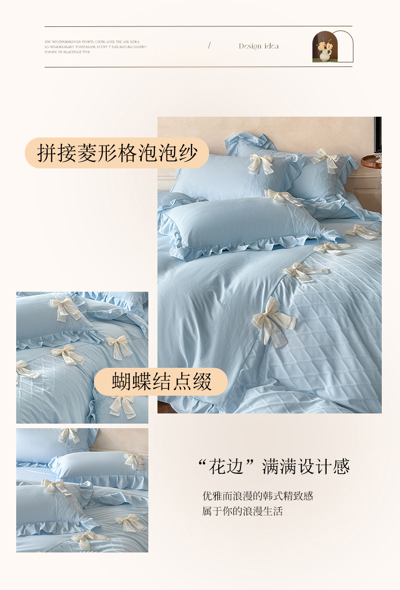 当前位置: 91家纺网 > 商品网购 > 床品套件 > 四件套 > 水洗棉四件套 > 你好美丽 2026春夏新款水洗棉拼接泡泡纱蝴蝶结花边工艺款四件套 -梦露 梦露兰