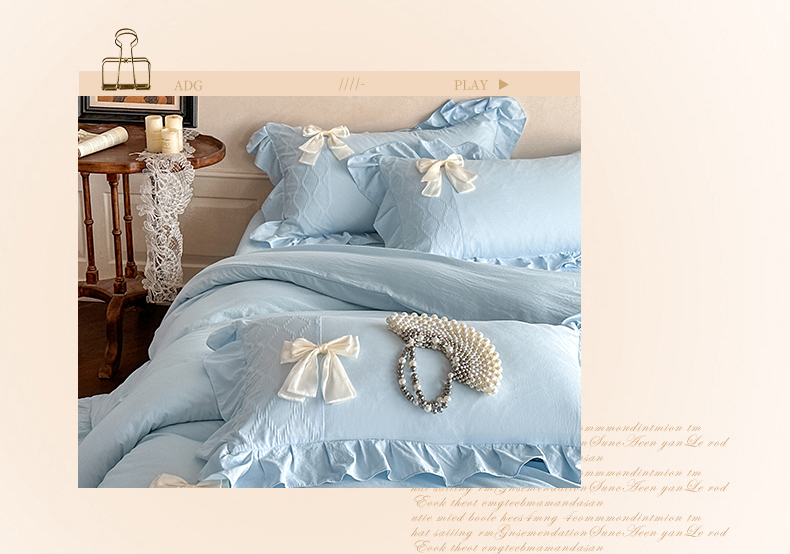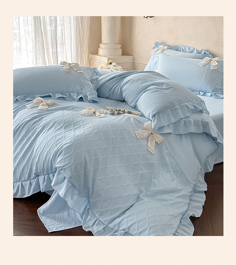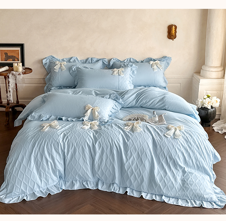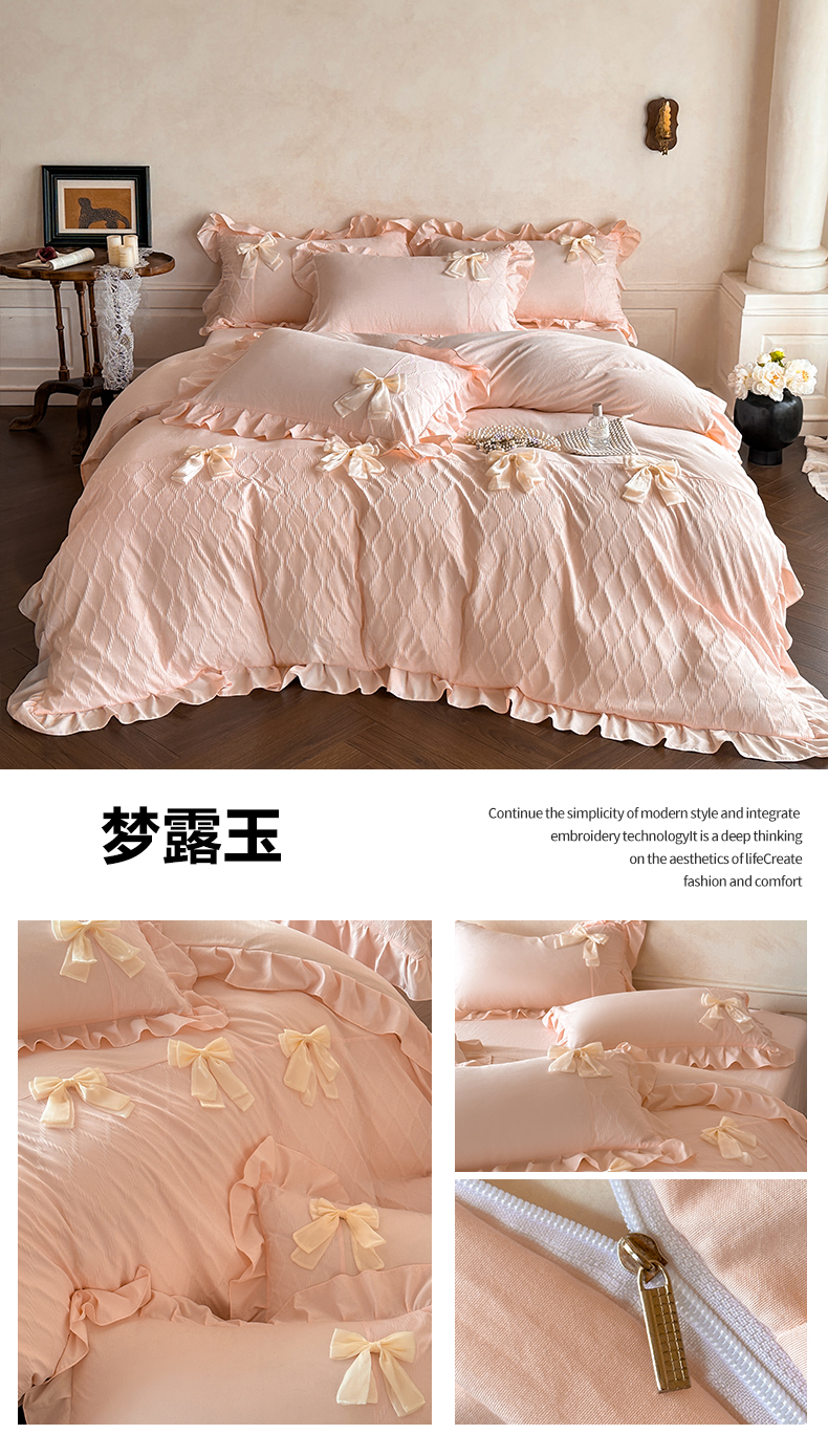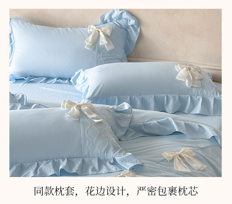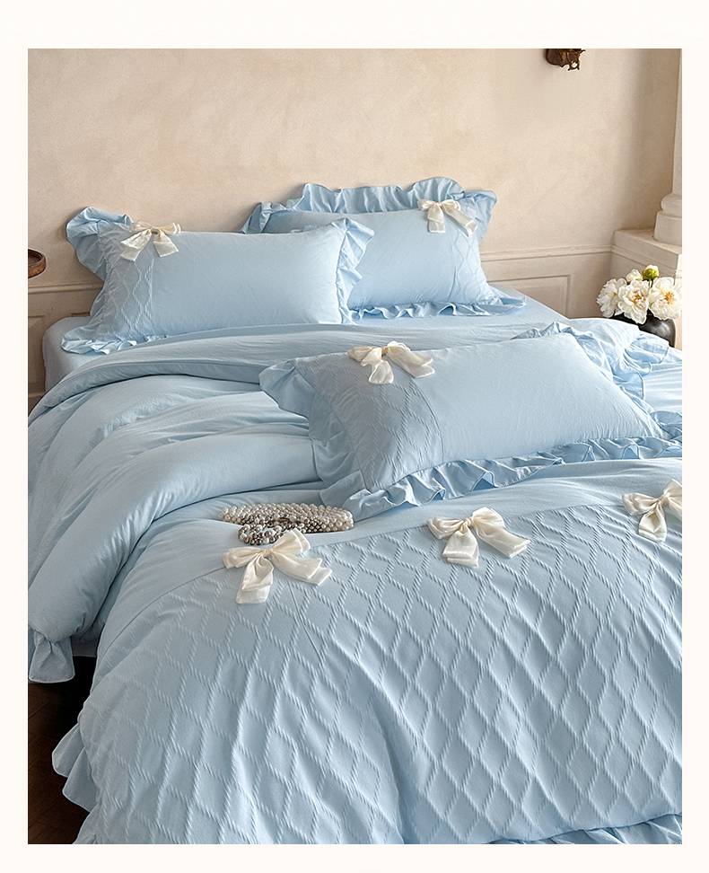 当前位置: 91家纺网 > 商品网购 > 床品套件 > 四件套 > 水洗棉四件套 > 你好美丽 2026春夏新款水洗棉拼接泡泡纱蝴蝶结花边工艺款四件套 -梦露 梦露兰