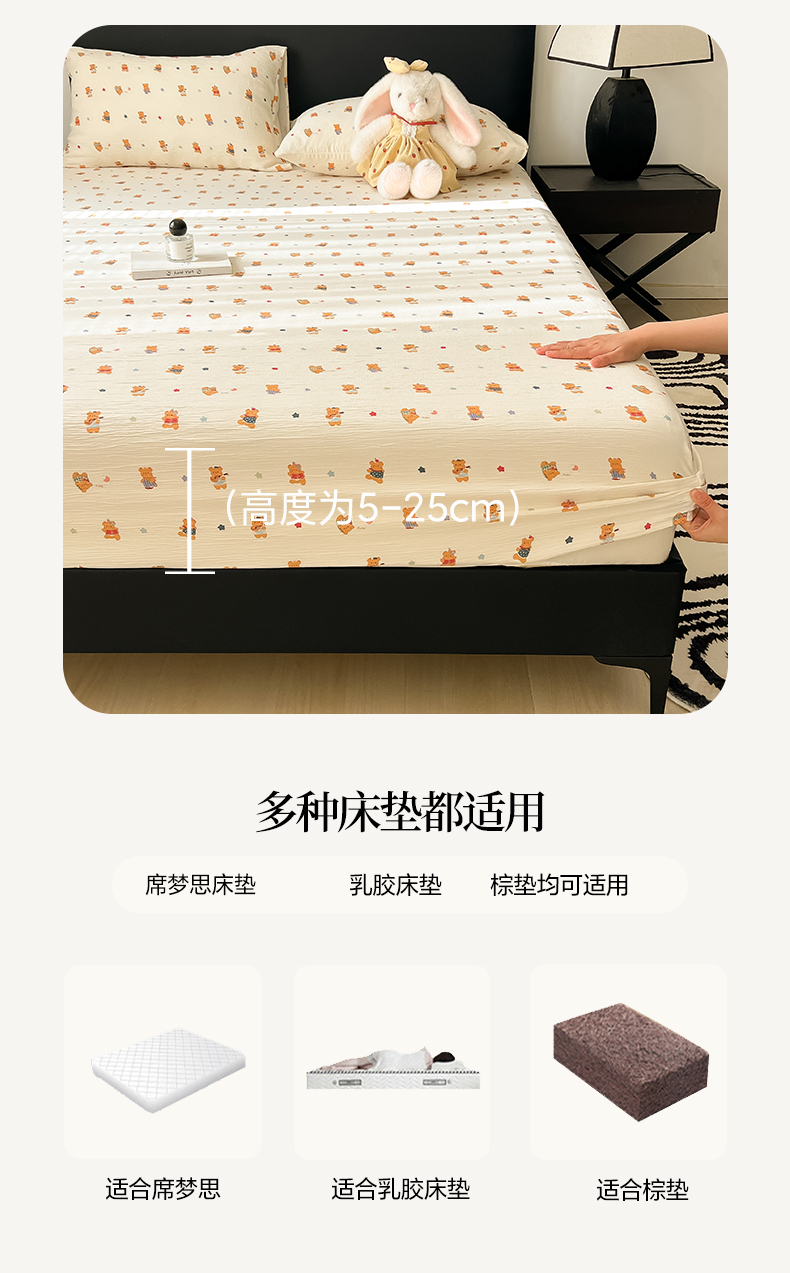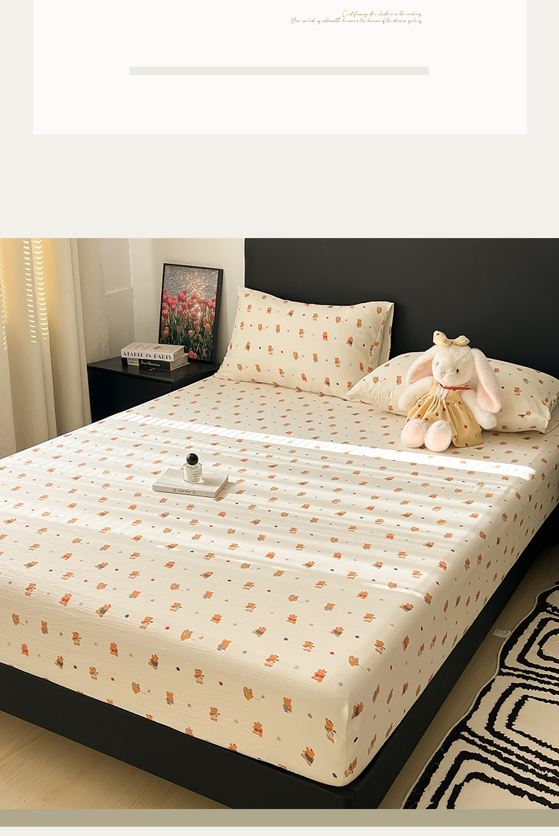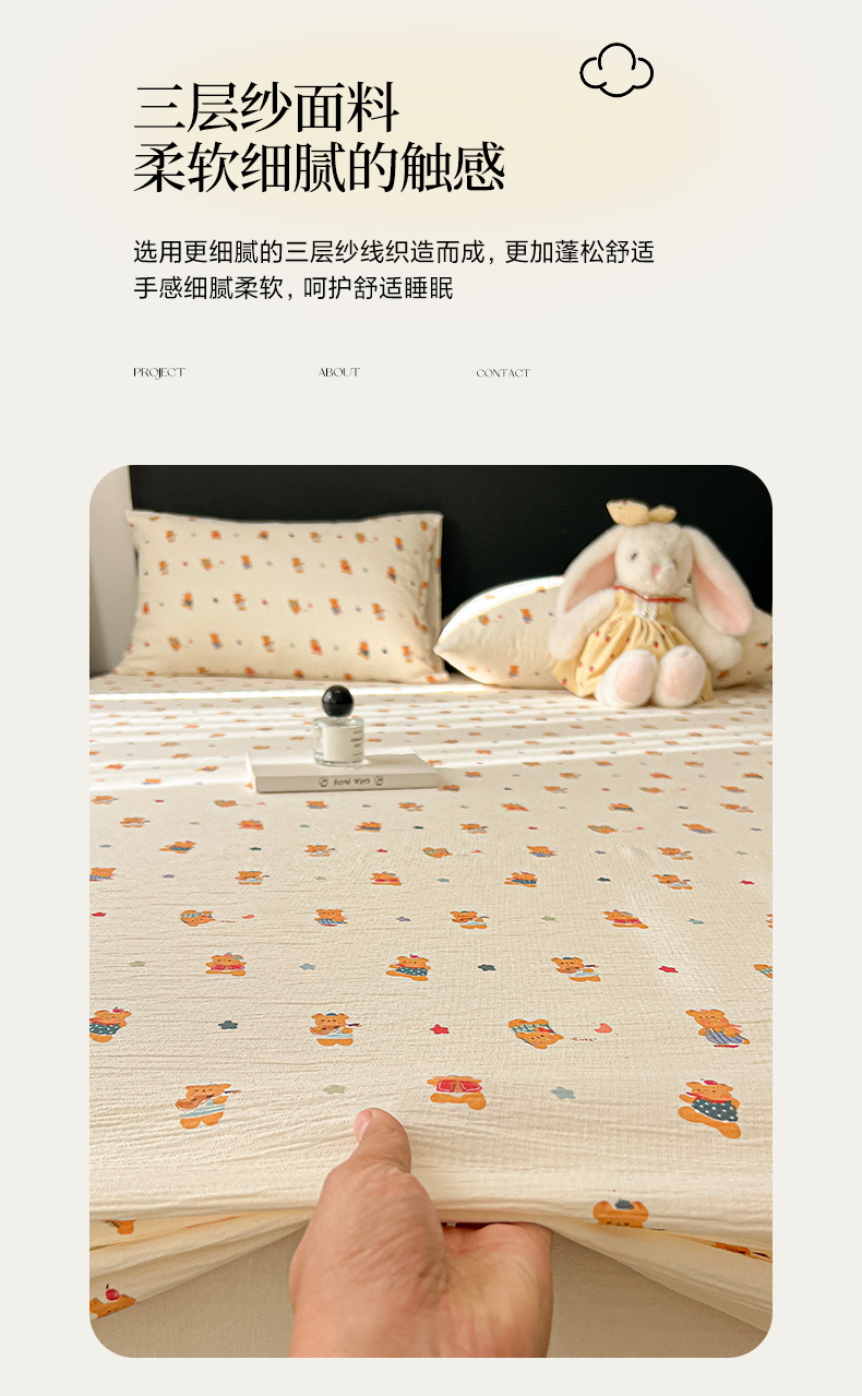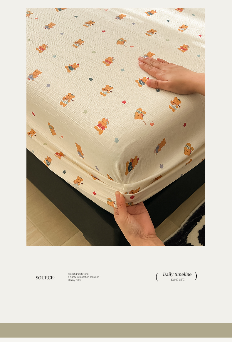 • 91家纺网 家纺一手货源 找家纺 韩巢家纺 2026新款三层纱单床笠热销款防滑床笠单件 红茶小熊