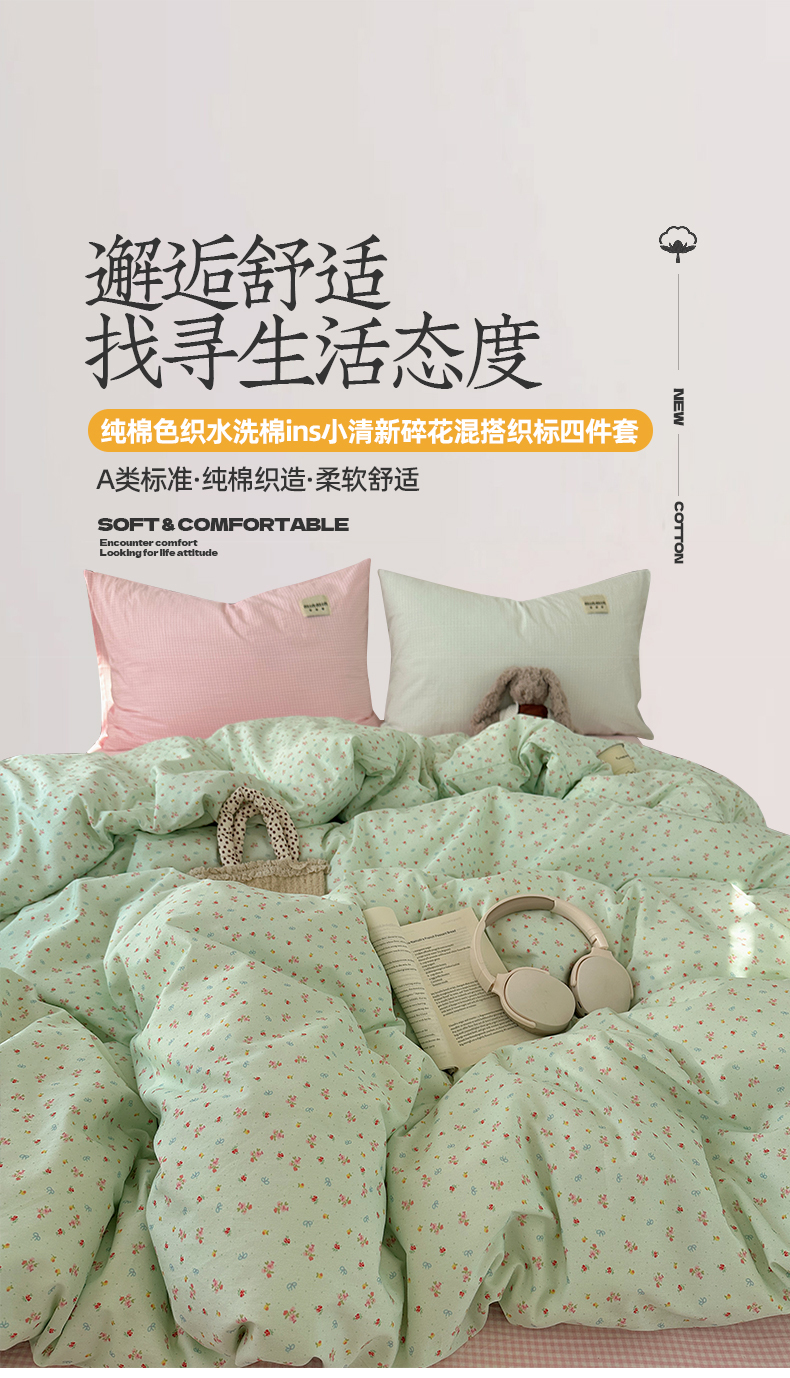 桃子家居 2026新款A类纯棉水洗棉ins韩系小清新碎花混搭织标工艺色织水洗棉四件套系列 水洗棉-青雾春日