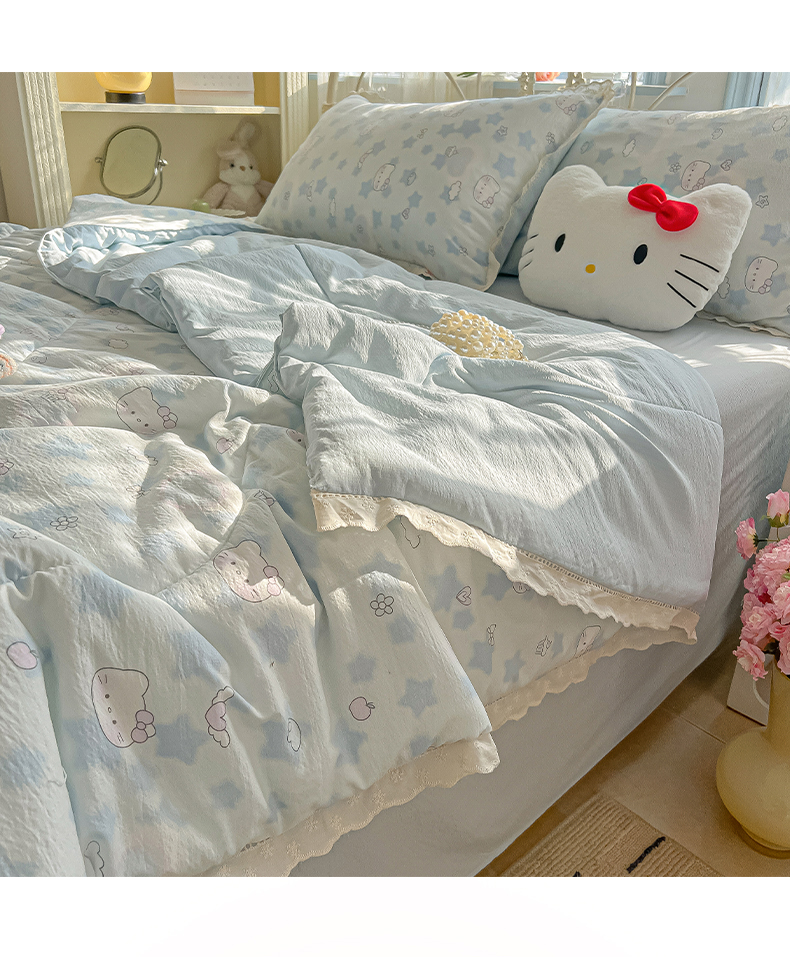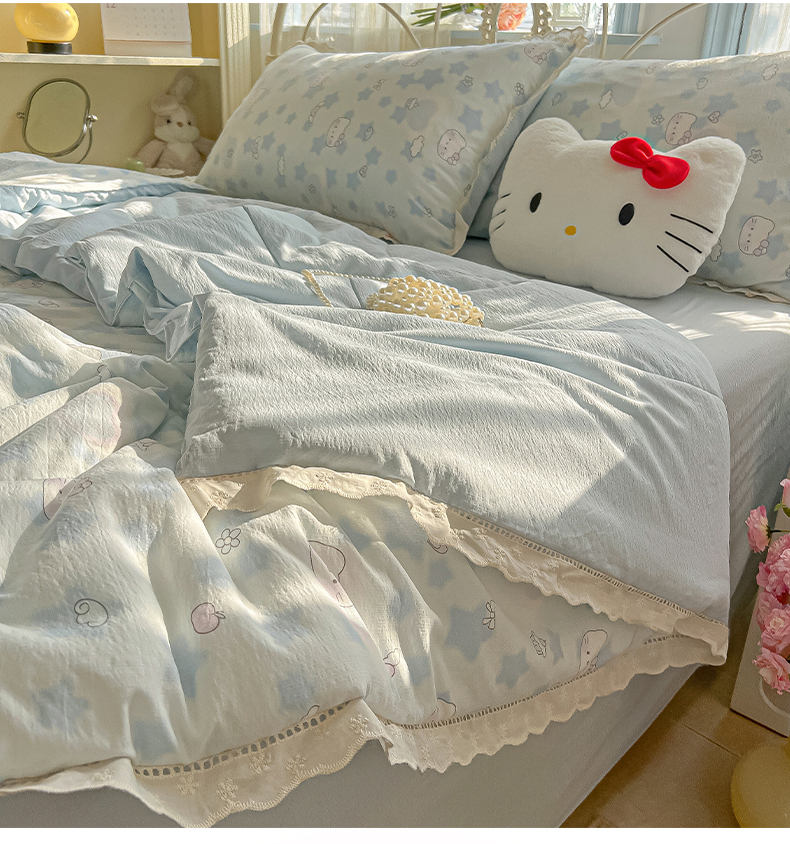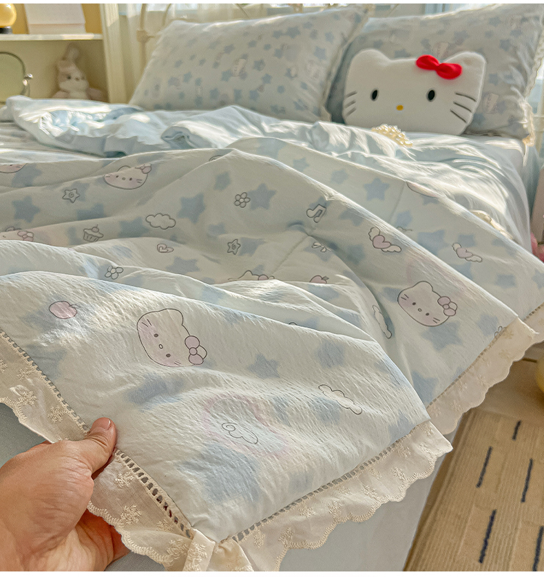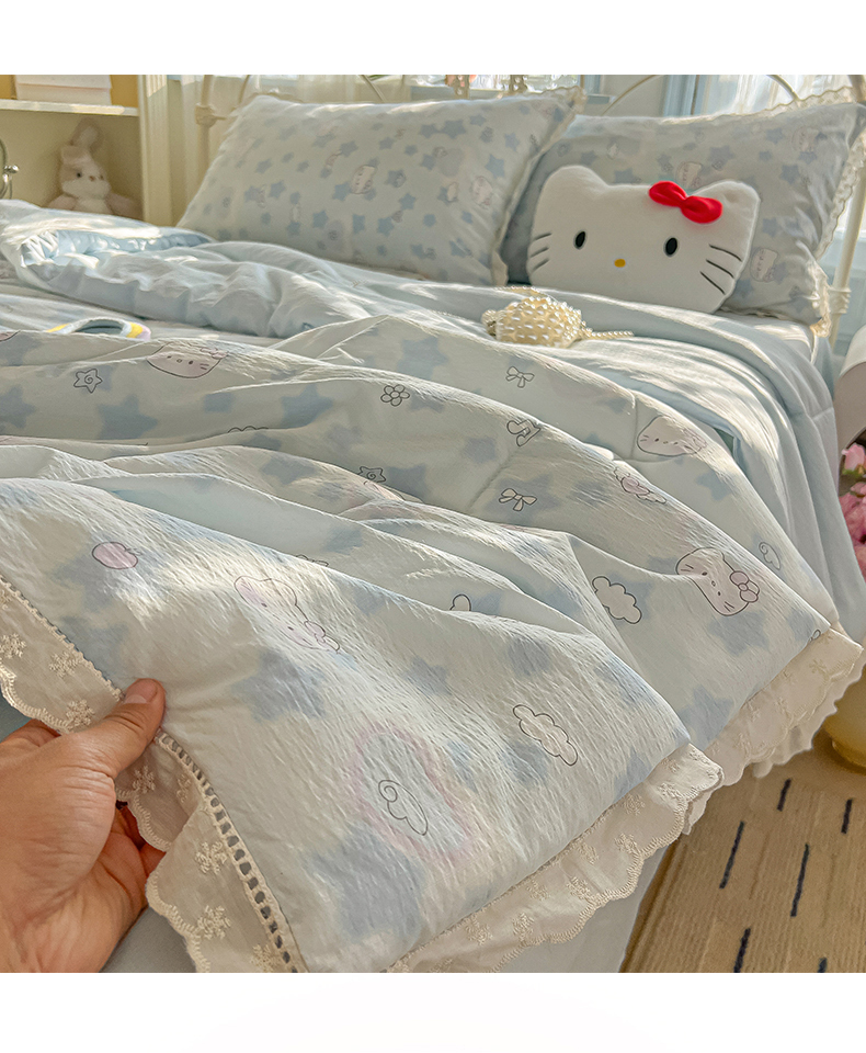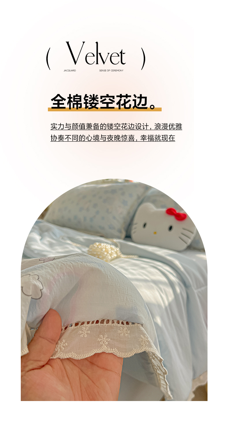 商品名称:罗亿家纺 2026新款全棉镂空花边云感双层纱夏被四件套 小猫数星星