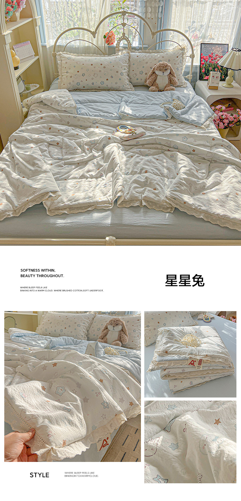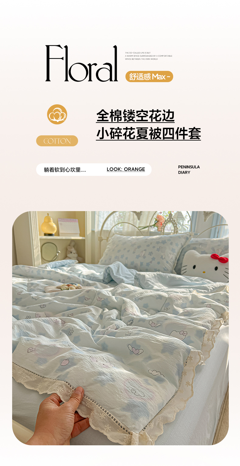 (总)罗亿家纺 2026新款全棉镂空花边云感双层纱夏被四件套,春日限定,点点小狗,海盐甜心,韩范小猫,赫本小姐,花花腊肠狗,花漾kitty,花与兔,简夏,蓝蓝小奶狗,蓝萱,蔷薇絮,萄气满满,小粉兔,小猫数星星,星星兔,薰衣草,枝蔓,kitty甜梦窝,组合图仅展示